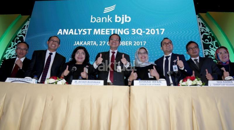 Direktur Utama bank bjb Ahmad Irfan (tengah) didampingi jajaran direksi dan komisaris mengacungkan jempol usai memaparkan kinerja perusahaan di Jakarta, Jumat (27/10). PT Bank Pembangunan Daerah Jawa Barat dan Banten Tbk. (IDX: BJBR) mencatat total aset sebesar Rp114,2 triliun atau tumbuh 12,5 persen year on year (y-o-y) hingga triwulan III tahun 2017. AKTUAL/Tino Oktaviano