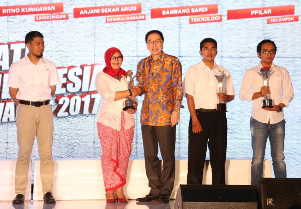 Presiden Direktur PT Astra International Tbk Prijono Sugiarto menyerahkan piala kepada Anjani Sekar Arum yang juga menjadi penerima apresiasi favorit pilihan publik pada acara Apresiasi Untuk Anak Bangsa SATU Indonesia Awards 2017 di Jakarta, Rabu (18/10). Setiap penerima apresiasi SATU Indonesia Awards 2017 mendapatkan dana pengembangan kegiatan Rp 60 juta sesuai dengan peringatan HUT ke-60 Astra pada tahun ini dan penerima apresiasi favorit mendapatkan tambahan Rp 10 juta. AKTUAL/Hunas Astra