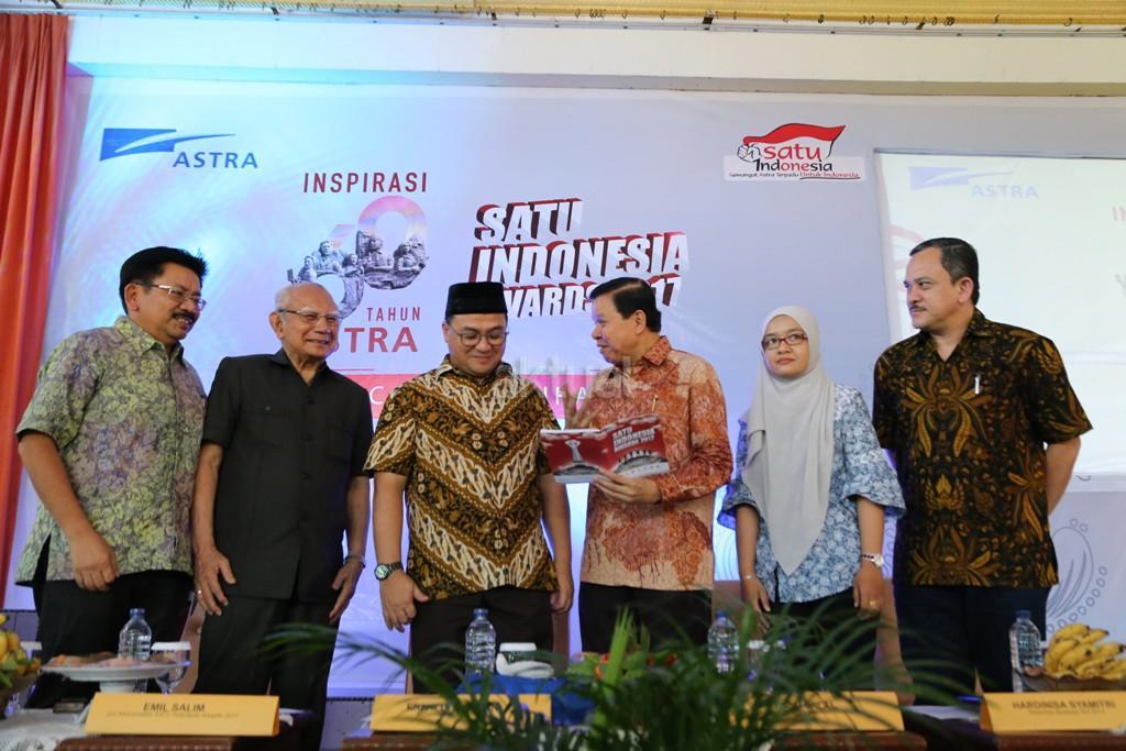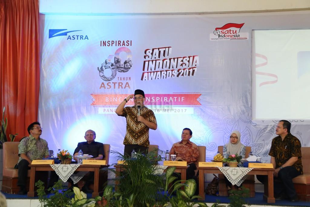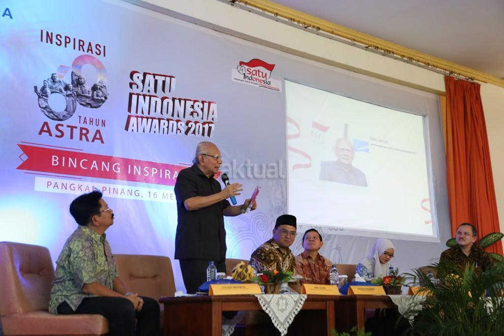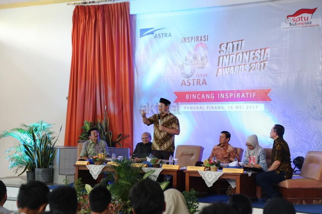Gubernur Kepulauan Bangka Belitung Erzaldi Rosman (berdiri) yang baru menjabat selama dua hari sedang menyemangati seluruh peserta Bincang Inspiratif SATU Indonesia Awards 2017 didampingi Dosen Ilmu Lingkungan Pasca Sarjana Universitas Indonesia Emil Salim (kedua kiri) dan Wakil Menteri Pendidikan Nasional RI 2010-2012 Fasli Jalal (ketiga kanan) yang keduanya merupakan Dewan Juri SATU Indonesia Awards, Penerima apresiasi SATU Indonesia Awards 2013 Hardinisa Syamitri (kedua kanan), Head of Environment & Social Responsibility PT Astra International Tbk Riza Deliansyah (kanan) serta Head of Public Relations PT Astra International Tbk Yulian Warman (kiri) di Pulau Bangka Provinsi Kepulauan Bangka Belitung (16/5). AKTUAL/HO