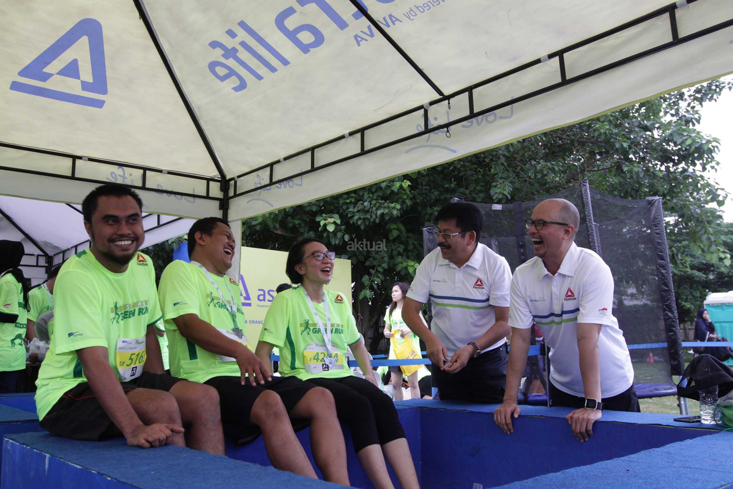Head of Public Relations PT Astra International, Tbk. Yulian Warman (kedua dari kanan) bersama Direktur PT. Astra Aviva Life (Astra Life) Luky Suardi (kanan) berbincang dengan peserta Astra Green Run 2016 di Jakarta, Minggu (16/10). Astra Life berikan perlindungan asuransi kepada 2650 peserta lomba lari Astra Green Run Jakarta 2016 yang mendapatkan sertifikat asuransi jiwa dan asuransi kecelakan.AGR merupakan kegiatan berlari dengan konsep ramah lingkungan yang dilaksanakan Astra dan bertujuan mengajak masyarakat untuk bergaya hidup sehat.