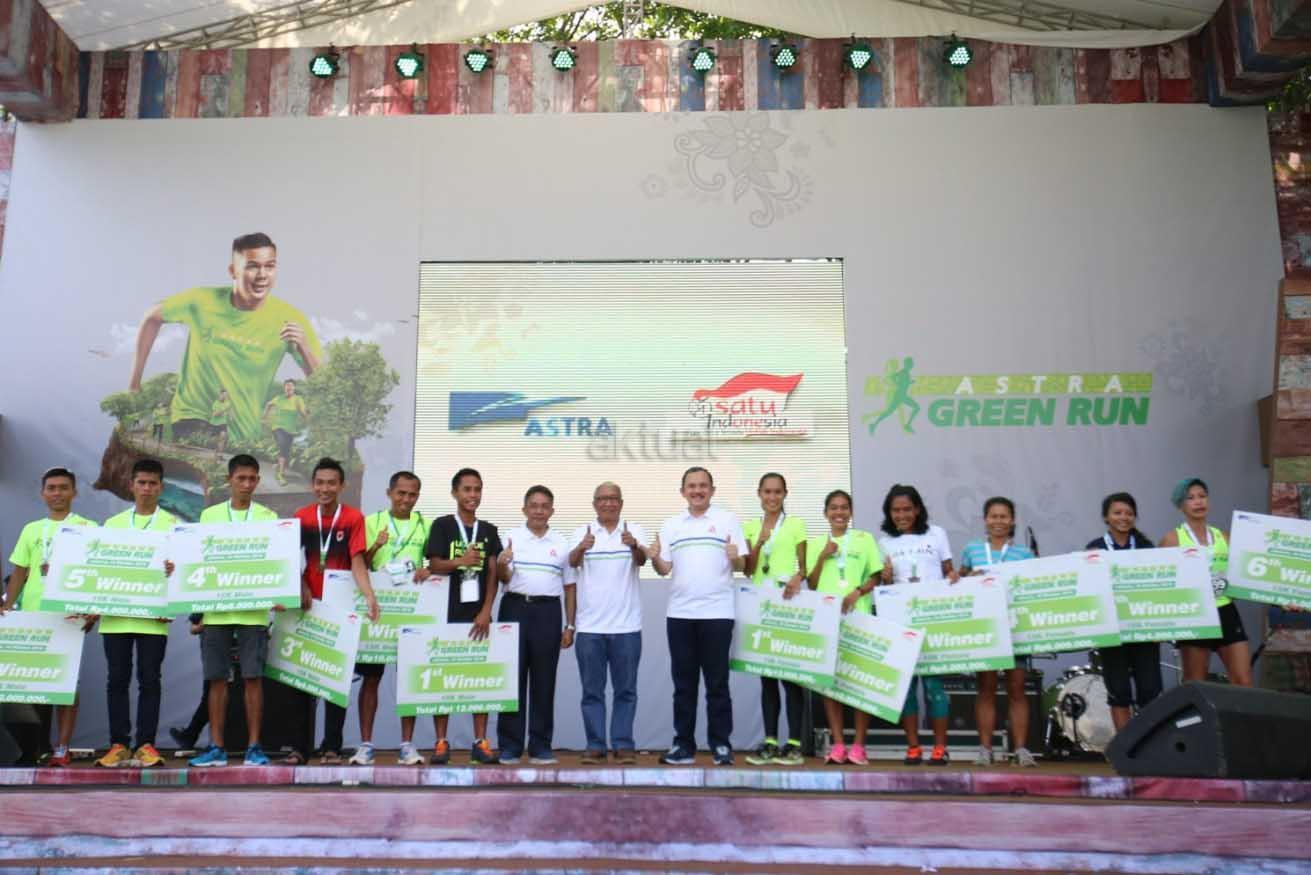 Dirjen Pengendalian Pencemaran & Kerusakan Lingkungan Hidup dan Kehutanan Kementerian Lingkungan Hidup & Kehutanan RI Karliansyah (tengah kiri) didampingi Chief of Corporate Communications, Social Responsibility & Security PT Astra International Tbk Pongki Pamungkas (tengah) dan Head of Environment & Social Responsibility Astra Riza Deliansyah (tengah kanan) bersama para pemenang lomba lari Astra Green Run (AGR) Jakarta 2016 (16/10).AGR merupakan kegiatan berlari dengan konsep ramah lingkungan yang dilaksanakan Astra dan bertujuan mengajak masyarakat untuk bergaya hidup sehat.