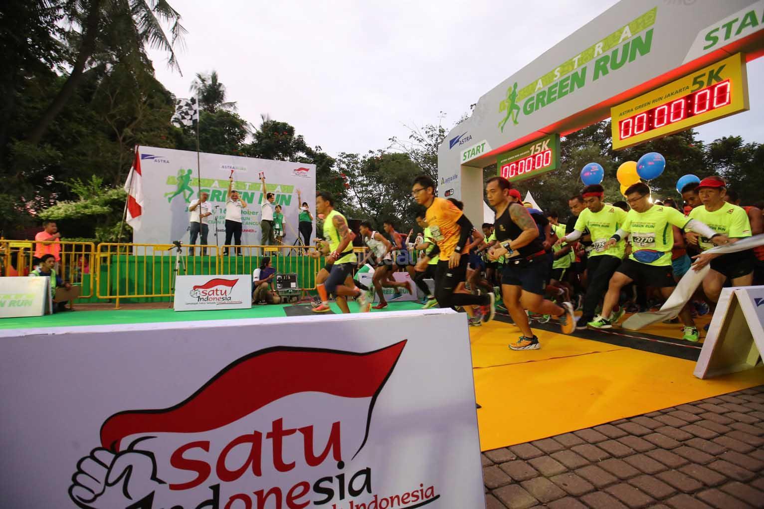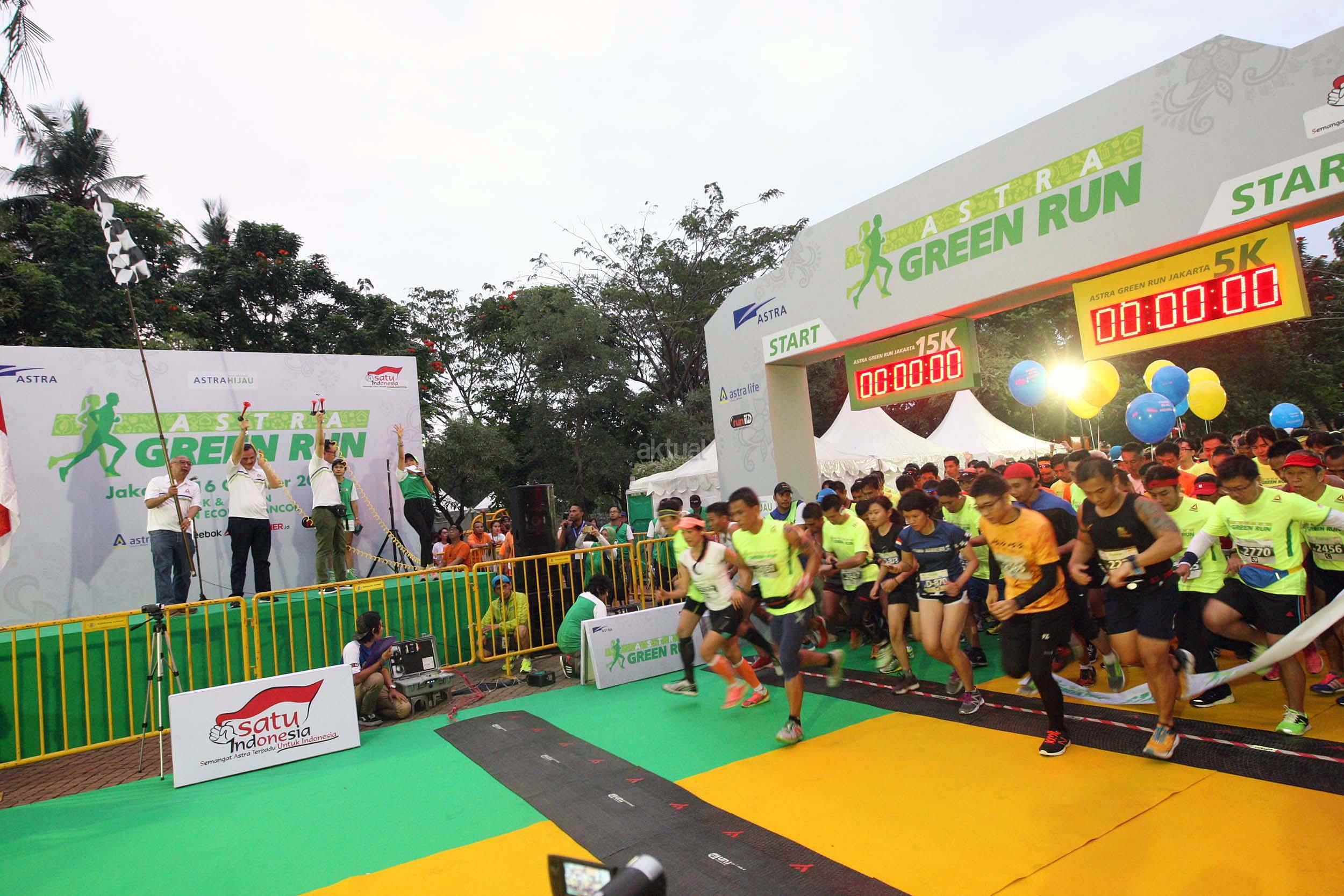 Chief of Corporate Communications, Social Responsibility & Security PT Astra International Tbk Pongki Pamungkas (memegang bendera) didampingi Head of Environment & Social Responsibility Astra Riza Deliansyah (kedua kiri) dan Deputy Head of Public Relations Astra Boy Kelana Soebroto (ketiga kiri) melepas peserta Astra Green Run (AGR) Jakarta 2016 yang dilaksanakan hari ini di Ocean Ecopark Ancol, Jakarta (16/10).AGR merupakan kegiatan berlari dengan konsep ramah lingkungan yang dilaksanakan Astra dan bertujuan mengajak masyarakat untuk bergaya hidup sehat.
