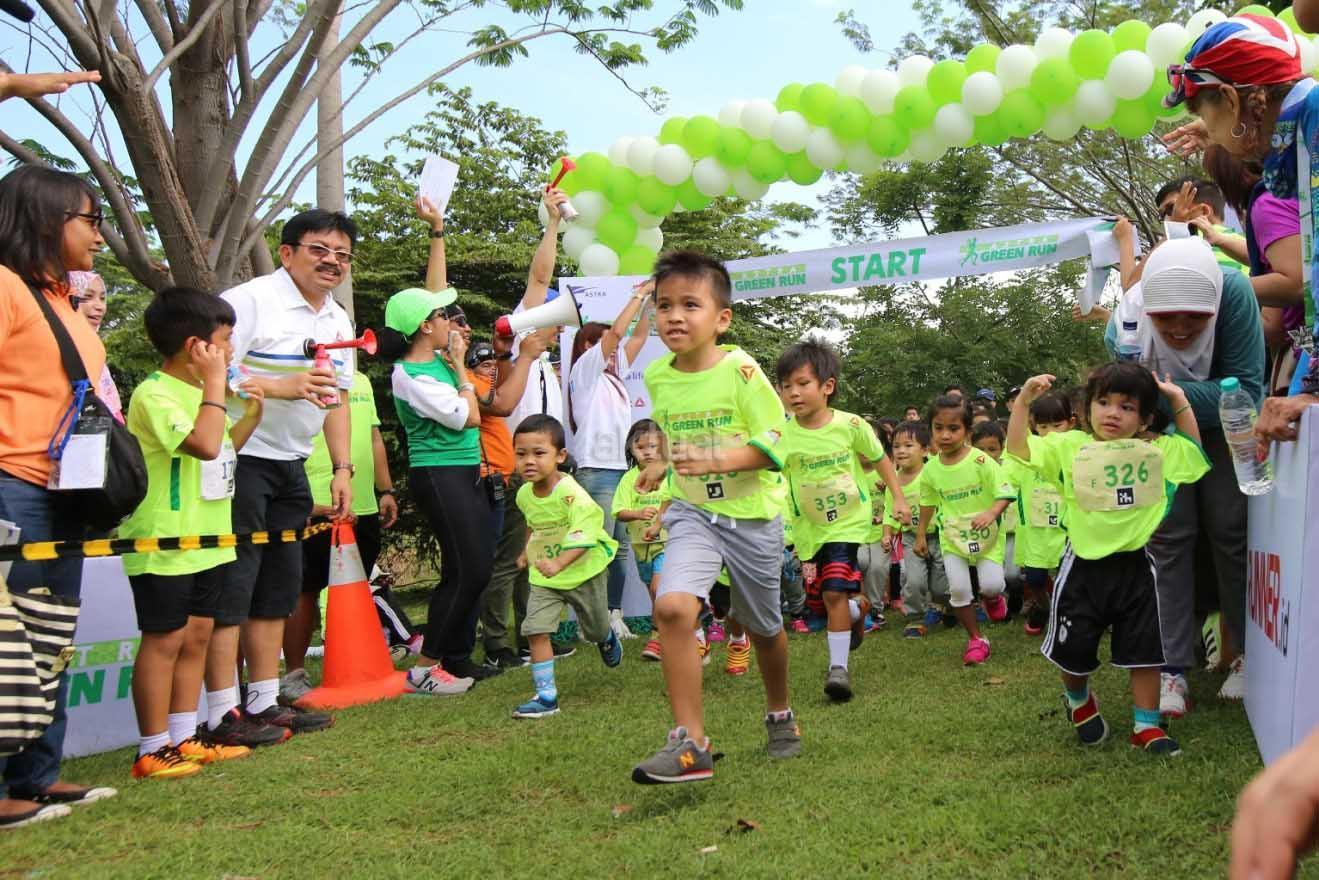 Head of Public Relations PT Astra International Tbk Yulian Warman (kiri berbaju putih) melepas pelari anak-anak yang mengikuti Fun Run berjarak 100 meter dan 400 meter dalam Astra Green Run (AGR) Jakarta 2016 (16/10).