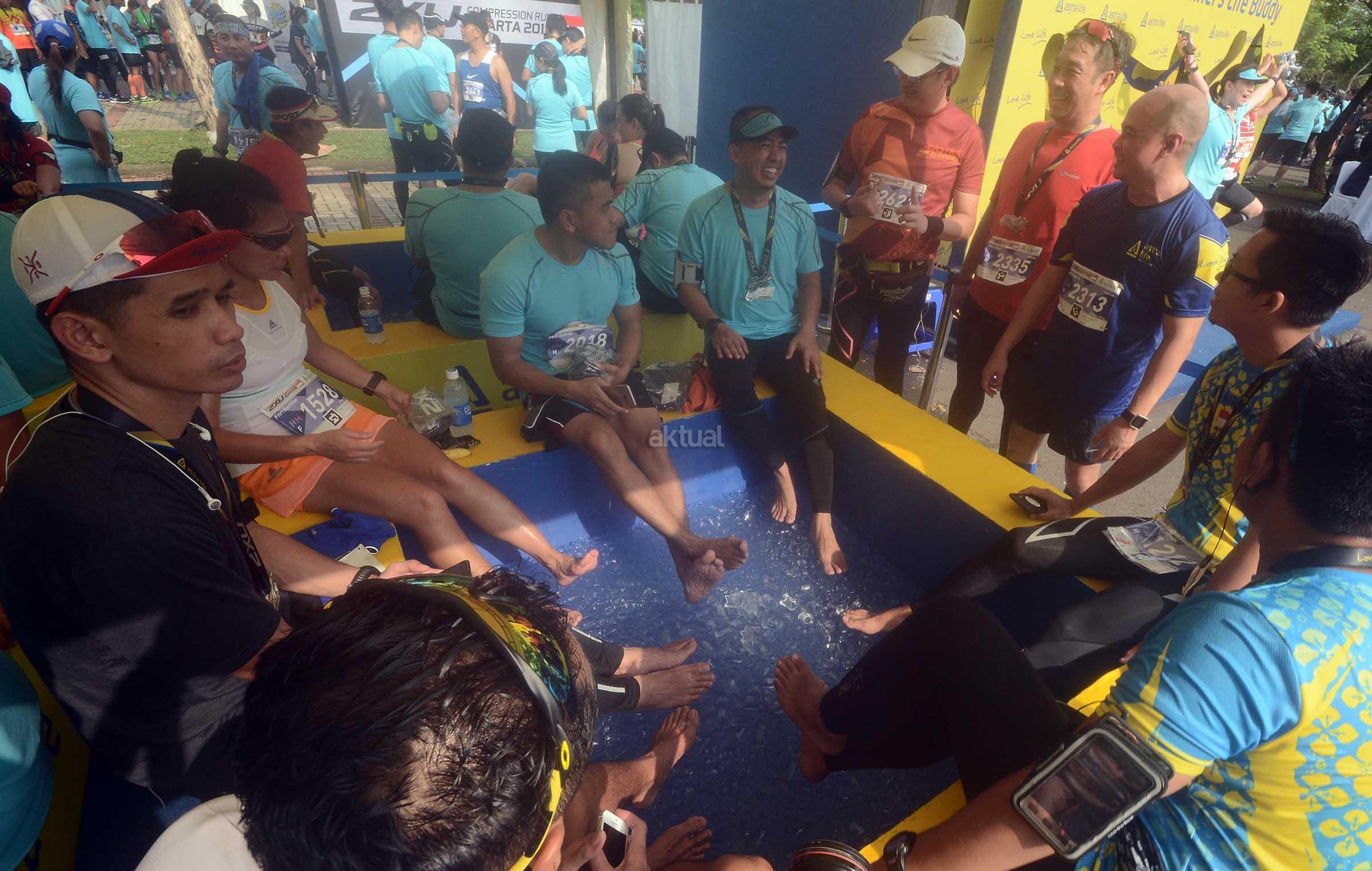 Presiden Direktur PT PermataBank, Roy Armand (kiri berdiri ) Direktur PT Astra Aviva Life, Luky Suardi (kanan berdiri ) serta Wholesale Banking Corporate PT PermataBank,Budi Ramadi Jerry (tengah berdiri) berbincang dengan peserta 2XU Compression Run Jakarta 2016 yang melakukan relaksasi kaki di “giant ice pool” booth Astra Life Minggu (27/11) di Mal Alam Sutera BSD Tangerang.Astra Life mendukung 5000 pelari peserta kompetisi ini untuk bisa bahagia menikmati hidup dengan menyalurkan hobi olahraga yang menyehatkan dan eksis mengikuti perkembangan trend life style sambil menantang diri mereka memecahkan rekor pribadi,PT ASTRA AVIVA LIFE (Astra Life), perusahaan asuransi jiwa bertagline ‘Love Life’ yang hadir untuk membantu orang Indonesia mencintai hidup, untuk kedua kalinya menjadi partner resmi asuransi jiwa bagi acara kompetisi 2XU Compression Run Jakarta 2016 dan hadir bagi para pencinta olah raga lari untuk mendukung perilaku Healthy Life (pola hidup sehat) sebagai bagian dari kampanye gerakan mencintai hidup yang bisa diwujudkan melalui tiga cara yang dikenal dengan 3H: Healthy Lifestyle – Happy Lifestyle – Healthy Financial, bahwa kesehatan jiwa dan raga harus diimbangi juga dengan kesehatan finansial. AKTUAL/Eko S Hilman