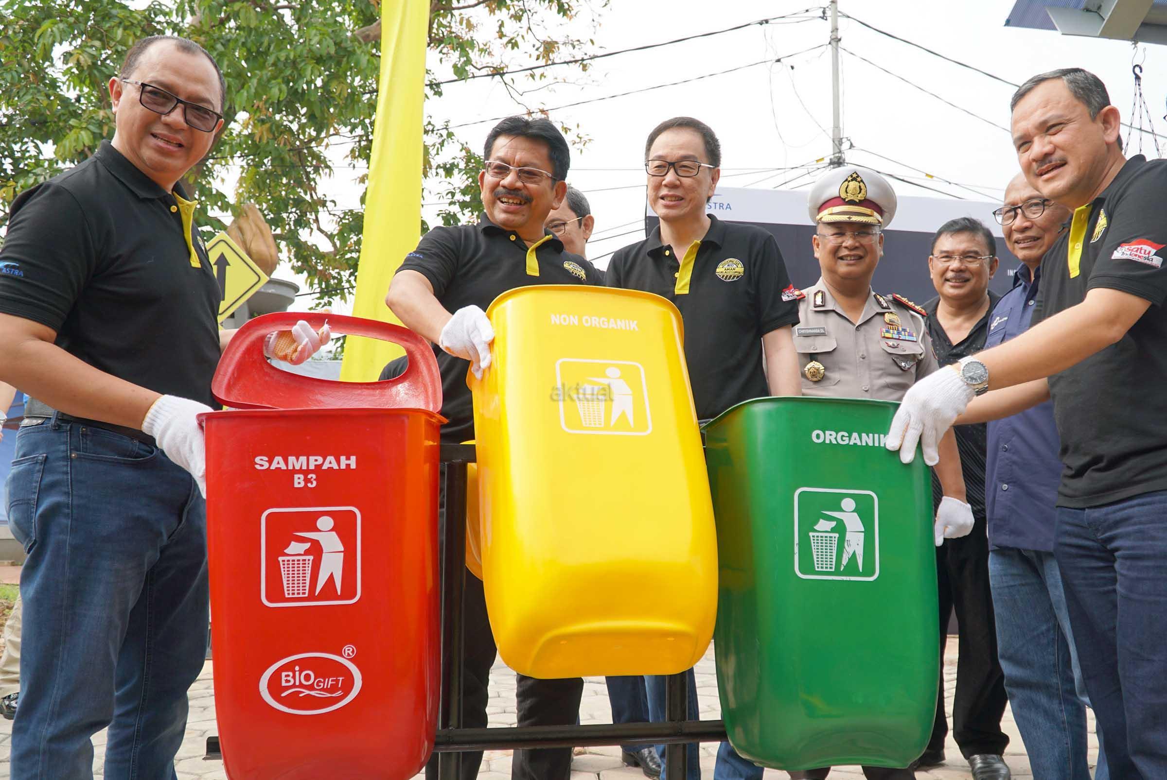 Direktur Keamanan dan Keselamatan Koordinator Lalulintas Polisi Republik Indonesia Chryshnanda Dwilaksana (keempat kiri) bersama Presiden Direktur PT Astra International Tbk Prijono Sugiarto (ketiga kiri), Kasubdit Terminal Angkutan Jalan Umum Kementerian Perhubungan RI Torang Hutabarat (keempat kanan), Chief of Corporate Communications, Social Responsibility & Security Astra Pongki Pamungkas (ketiga kanan), Chief of Corporate Human Capital Development Astra Aloysius Budi Santoso (paling kanan), Head of Public Relations Astra Yulian Warman (kedua kiri), Head of Environment & Social Responsibility Astra Riza Deliansyah dan Head of Security Astra Karim Suwandono memasang tempat sampah untuk halte Lapangan Panah, Senayan, Jakarta pada acara aksi sosial Inspirasi Halte Bersih yang akan digelar di 60 kota 600 halte dalam rangka HUT ke-60 Astra (25/2).