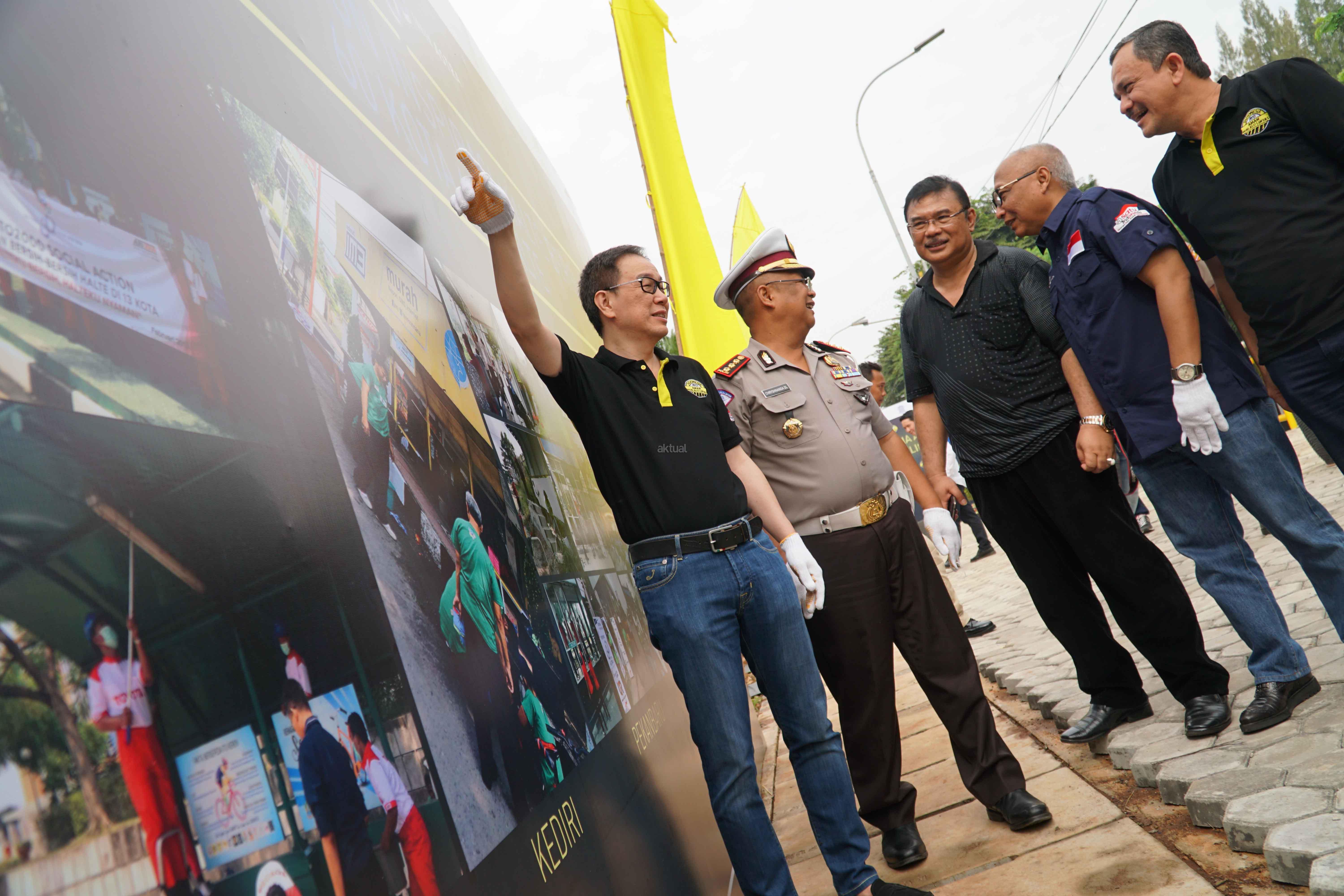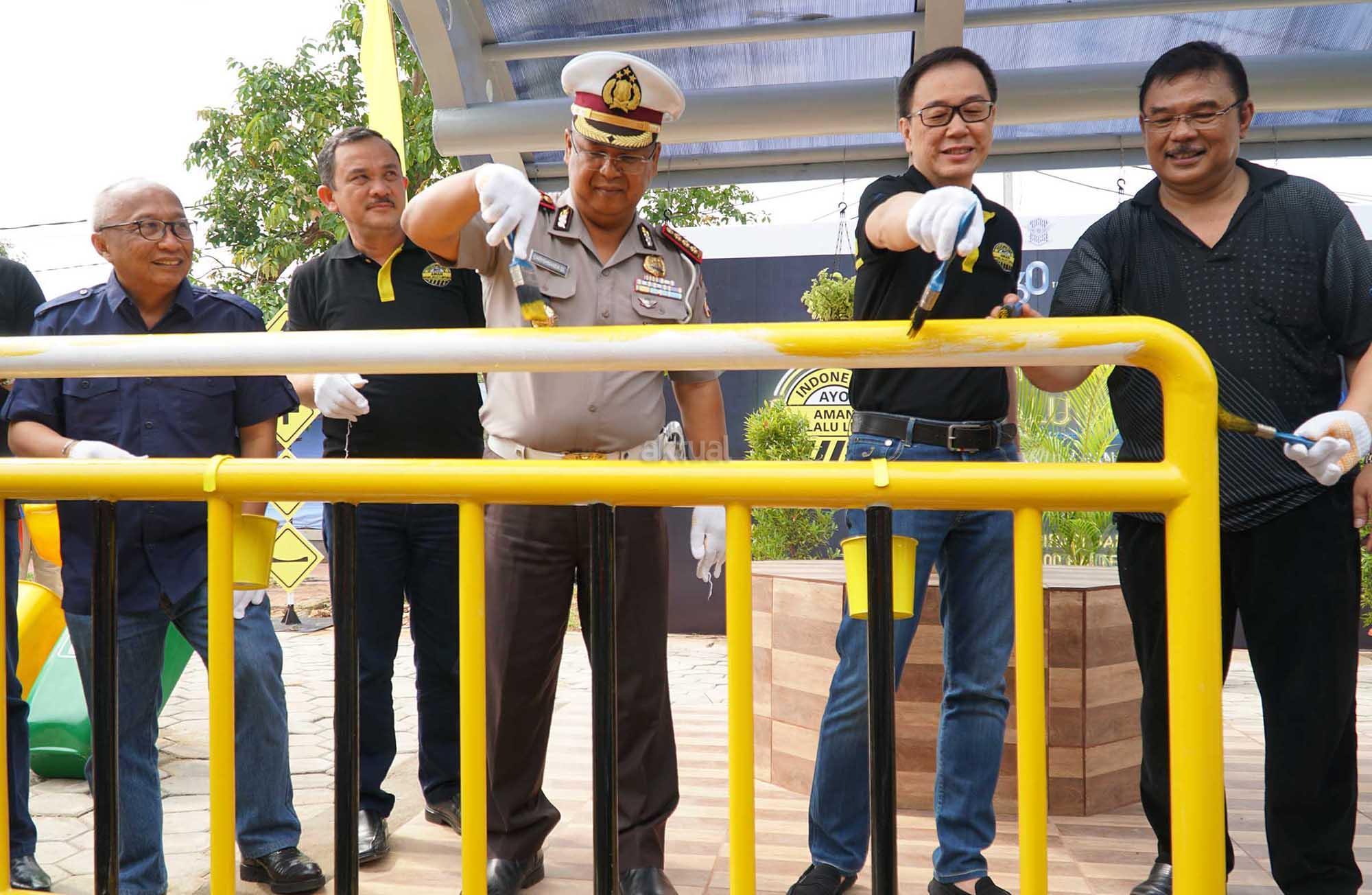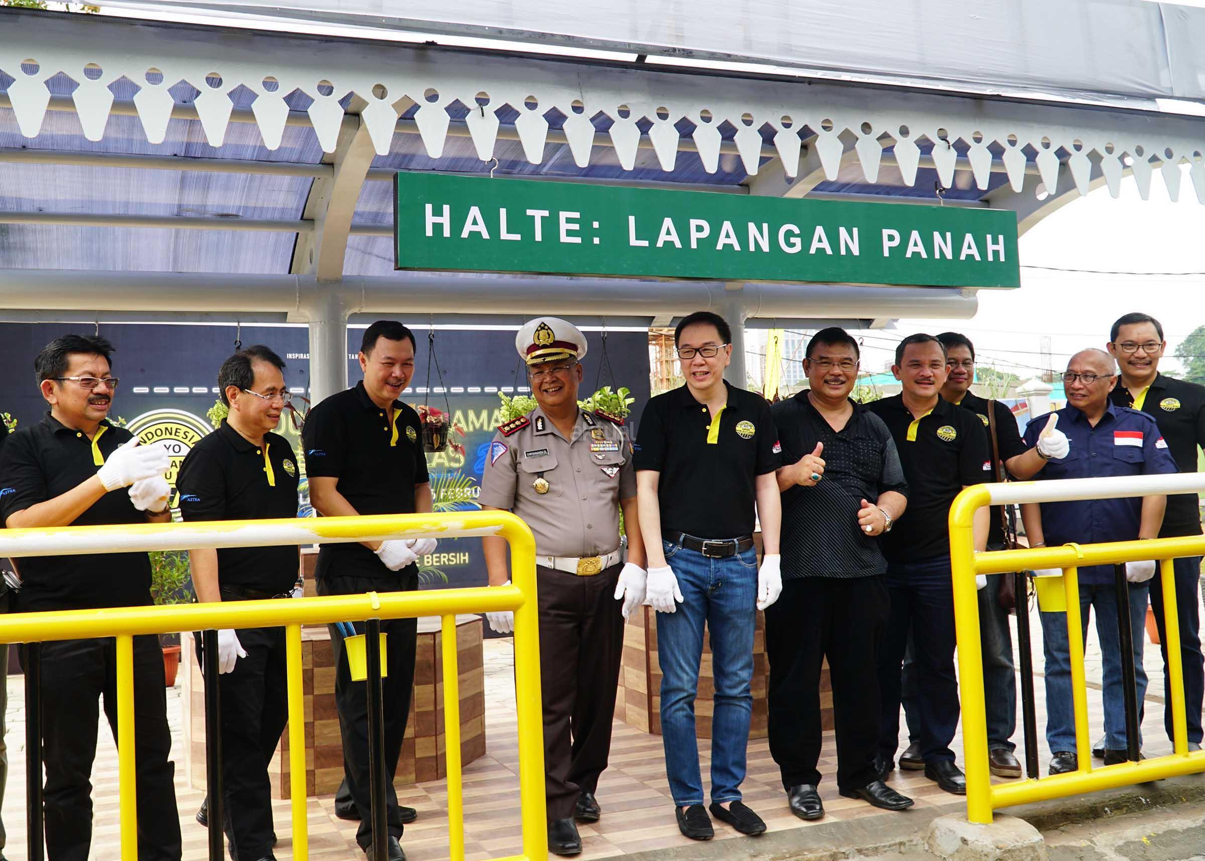 Direktur Keamanan dan Keselamatan Koordinator Lalulintas Polisi Republik Indonesia Chryshnanda Dwilaksana (tengah) bersama Presiden Direktur PT Astra International Tbk Prijono Sugiarto (keempat kiri), Kasubdit Terminal Angkutan Jalan Umum Kementerian Perhubungan RI Torang Hutabarat (kelima kiri), Chief of Corporate Communications, Social Responsibility & Security Astra Pongki Pamungkas (paling kiri), dan Head of Environment & Social Responsibility Astra Riza Deliansyah (kedua kiri) mengecat pagar halte Lapangan Panah, Senayan, Jakarta, Sabtu (25/2). PT Astra International Tbk mempercantik 600 halte di 60 kota di Indonesia. Aksi sosial Inspirasi Halte Bersih itu dalam rangka HUT ke-60 Astra. AKTUAL/Eko S Hilman