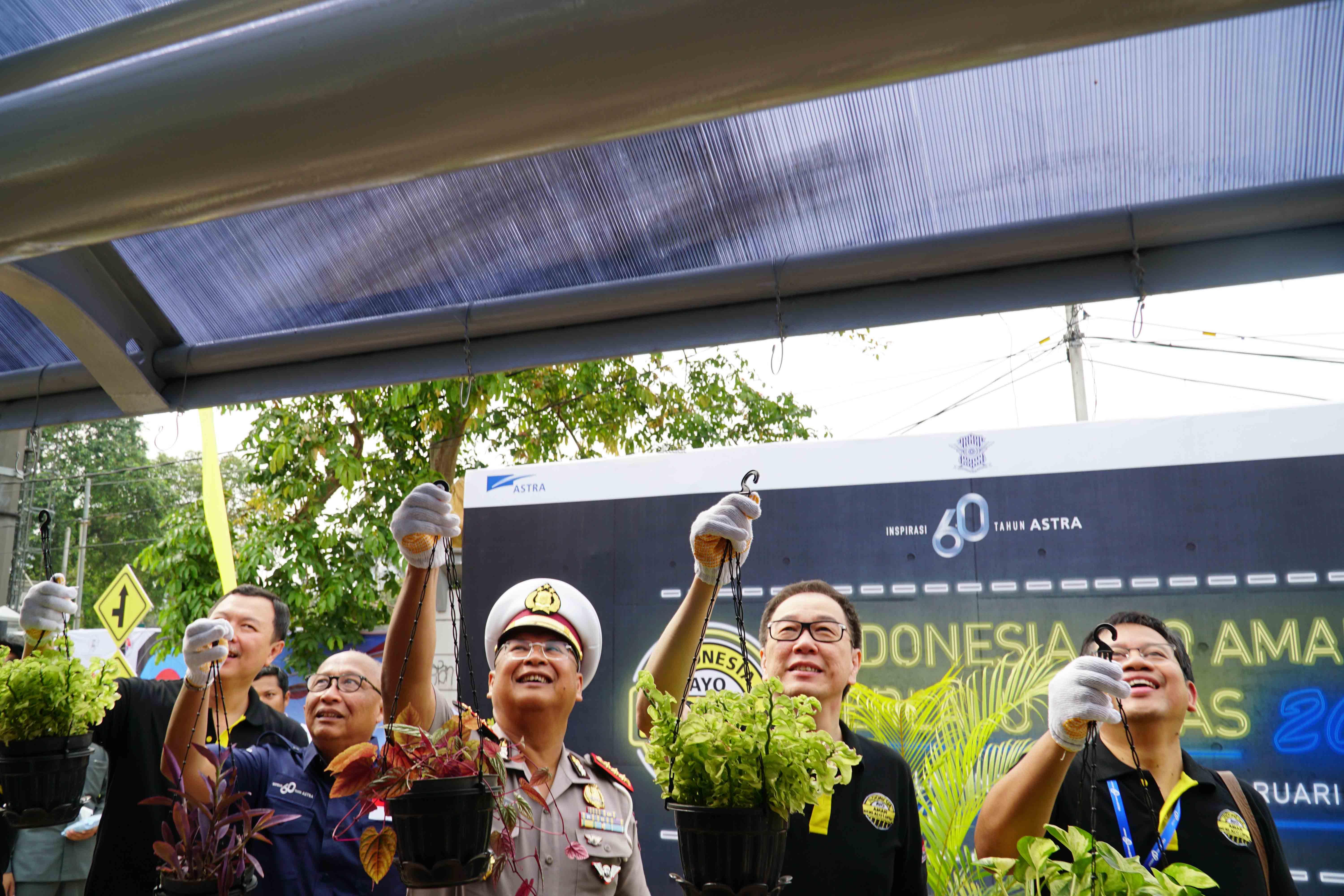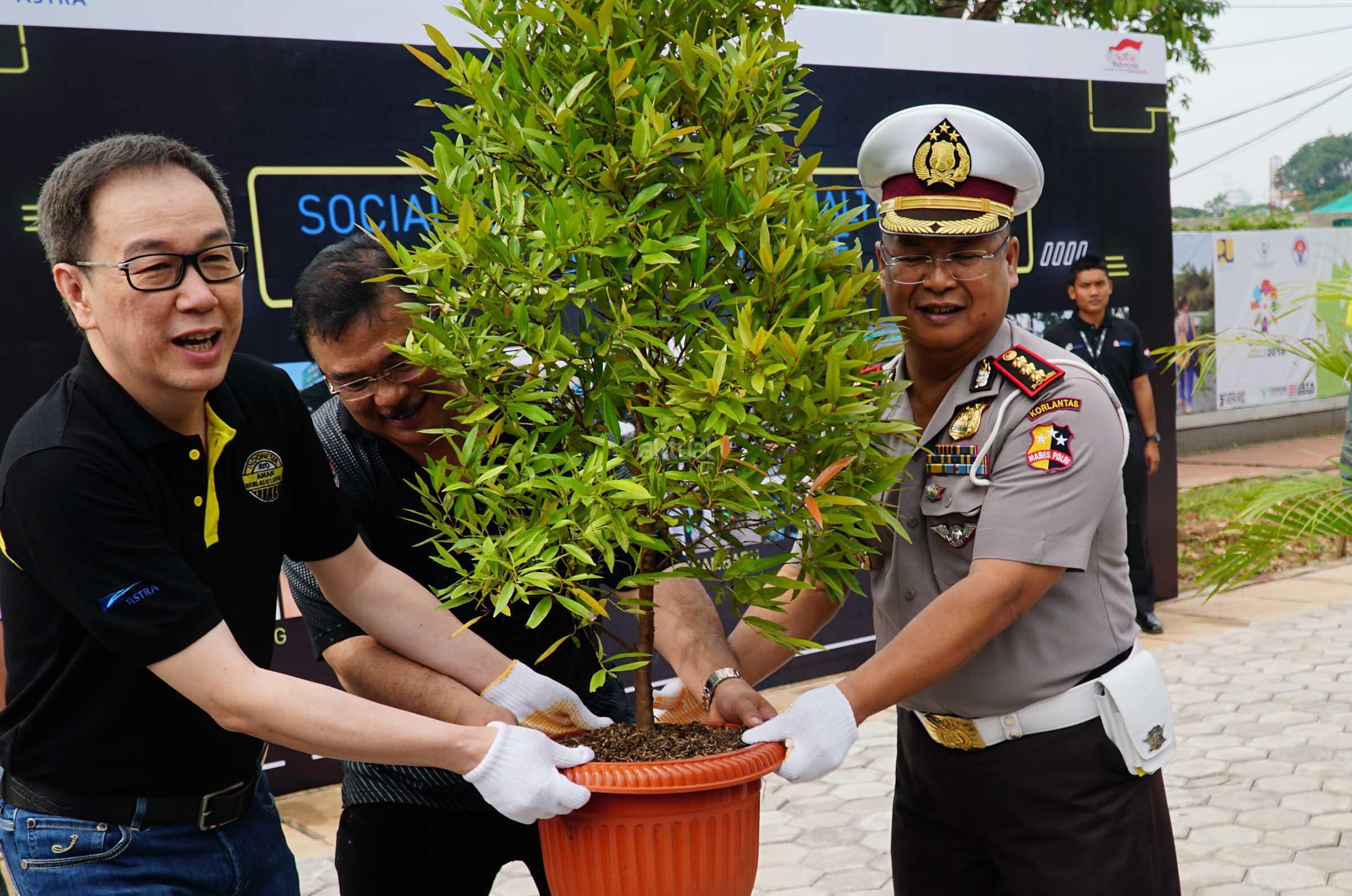 Presiden Direktur PT Astra International Tbk Prijono Sugiarto (kiri) bersama Direktur Keamanan dan Keselamatan Koordinator Lalulintas Polisi Republik Indonesia Chryshnanda Dwilaksana (kanan) dan Kasubdit Terminal Angkutan Jalan Umum Kementerian Perhubungan RI Torang Hutabarat (tengah) memindahkan bersama tanaman kedalam pot besar saat aksi sosial Inspirasi Halte Bersih yang digelar di 60 kota 600 halte dalam rangka HUT ke-60 Astra di Jakarta, Sabtu (25/2). Halte yang direnovasi atau mendapatkan beautifikasi dengan menggunakan tema Indonesia Ayo Aman Berlalu Lintas (IAABL). Dimana kampanye yang digagas oleh Astra dan Korlantas Polri untuk mensosialisasikan keselamatan berlalu-lintas. Program ini merupakan wujud komitmen Astra untuk terus mengajak masyarakat membudayakan keselamatan berkendara di jalan raya. Melalui program ini, Astra telah memberikan 23.730.800 paparan panduan keselamatan berlalu lintas. AKTUAL/Eko S Hilman