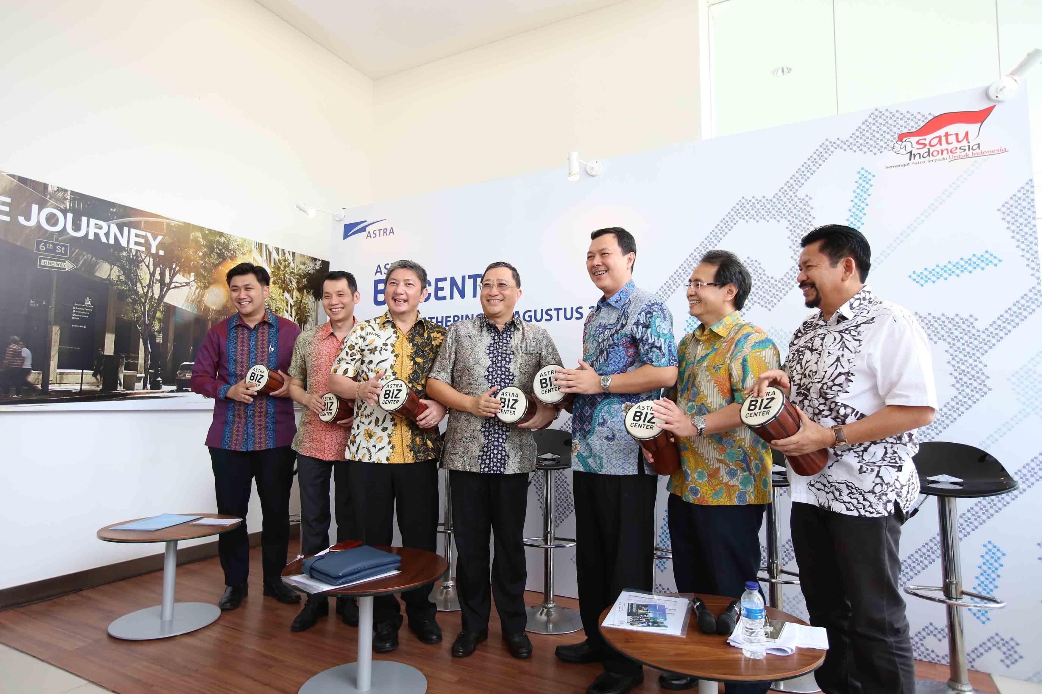 (ki-ka) National Operation Head PSO Andyka Susanto, Chief Executive BMW Sales Operation Fredy Handjaja, Chief Executive Isuzu Sales Operation Joen Boediputra, Deputy CE DSO Supranoto, Chief Executive Toyota Sales Operation Agus Prajitno, Chief Executive Honda Sales Operation Sigit Prabowo Kumala dan Head of Public Relations PT Astra International Tbk Yulian Warman memainkan alat music perkusi djembe usai menggelar media gathering peresmian kawasan Astra Biz Center BSD City, Kabupaten Tangerang (14/08). AKTUAL/Humas Astra