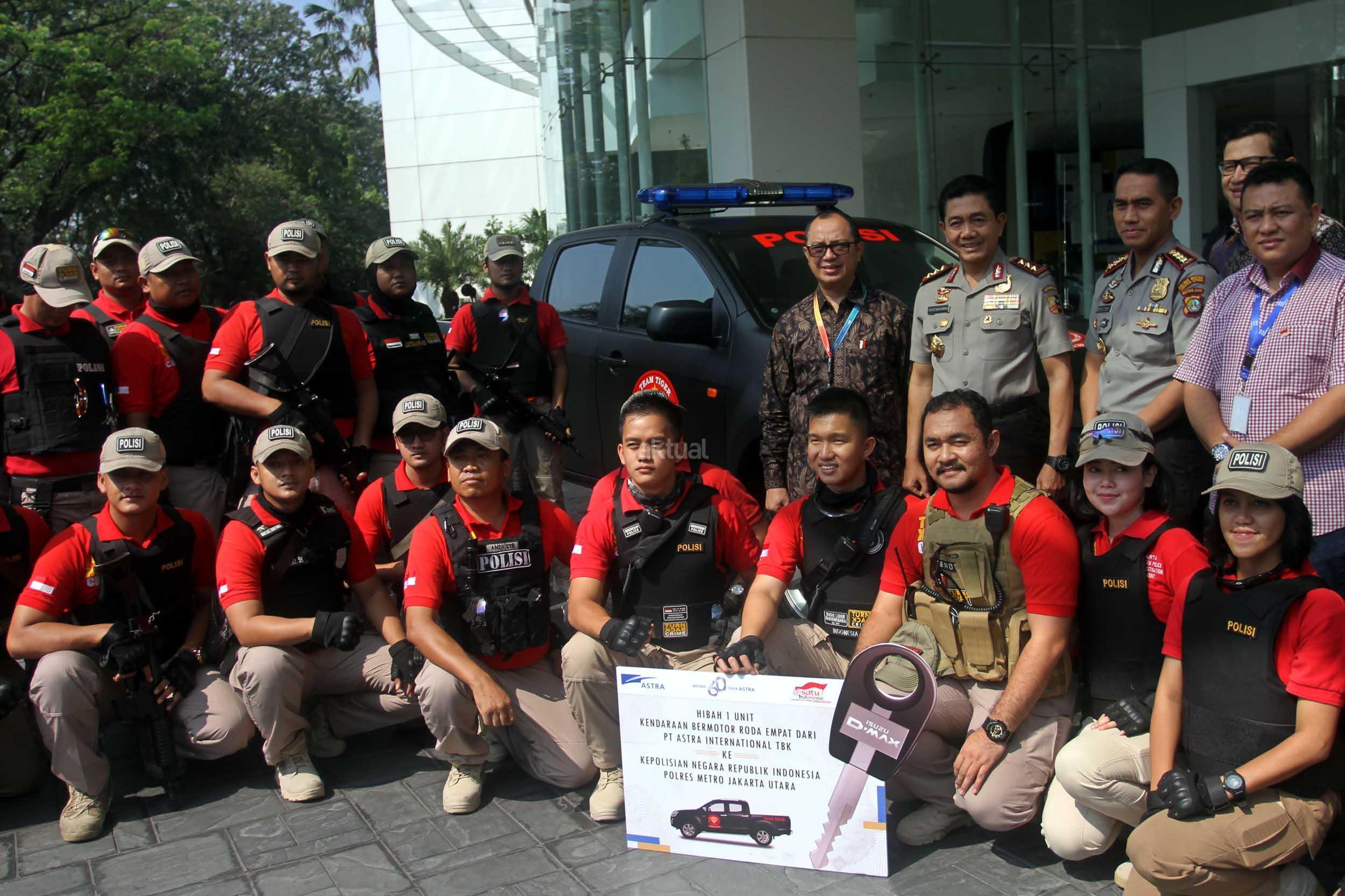 Kabarhakam Polri Komjen Pol Putut Bayu Seno, Head of Security PT Astra International Tbk Karim Suwandono, Kapolres Jakarta Utara Kombes Pol Dwiyono dan Tim Tiger berfoto bersama saat penyerahan satu unit mobil operasional Tim Tiger Polres Jakarta Utara di Kantor Pusat Astra International, Sunter, Jakarta, Selasa (25/7). Dalam rangka meningkatkan standar pengamanan, Grup astra mempelopori Asosiasi Pengguna Jasa Security Indonesia (APJASI) dengan tujuan menjadi mitra bisnis strategis yang memberikan nilai tambah bagi perusahaan. AKTUAL/Eko S Hilman