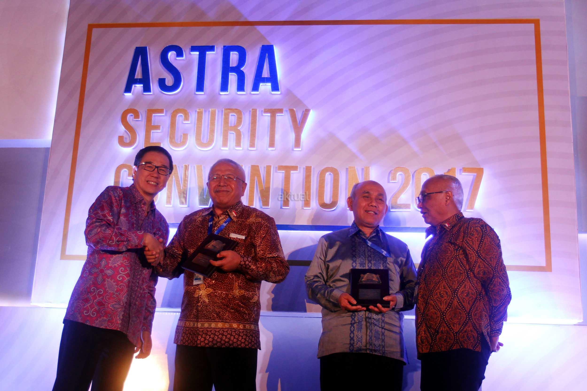 Presdir PT Astra International Tbk Prijono Sugiarto (kiri), Chief of Corporate Communications Social Responsibility & Security Astra Internasional Pongki Pamungkas (kanan) menyerahkan penghargaan kepada penggagas Astra Security Sugito (kedua kiri) dan Sugini (kedua kanan) di Kantor Pusat Astra International, Sunter, Jakarta, Selasa (25/7). Dalam rangka meningkatkan standar pengamanan, Grup astra mempelopori Asosiasi Pengguna Jasa Security Indonesia (APJASI) dengan tujuan menjadi mitra bisnis strategis yang memberikan nilai tambah bagi perusahaan. AKTUAL/Eko S Hilman