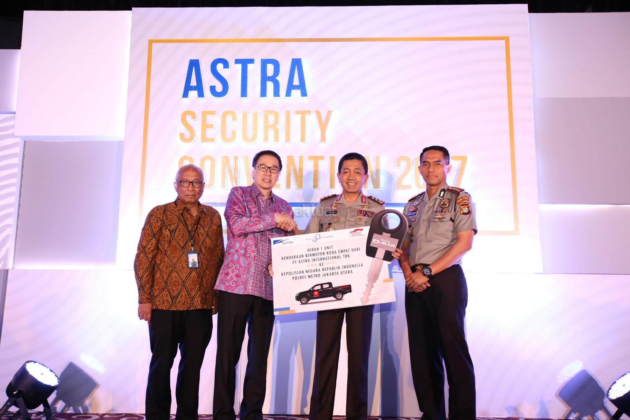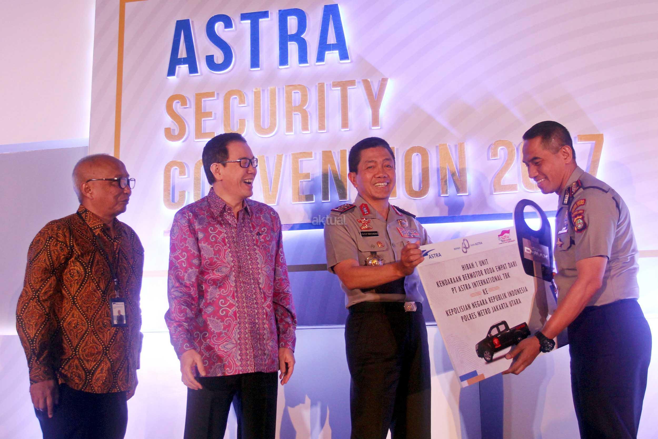 Kabarhakam Polri Komjen Pol Putut Bayu Seno (kedua kanan) didampingi Kapolres Jakarta Utara Kombes Pol Dwiyono (kanan) menerima secara simbolis mobil Isuzu DMax dari Presiden Direktur PT Astra International Tbk Prijono Sugiarto (kedua kiri) didampingi Chief of Corporate Communications, Social Responsibility & Security Astra International Pongki Pamungkas (kiri) yang nantinya akan dimanfaatkan mendukung program Team Tiger Polres Metro Utara dalam upaya pencegahan dan penindakan kejahatan dengan prinsip “Tindak Tegas Reaksi Cepat” di wilayah Jakarta Utara, pada acara Astra Security Convention 2017 di Jakarta, selasa (25/7). AKTUAL/Eko S Hilman