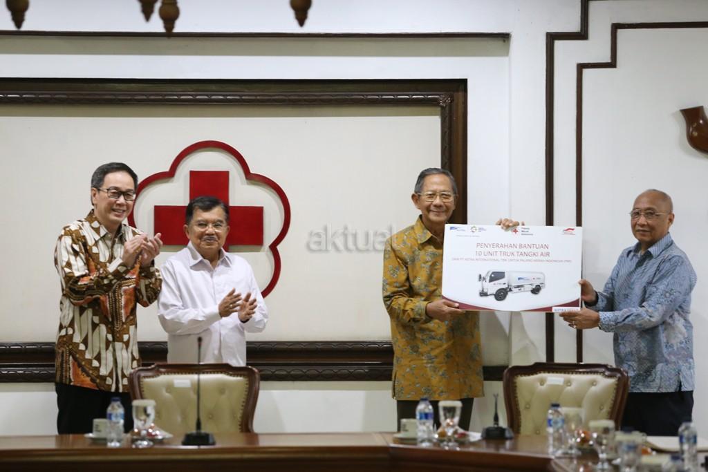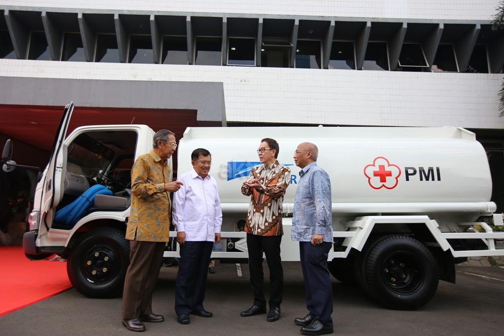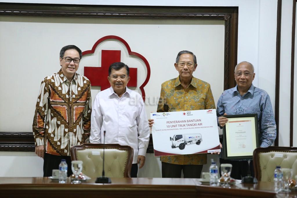 Ketua Umum PMI Jusuf Kalla (kedua kiri) bersama Presiden Direktur PT Astra International Tbk Prijono Sugiarto (kiri) menyaksikan serah terima secara simbolis 10 unit truk tangki air dari Astra kepada PMI oleh Pelaksana Harian (Plh) Ketua Umum PMI Ginandjar Kartasasmita (kedua kanan) dan Chief of Corporate Communications, Social Responsibility & Security Astra International Pongki Pamungkas (kanan) di Jakarta (6/4). AKTUAL/Eko S Hilman