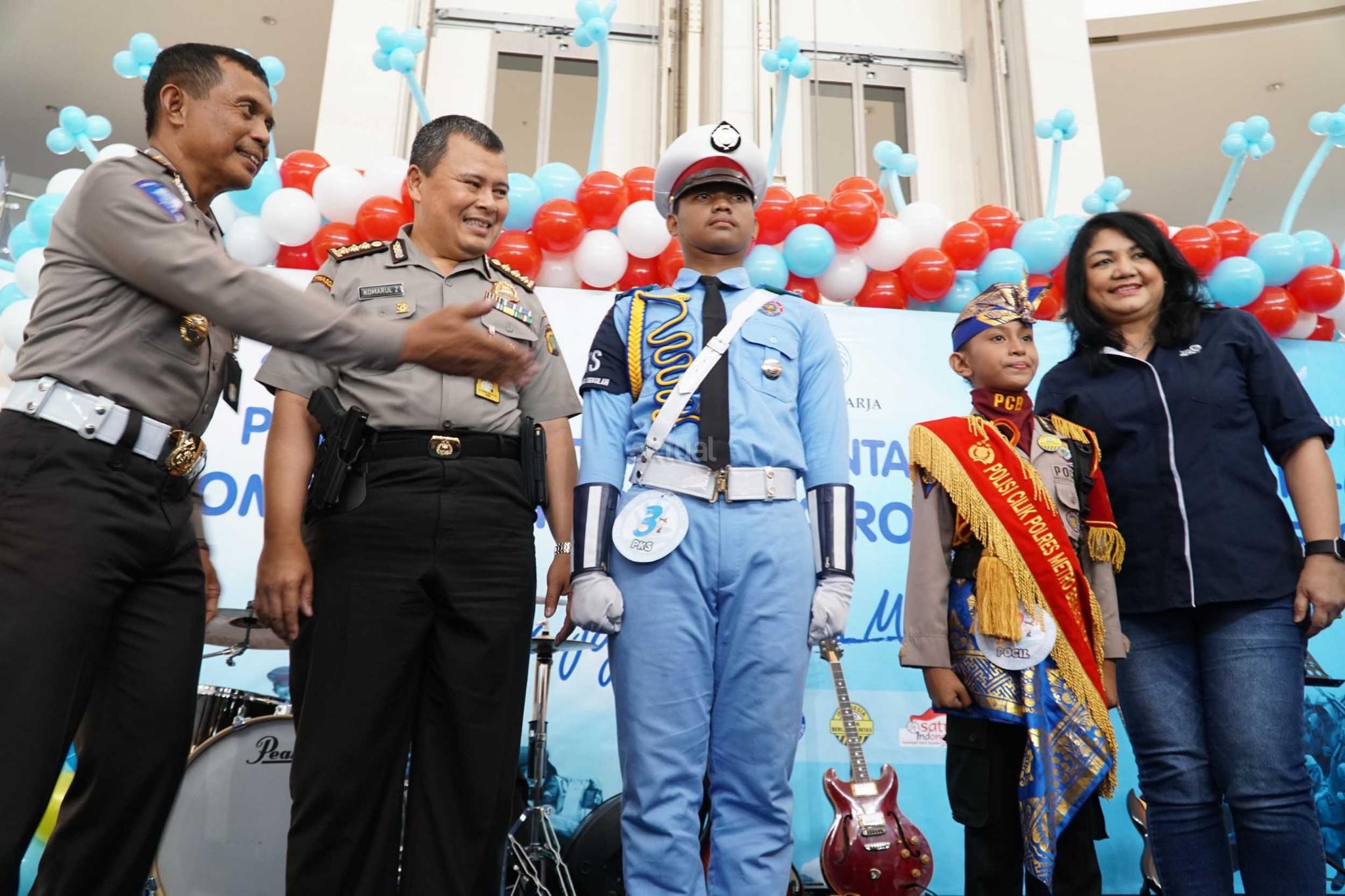 Direktur Lalulintas Polda Metro Jaya Kombes Pol Halim Pagarra (jongkok kiri) bersama Irwasda Polda Metro Jaya Kombes Pol Kamaru Zaman (jongkok tengah) dan Chief Corporate Service Officer Asuransi Astra Ida Sigalingging (kanan) berbincang dengan peserta lomba Polisi Cilik (Polcil) di Serpong, Tangerang, Banten, Sabtu (9/9). Lomba Polisi Cilik dan Patroli Keamanan Sekolah se-wilayah hukum Polda Metro Jaya yang diadakan oleh Kepolisian Polda Metro Jaya bersama Asuransi Astra diselenggarakan dalam rangka memperingati HUT Ke- 62 Bhayangkara.Asuransi Astra memberikan perlindungan Asuransi Makro bagi orang tua, siswa dan guru pendamping peserta pada acara Lomba Polisi Cilik dan Patroli Keamanan Sekolah sewilayah hukum Polda metro Jaya di Mall Alam Sutra, Tangerang, Sabtu (9/9/2017). Acara tersebut merupakan kerjasama Asuransi Astra dengan Direktorat lalu Lintas Polda Metro Jaya dalam rangka memperingati Hari Lalu Lintas Bhayangkara ke 62. Asuransi Astra secara berkesinambungan melakukan berbagai kegiatan untuk meningkatkan kesadaran masyarakat baik mengenai asuransi maupun keselamatan berlalu lintas. Bagi Asuransi Astra, berasuransi sama pentingnya dengan keselamatan berlalu lintas. AKTUAL/Eko S Hilman