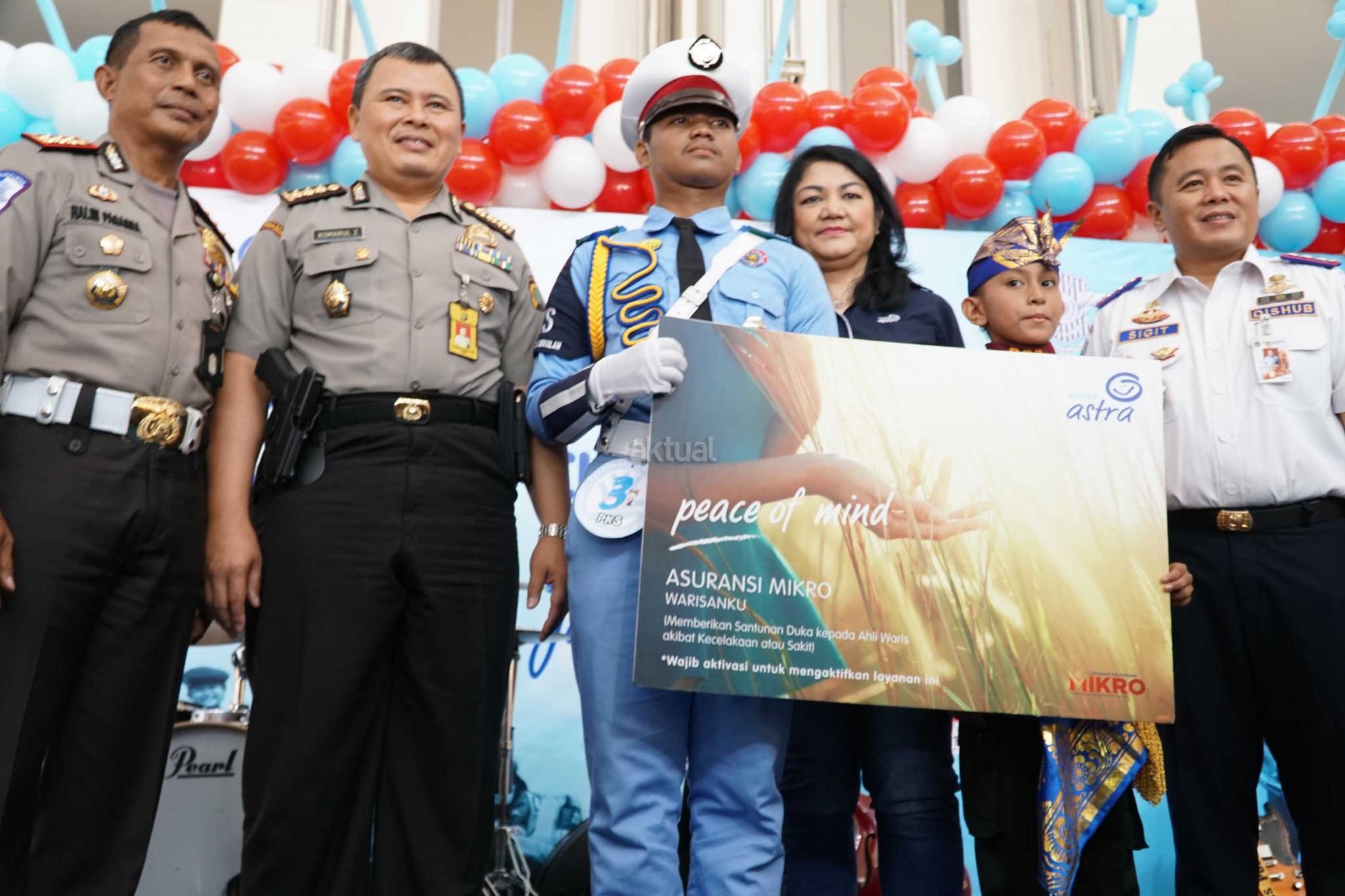 Chief Corparate Services Officer asuransi astra Ida R. M. Sigalingging disaksikan Dirlantas Polda Metro Jaya Kombes Pol Halim Pagarra (kiri), Irwasda Polda Metro Jaya Kombespol Kamarul Zaman (kedua kiri), secara simbolis menyerahkan perlindungan Asuransi Mikro bagi orang tua, siswa dan guru pendamping peserta Lomba Polisi Cilik dan Patroli Keamanan Sekolah sewilayah hukum Polda metro Jaya di Mall Alam Sutra, Tangerang, Sabtu (9/9/2017).Asuransi Astra secara berkesinambungan melakukan berbagai kegiatan untuk meningkatkan kesadaran masyarakat baik mengenai asuransi maupun keselamatan berlalu lintas. Bagi Asuransi Astra, berasuransi sama pentingnya dengan keselamatan berlalu lintas. AKTUAL/Eko S Hilman