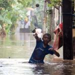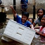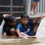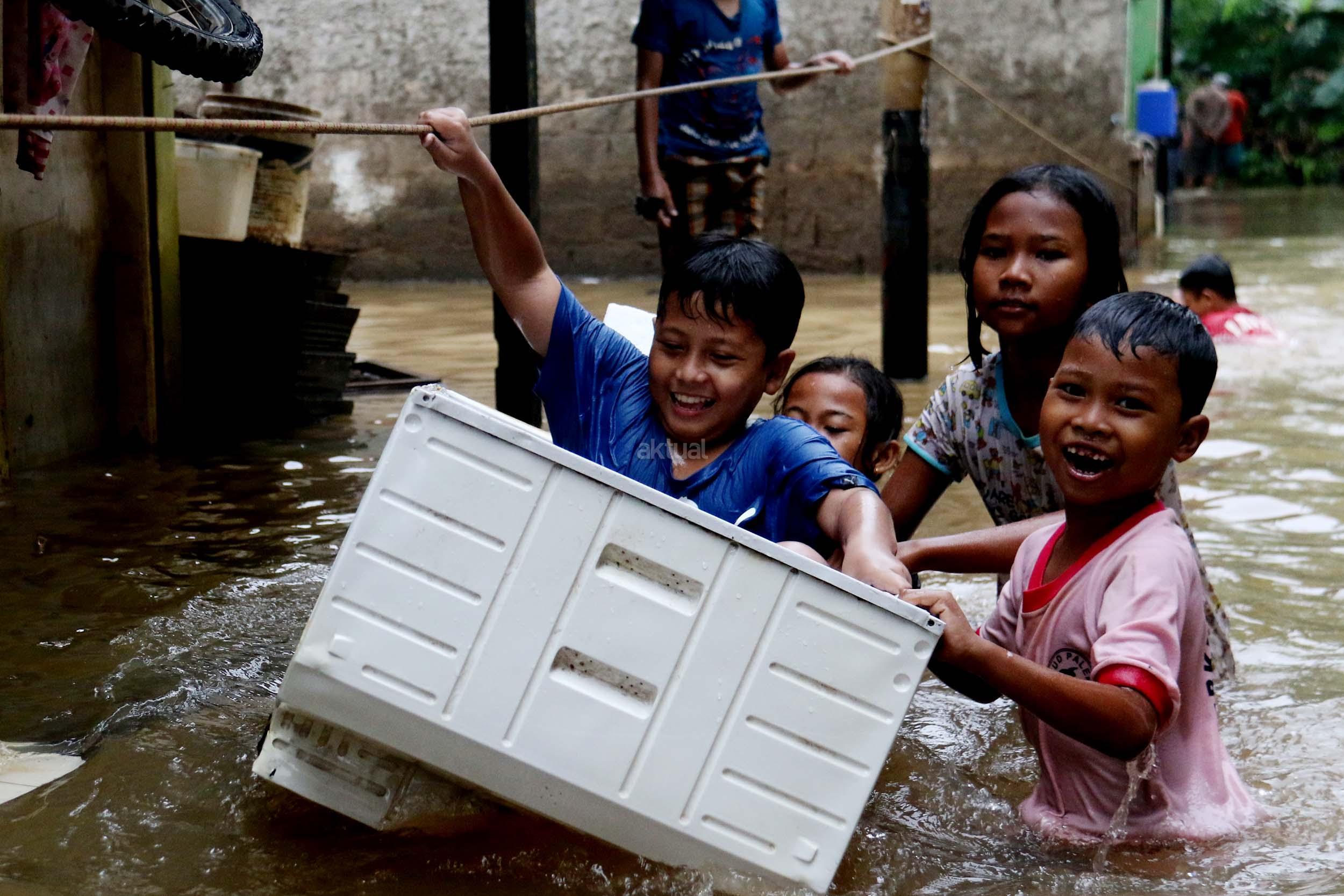 Sejumlah anak-anak asyik bermain di tengah banjir di kawasan Cipinang Melayu, Jakarta Timur, Senin (20/2/2017). Banjir ini merendam RW 3 hingga RW 4, Kelurahan Cipinang Melayu, Kecamatan Cipinang Muara dan sebanyak 285 warga diungsikan akibat banjir setinggi 1 meter. AKTUAL/Munzir