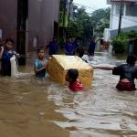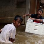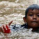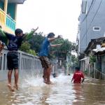 Sejumlah anak-anak asyik bermain di tengah banjir di kawasan Cipinang Melayu, Jakarta Timur, Senin (20/2/2017). Banjir ini merendam RW 3 hingga RW 4, Kelurahan Cipinang Melayu, Kecamatan Cipinang Muara dan sebanyak 285 warga diungsikan akibat banjir setinggi 1 meter.