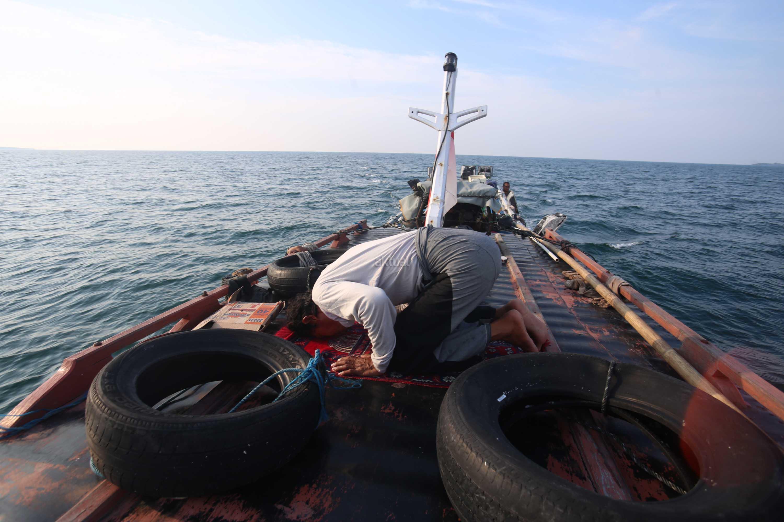 Seorang peserta melakukan salat diatas perahu saat kegiatan Sahur on The Boat ke-4 di kawasan perairan Karang Antu, Banten, Minggu (4/6). (Foto dok. Jojoners)