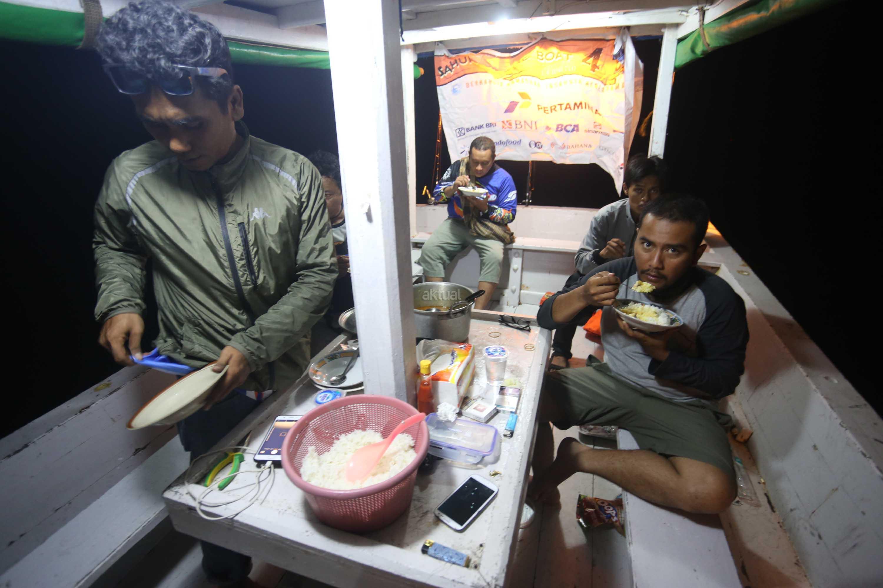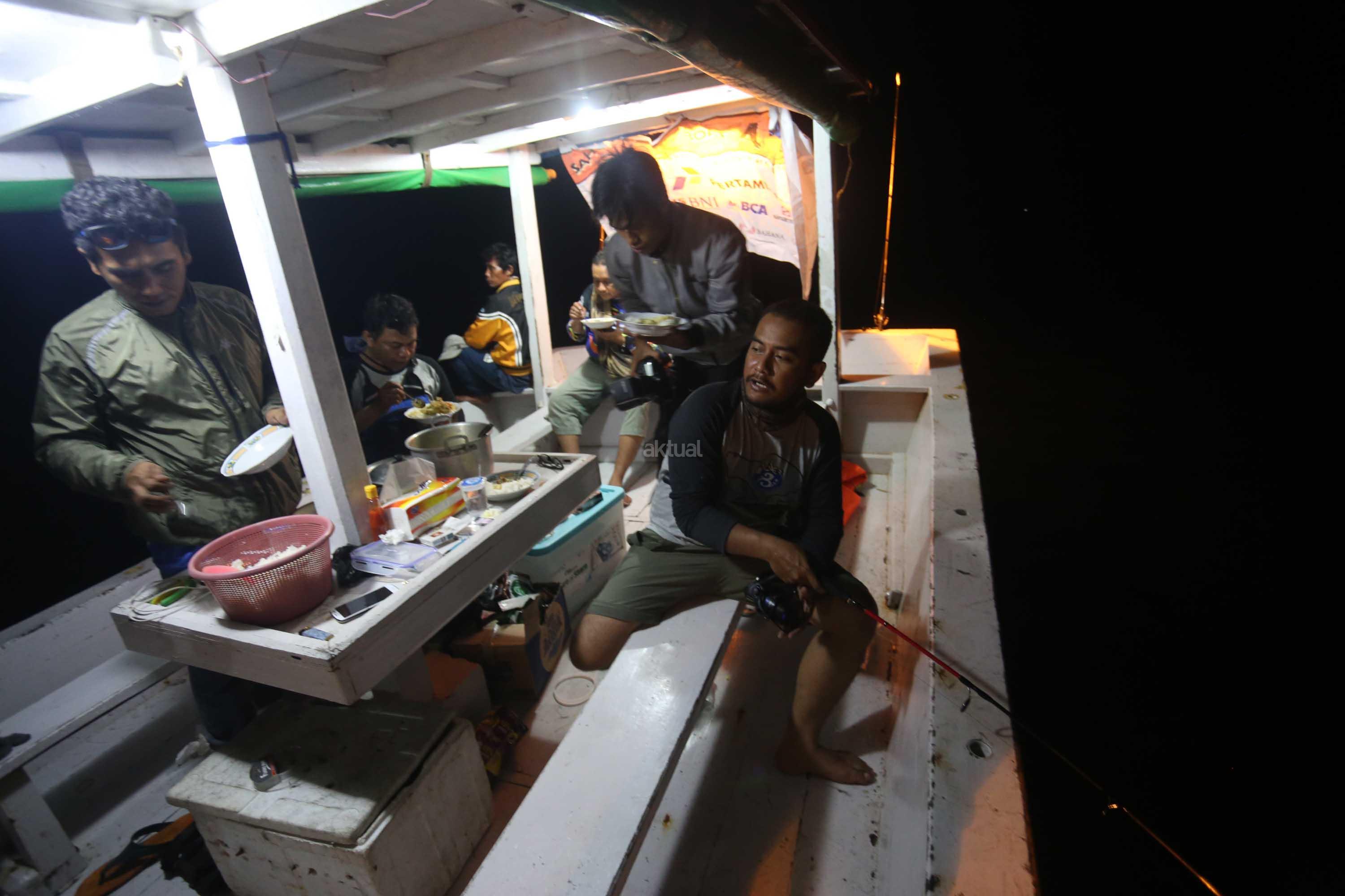Anggota Jurnalis Joran Indonesia makan sahur bersama saat kegiatan Sahur on The Boat ke-4 di kawasan perairan Karang Antu, Banten, Minggu (4/6). Kegiatan ini terdiri dari buka bersama anak yatim dan memancing pada saat sahur. (Foto dok. Jojoners)