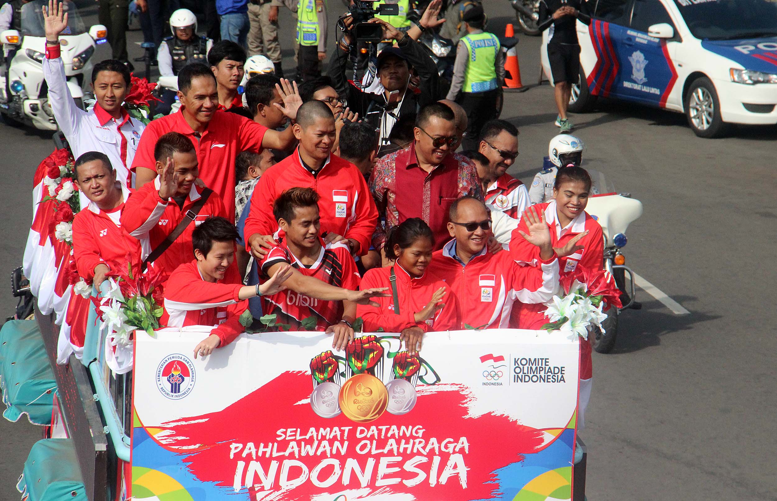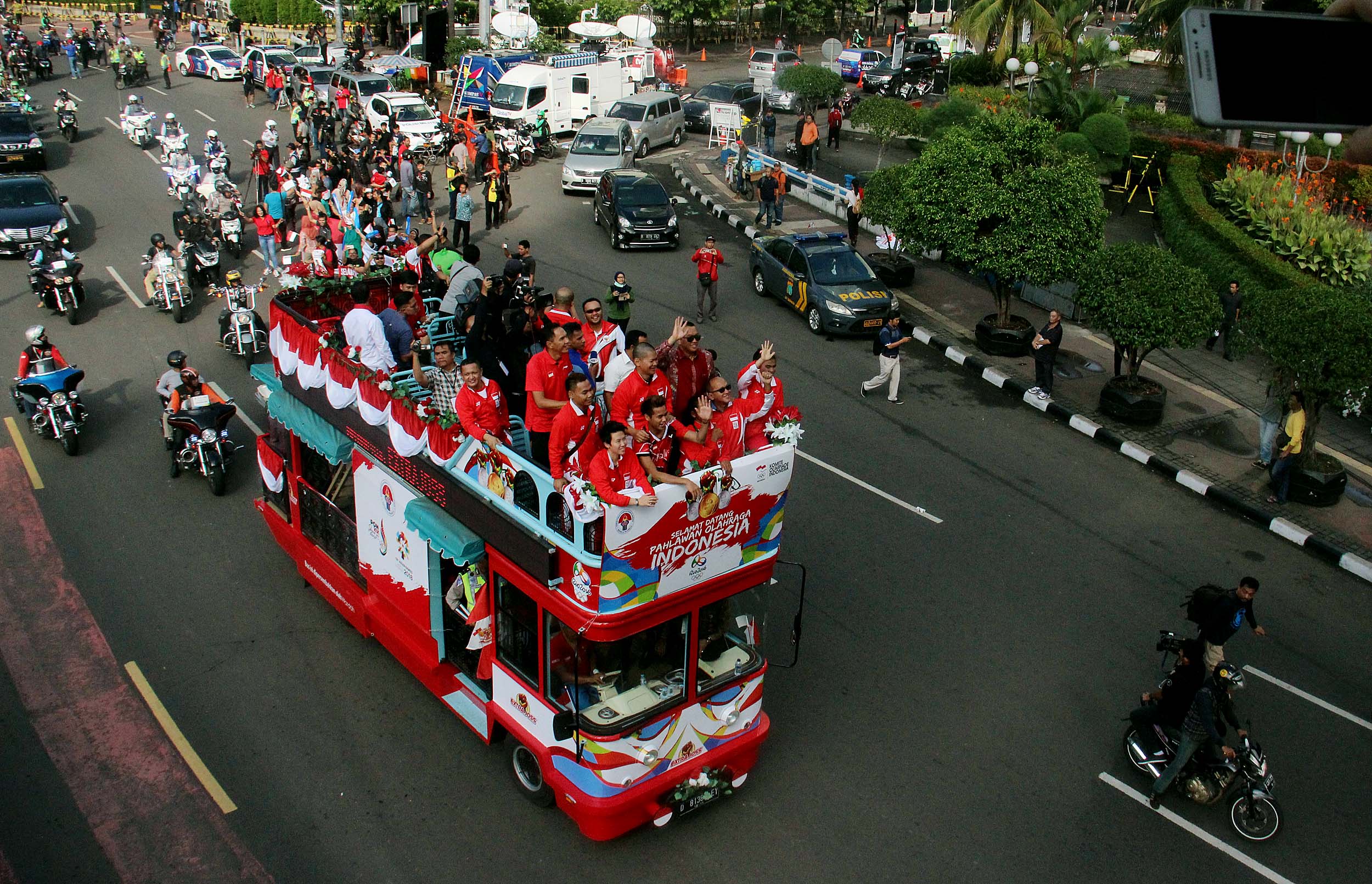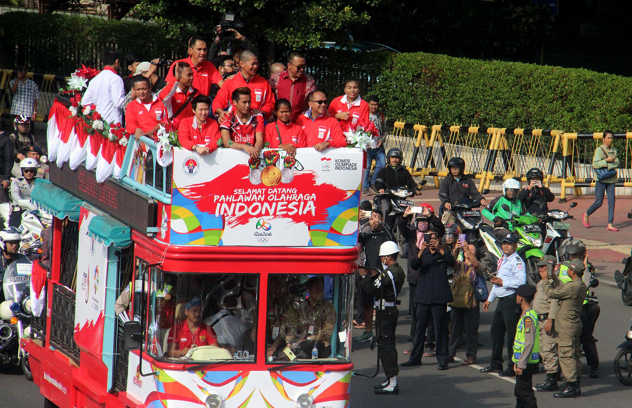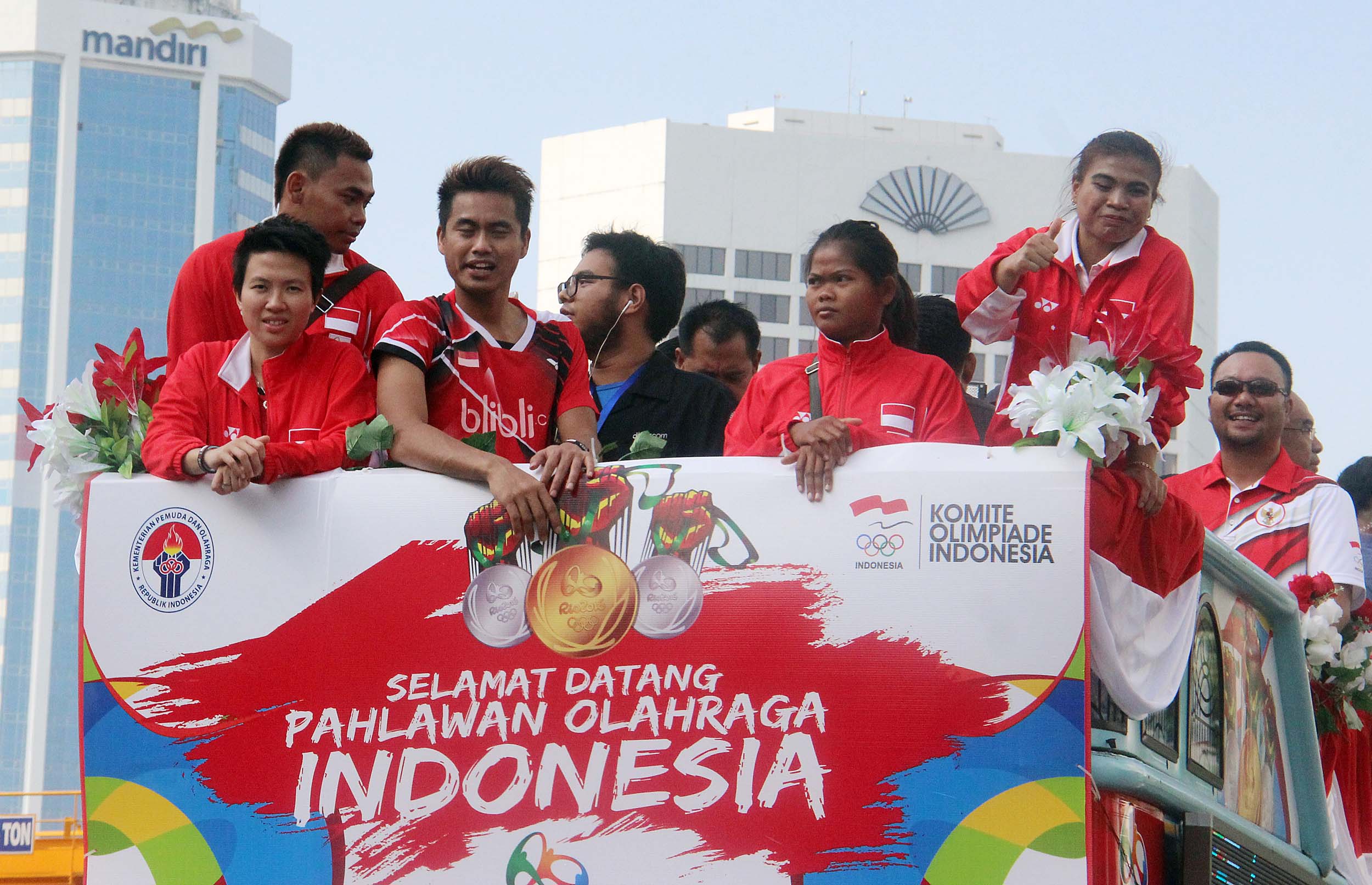 Pebulu tangkis ganda campuran peraih medali emas Olimpiade Brasil, Tontowi Ahmad dan Liliyana Natsir bersama sejumlah atlet dan offsial menaiki bus tingkat terbuka Bandros menuju Istana Negara di Bundaran HI Jakarta, Rabu (24/8/2016). Selanjutnya Tontowi Ahmad-Liliyana Natsir bersama sejumlah atlet dan offsial akan menuju Istana Negara untuk bertemu dengan Presiden Joko Widodo.