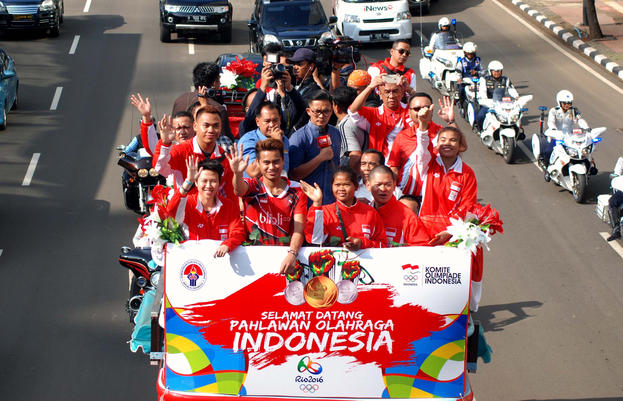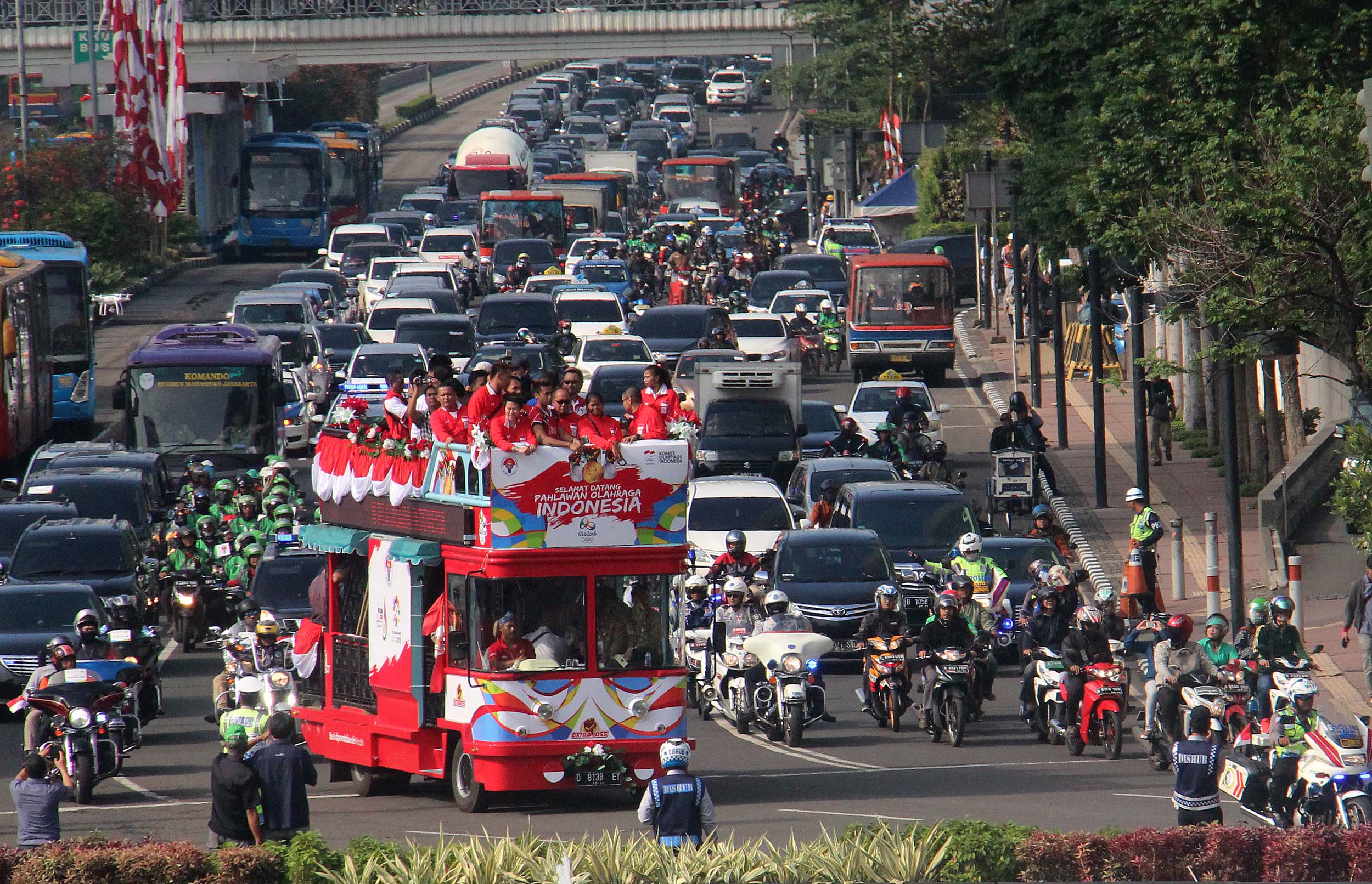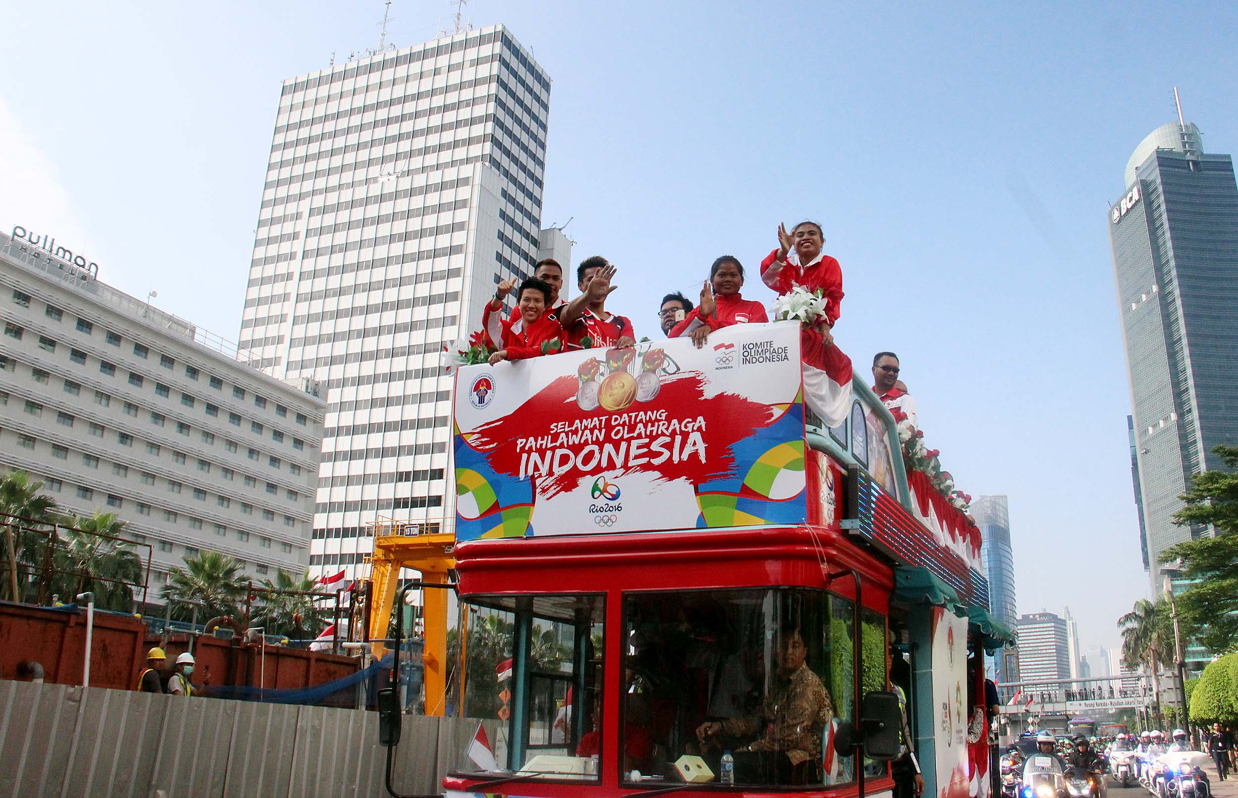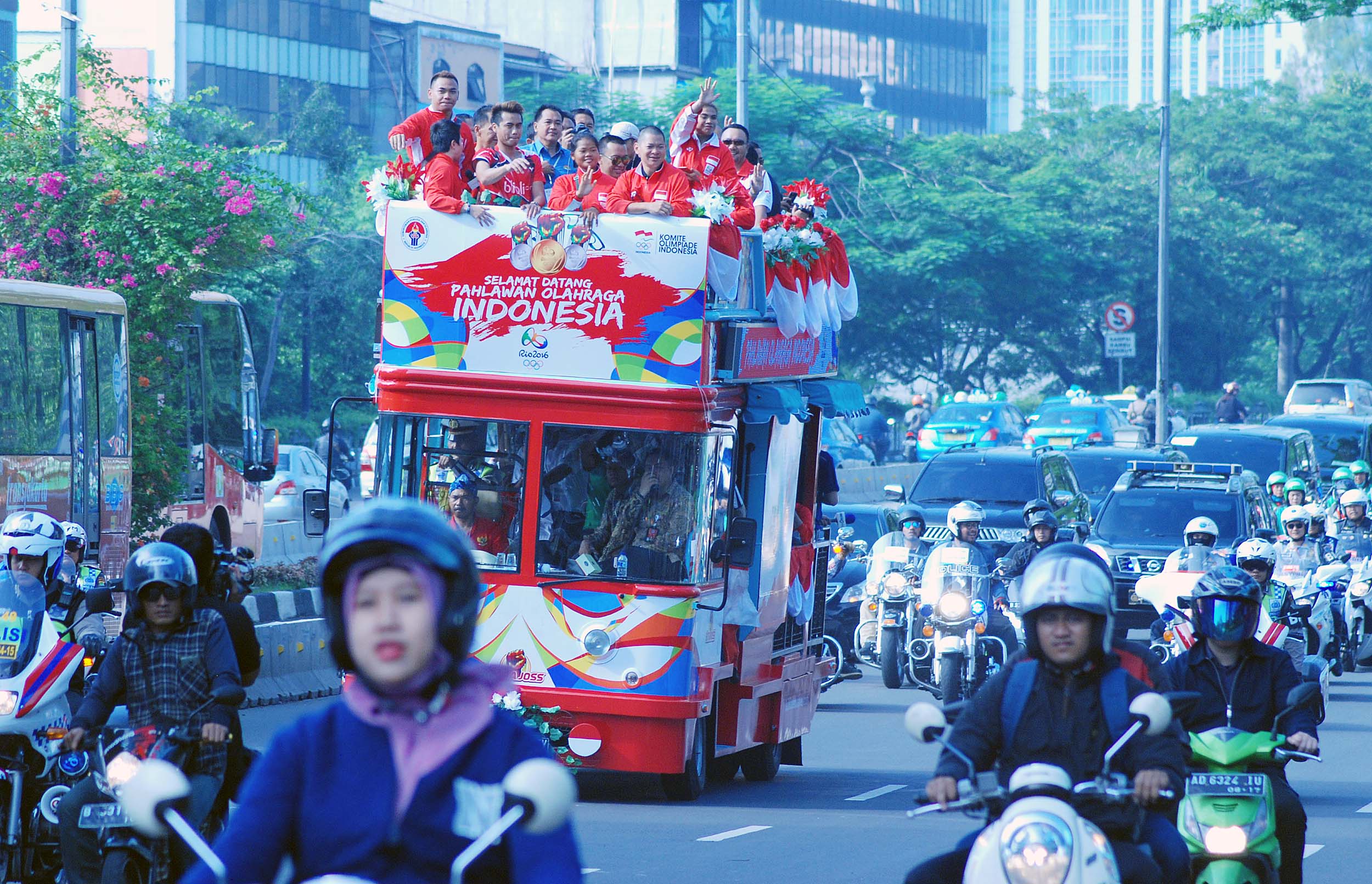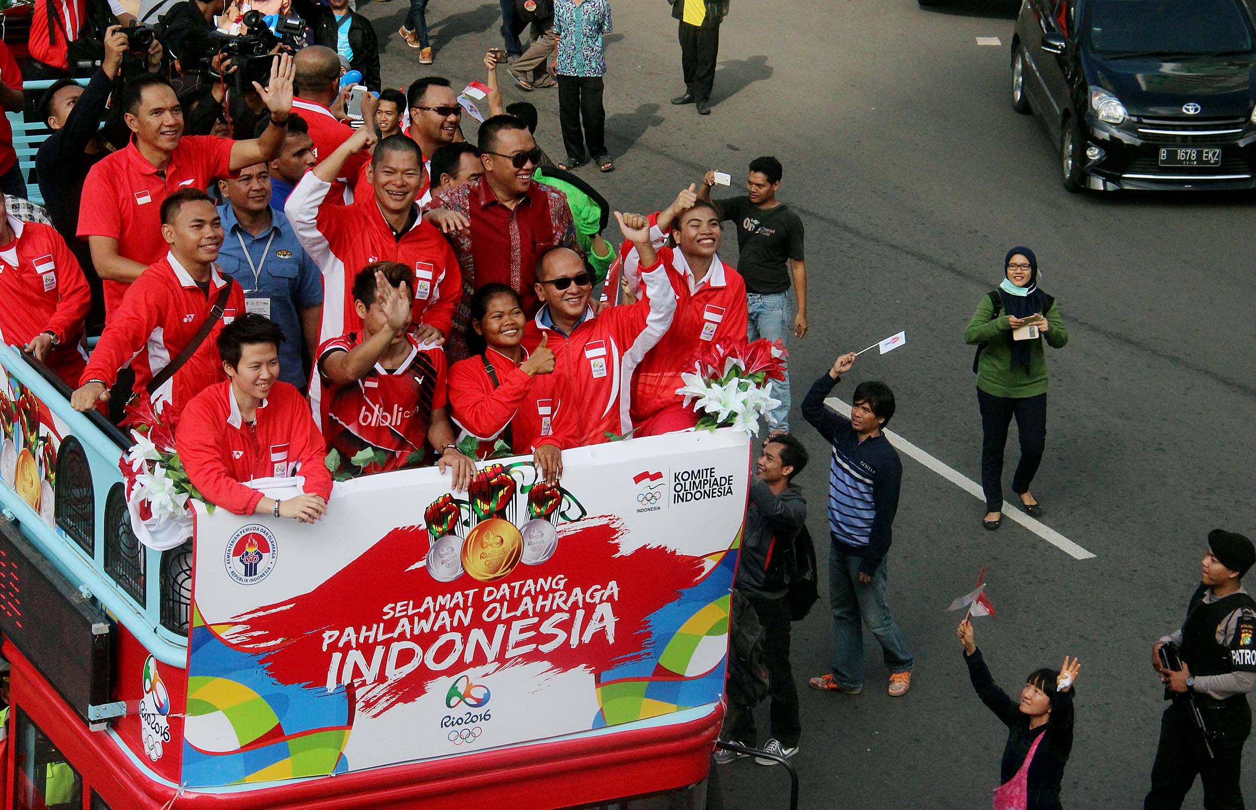 Pebulu tangkis ganda campuran peraih medali emas Olimpiade Brasil, Tontowi Ahmad dan Liliyana Natsir bersama sejumlah atlet dan offsial menaiki bus tingkat terbuka Bandros menuju Istana Negara di Bundaran HI Jakarta, Rabu (24/8/2016). Selanjutnya Tontowi Ahmad-Liliyana Natsir bersama sejumlah atlet dan offsial akan menuju Istana Negara untuk bertemu dengan Presiden Joko Widodo.
