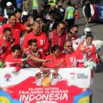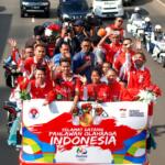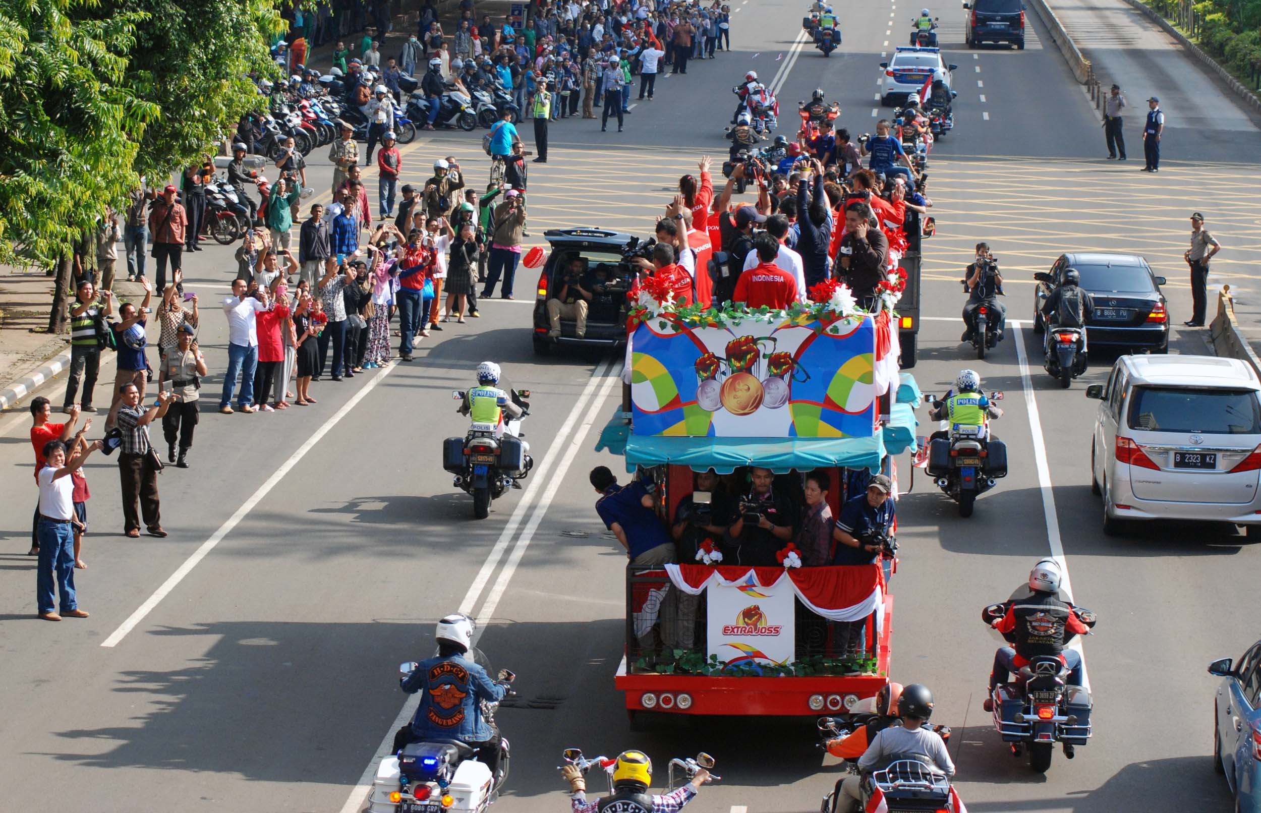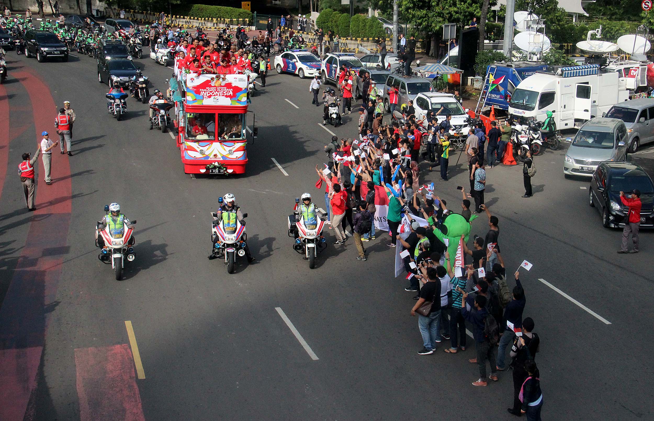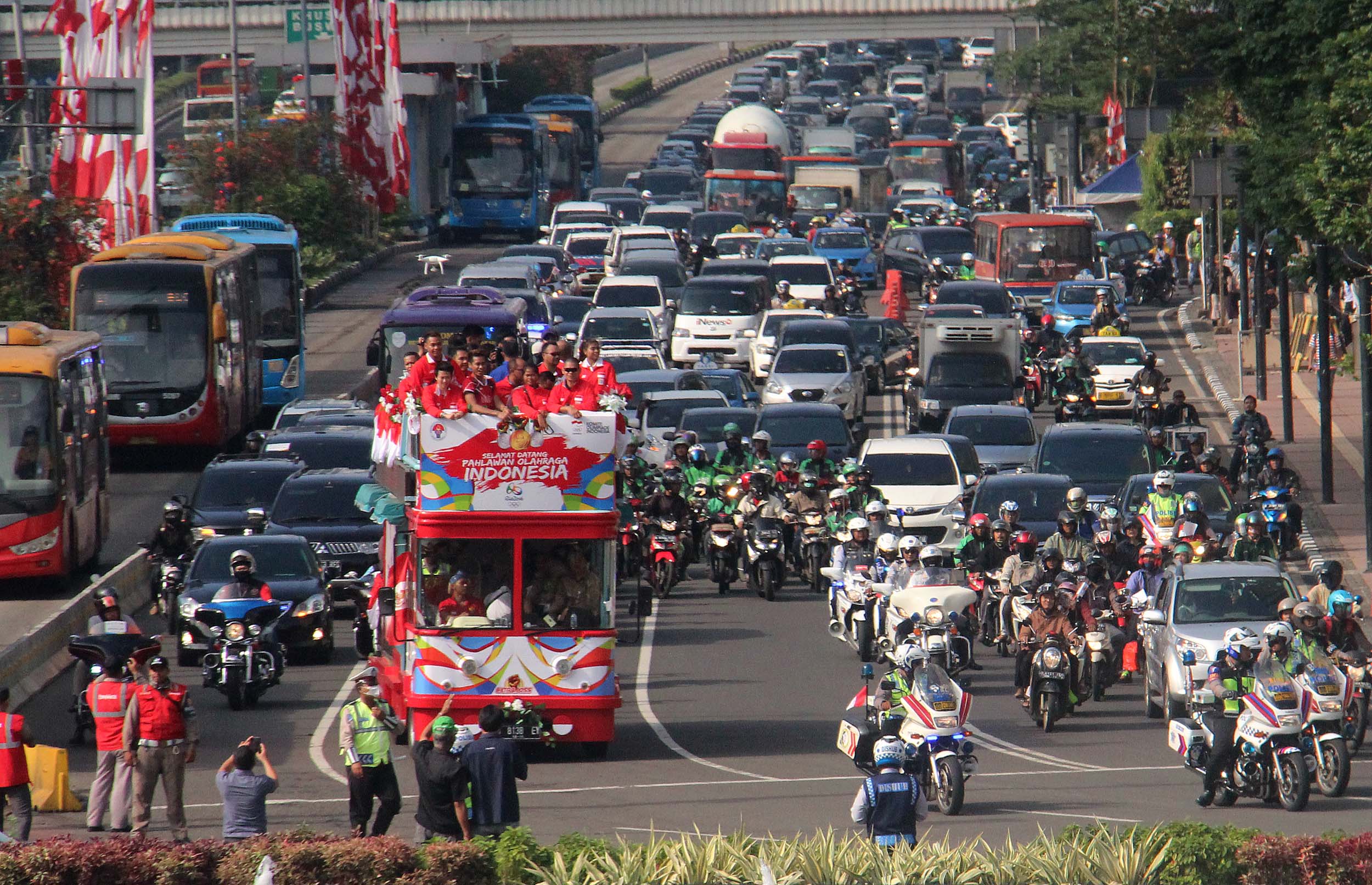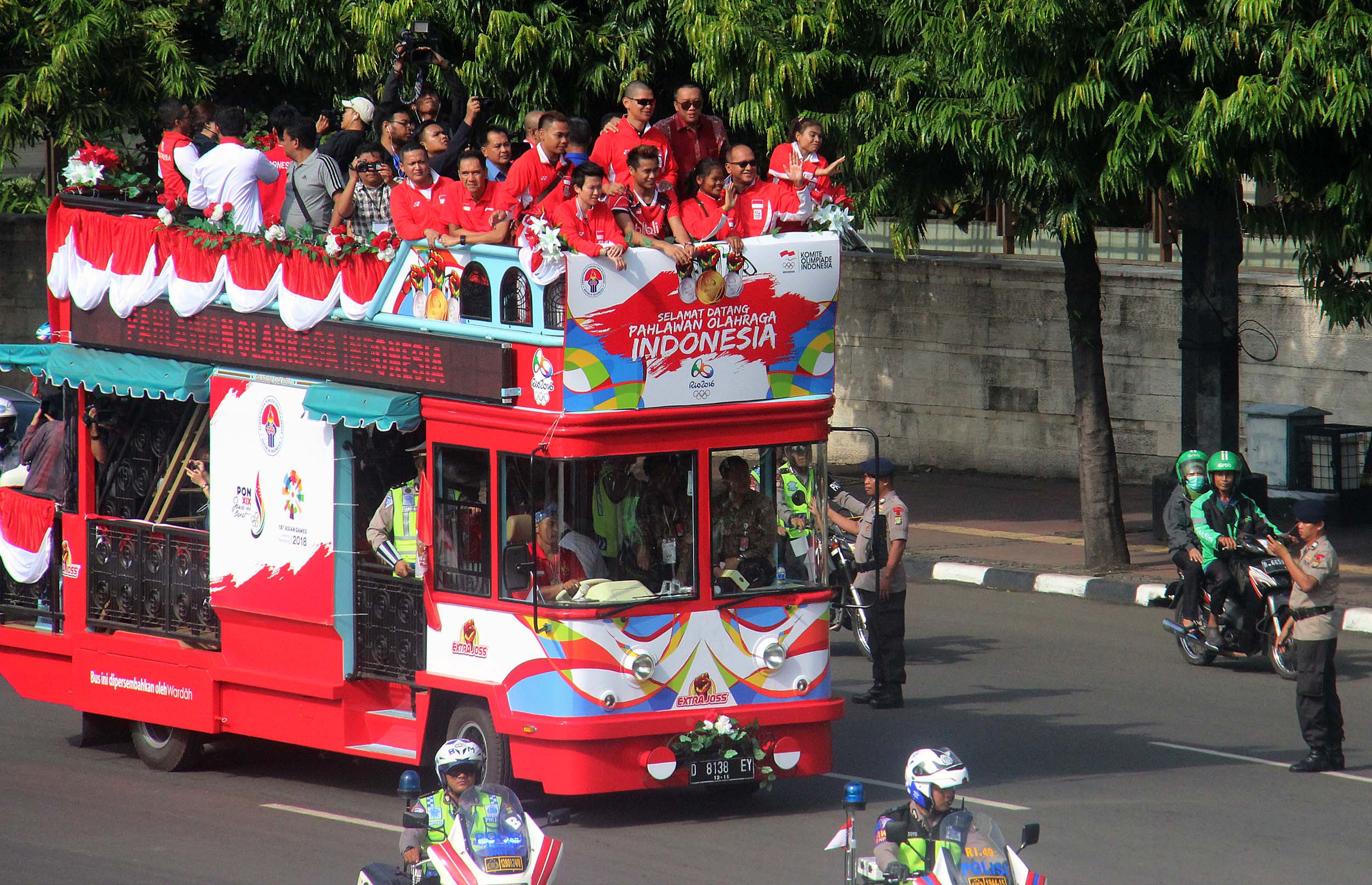 Pebulu tangkis ganda campuran peraih medali emas Olimpiade Brasil, Tontowi Ahmad dan Liliyana Natsir bersama sejumlah atlet dan offsial menaiki bus tingkat terbuka Bandros menuju Istana Negara di Bundaran HI Jakarta, Rabu (24/8/2016). Selanjutnya Tontowi Ahmad-Liliyana Natsir bersama sejumlah atlet dan offsial akan menuju Istana Negara untuk bertemu dengan Presiden Joko Widodo.