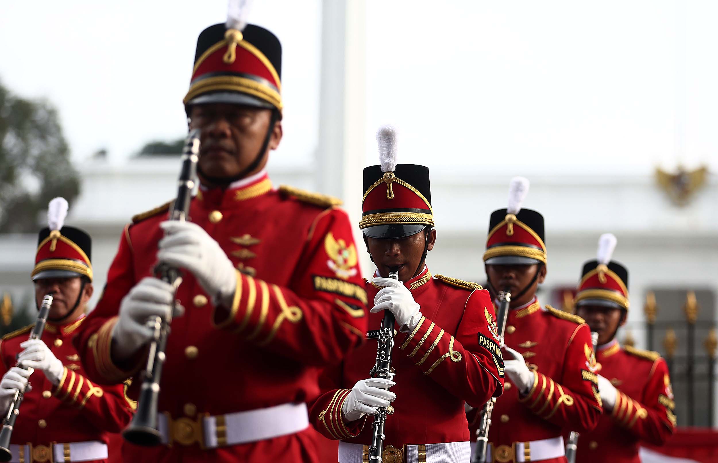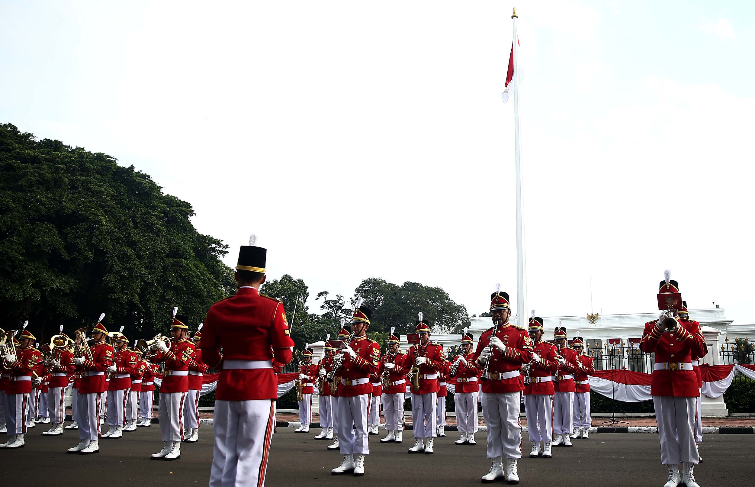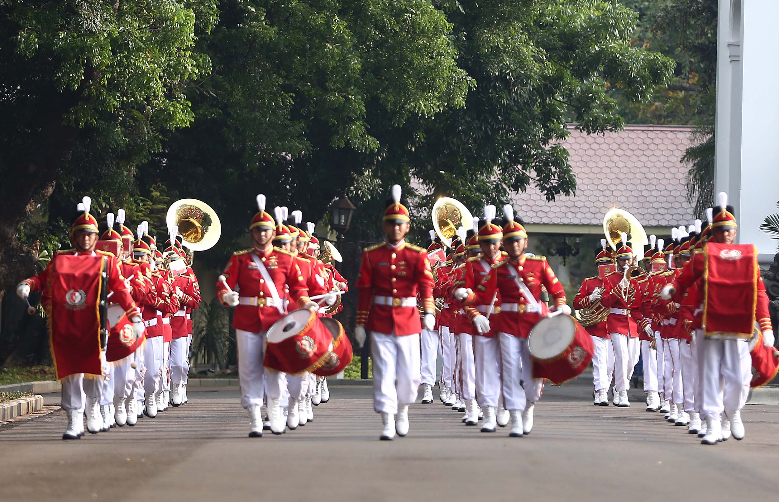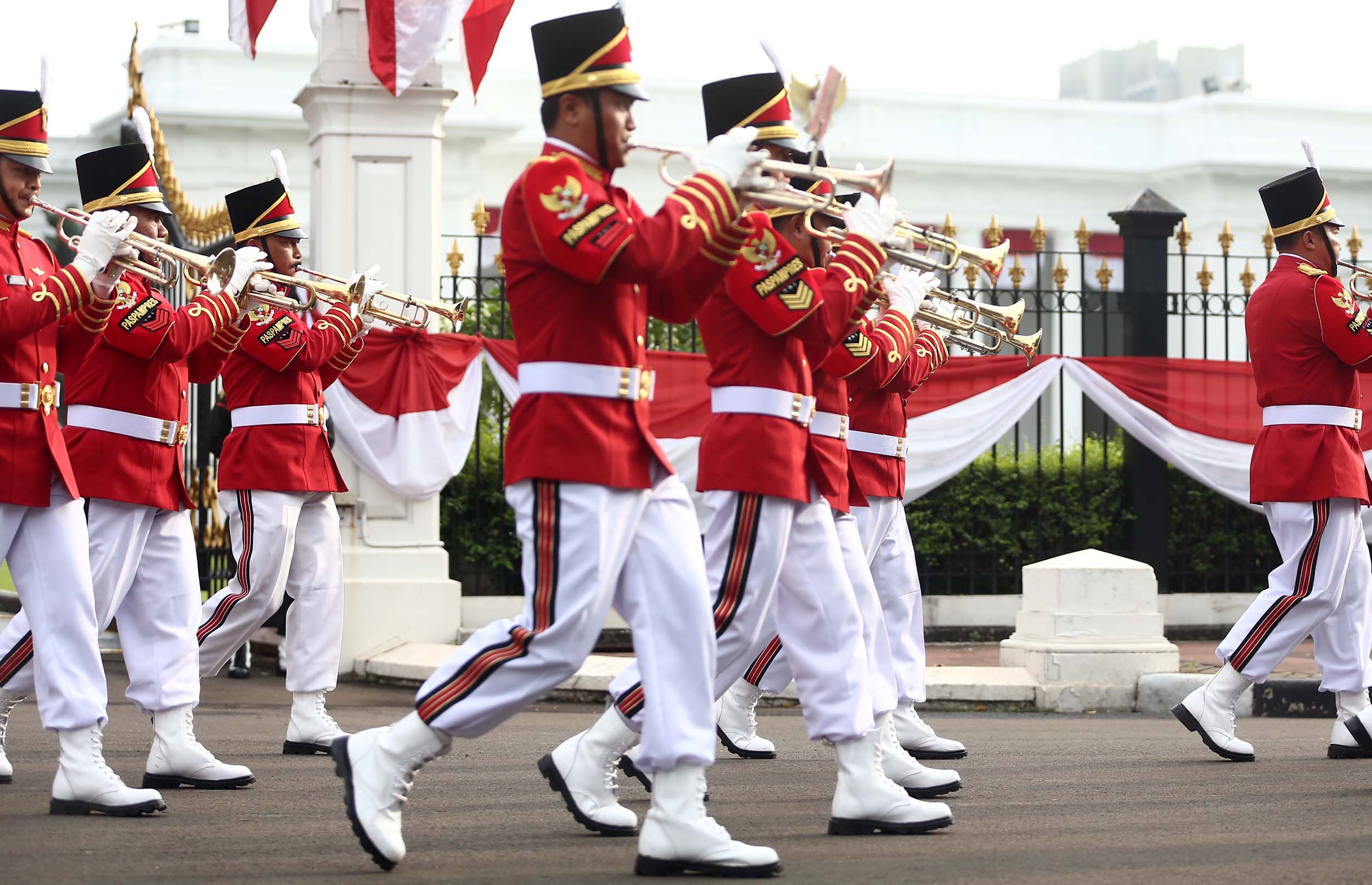 Aksi marching band Paspampres memainkan alat musik trompet dan baritone horn di halaman luar Istana Merdeka, Jakarta, Minggu (28/8/2016). Pergantian pasukan jaga Istana Kepresidenan menjadi objek atraksi wisata baru bagi warga.