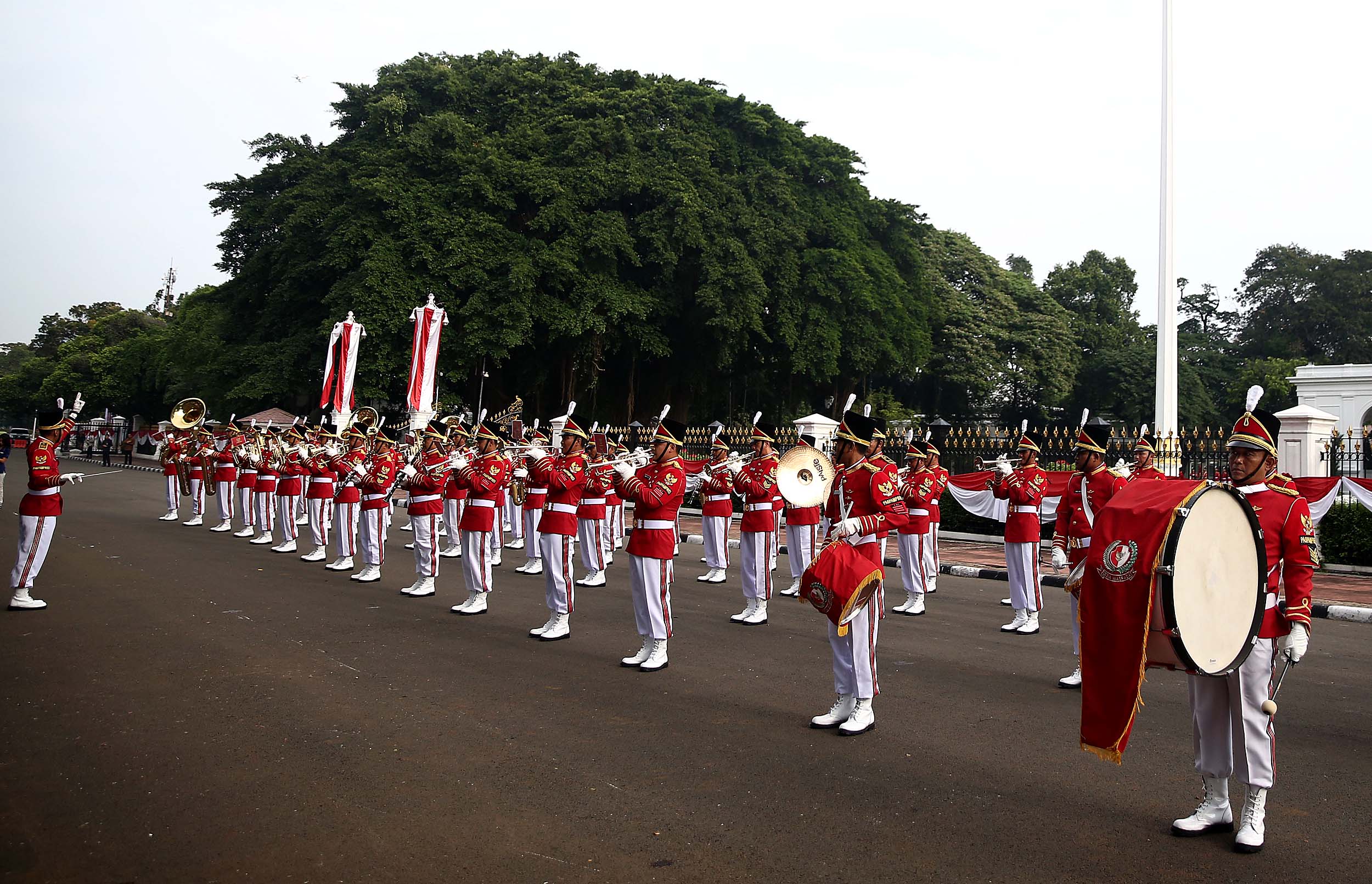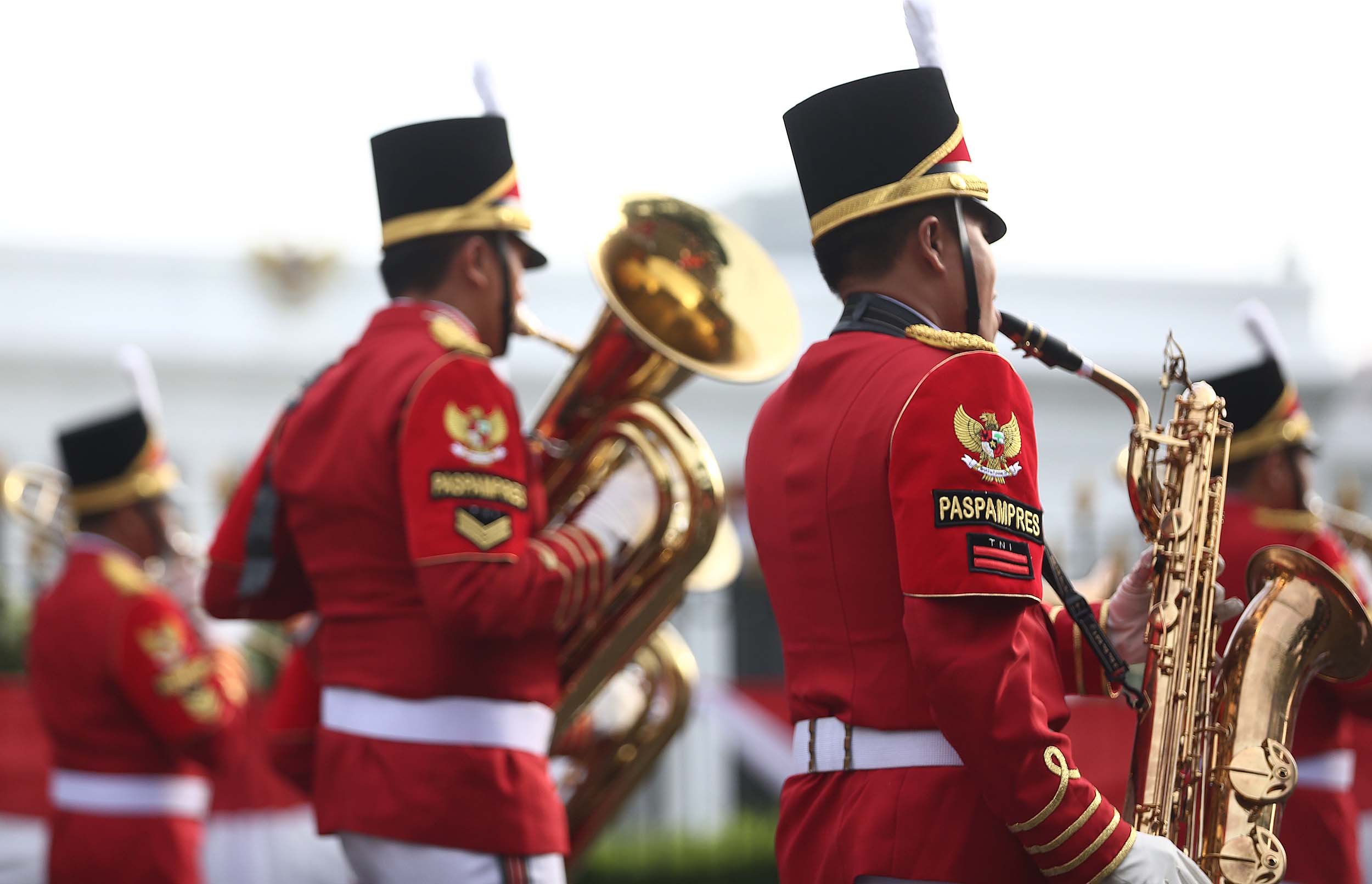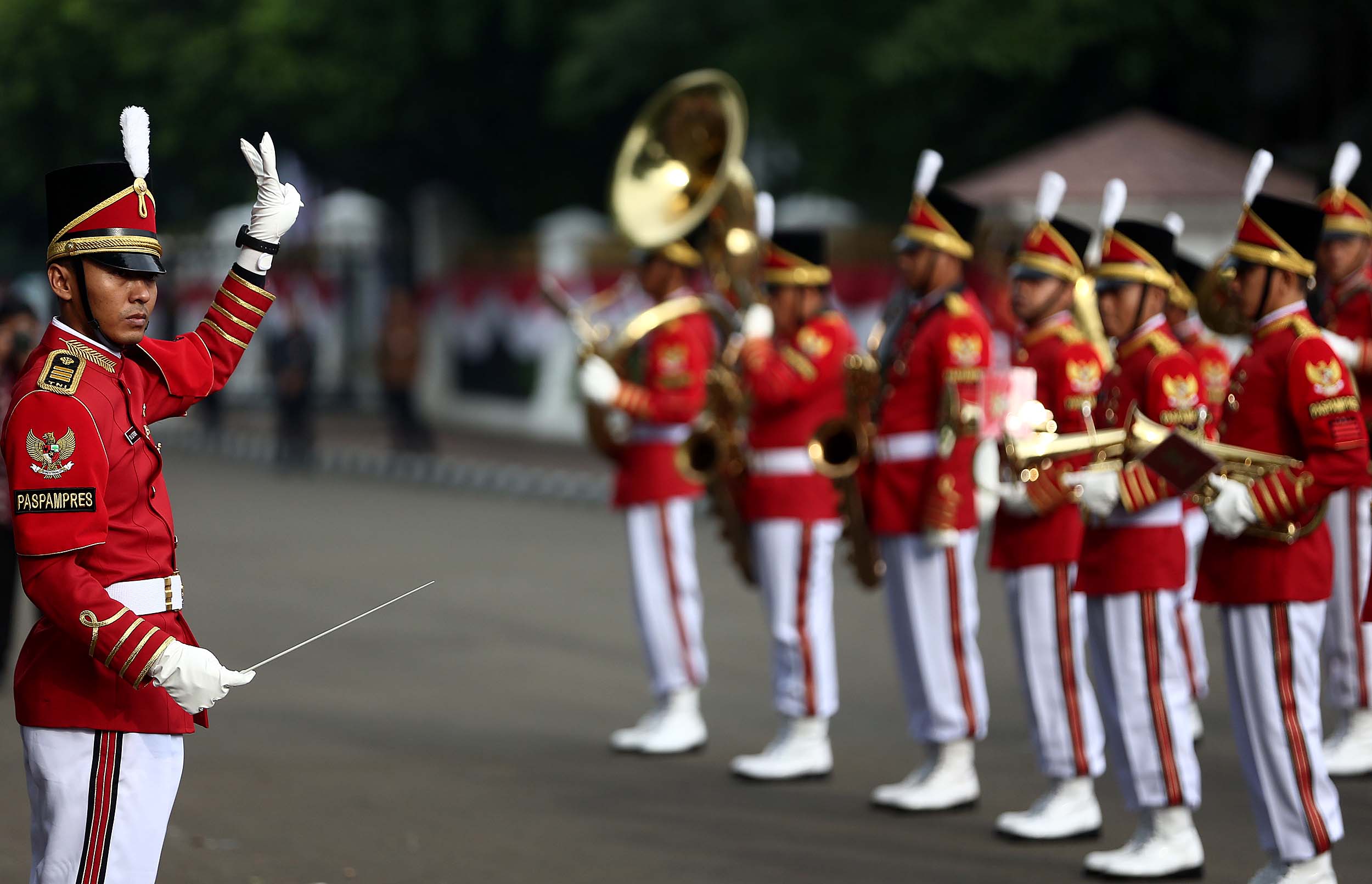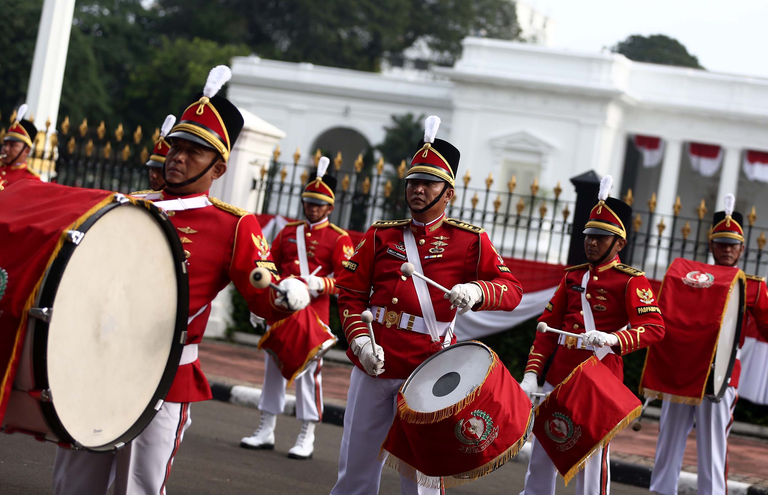 Aksi marching band Paspampres memainkan alat musik trompet dan baritone horn di halaman luar Istana Merdeka, Jakarta, Minggu (28/8/2016). Pergantian pasukan jaga Istana Kepresidenan menjadi objek atraksi wisata baru bagi warga.