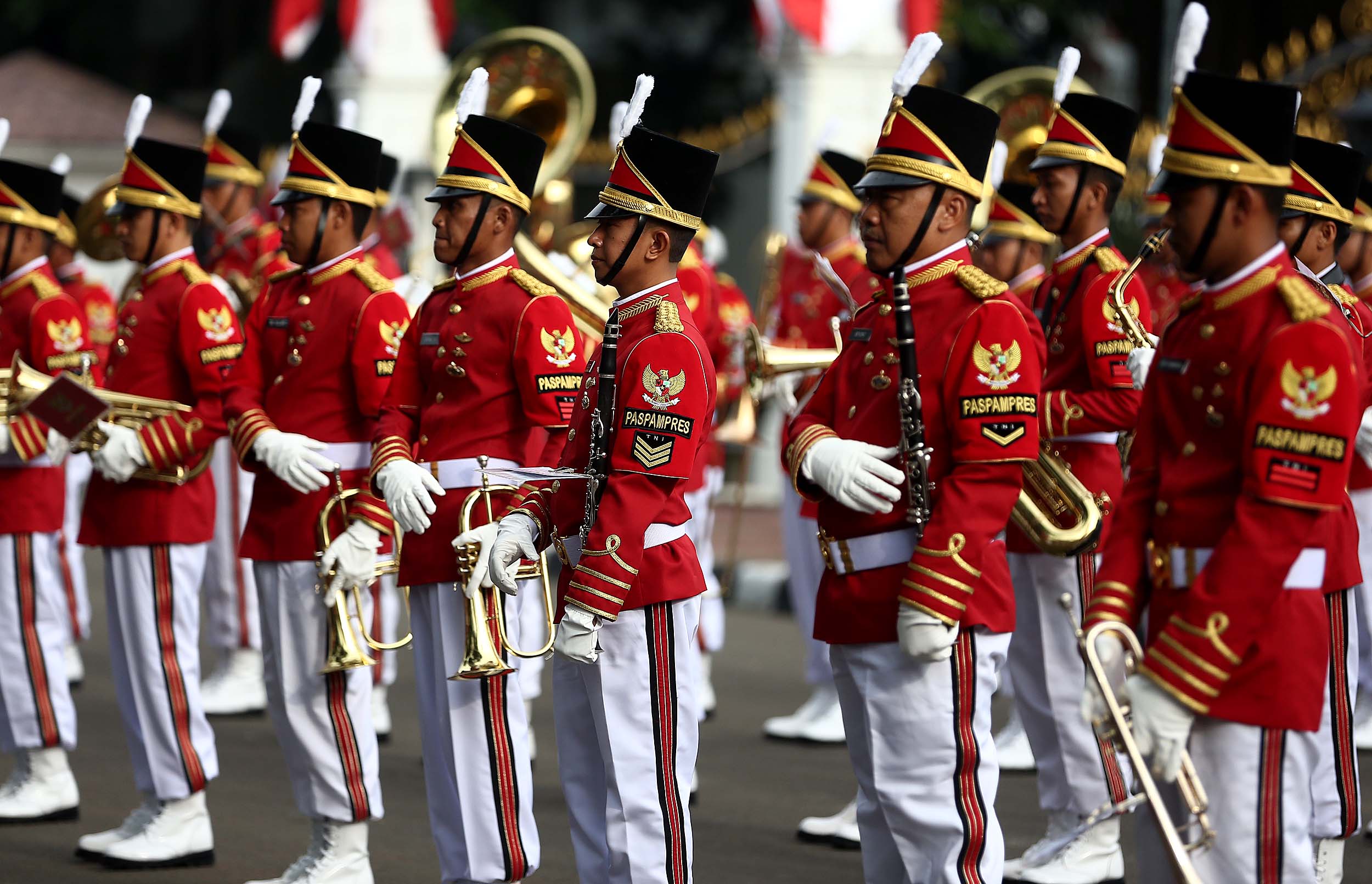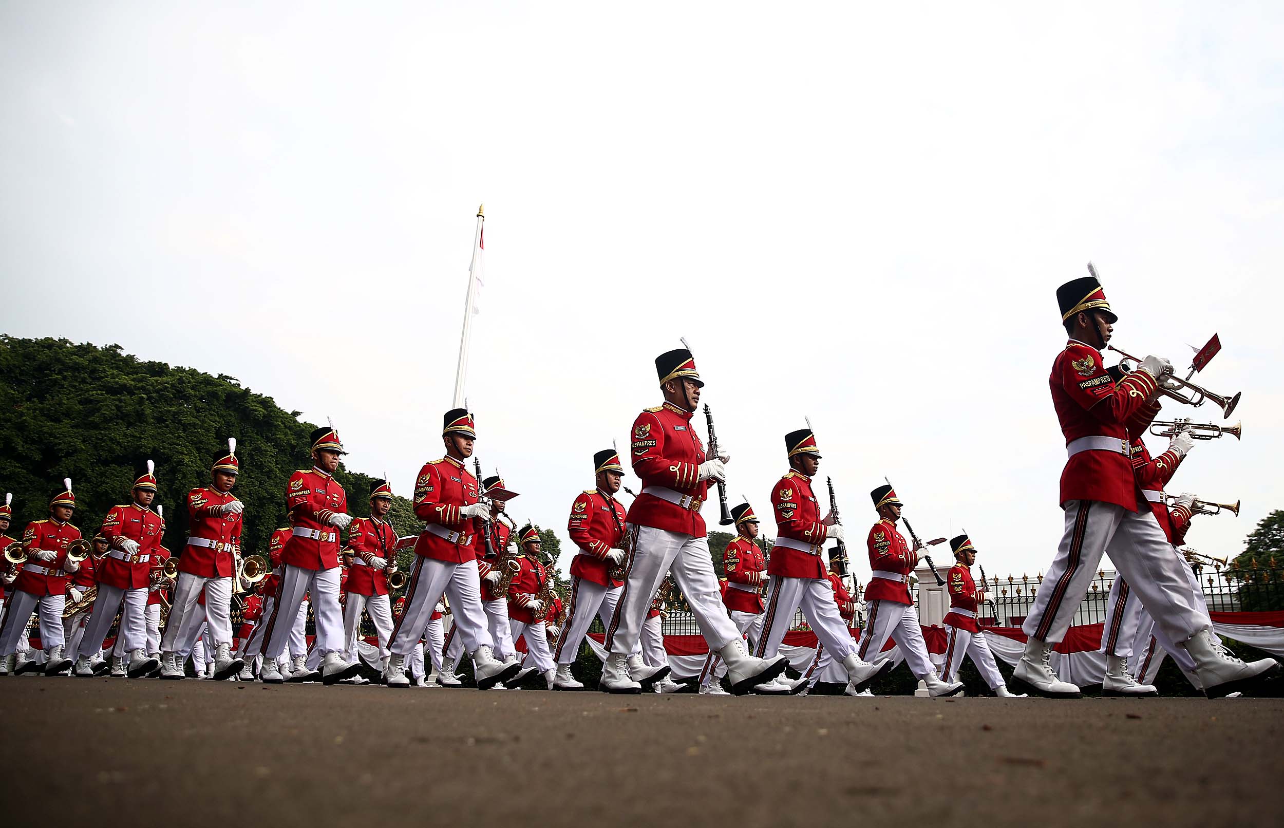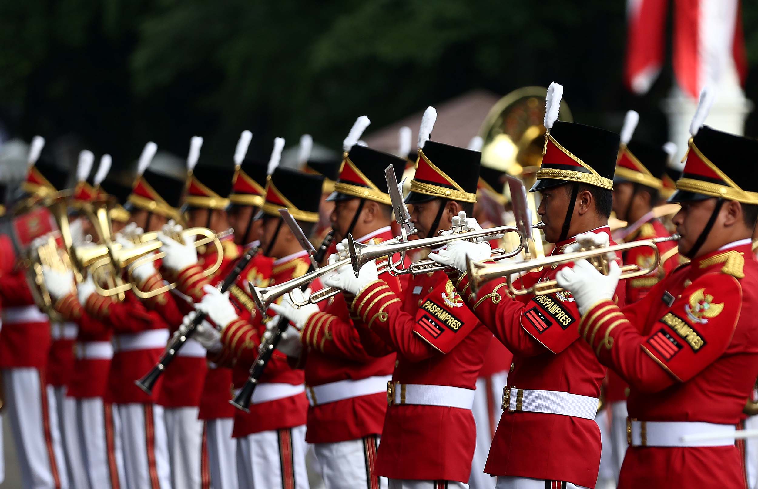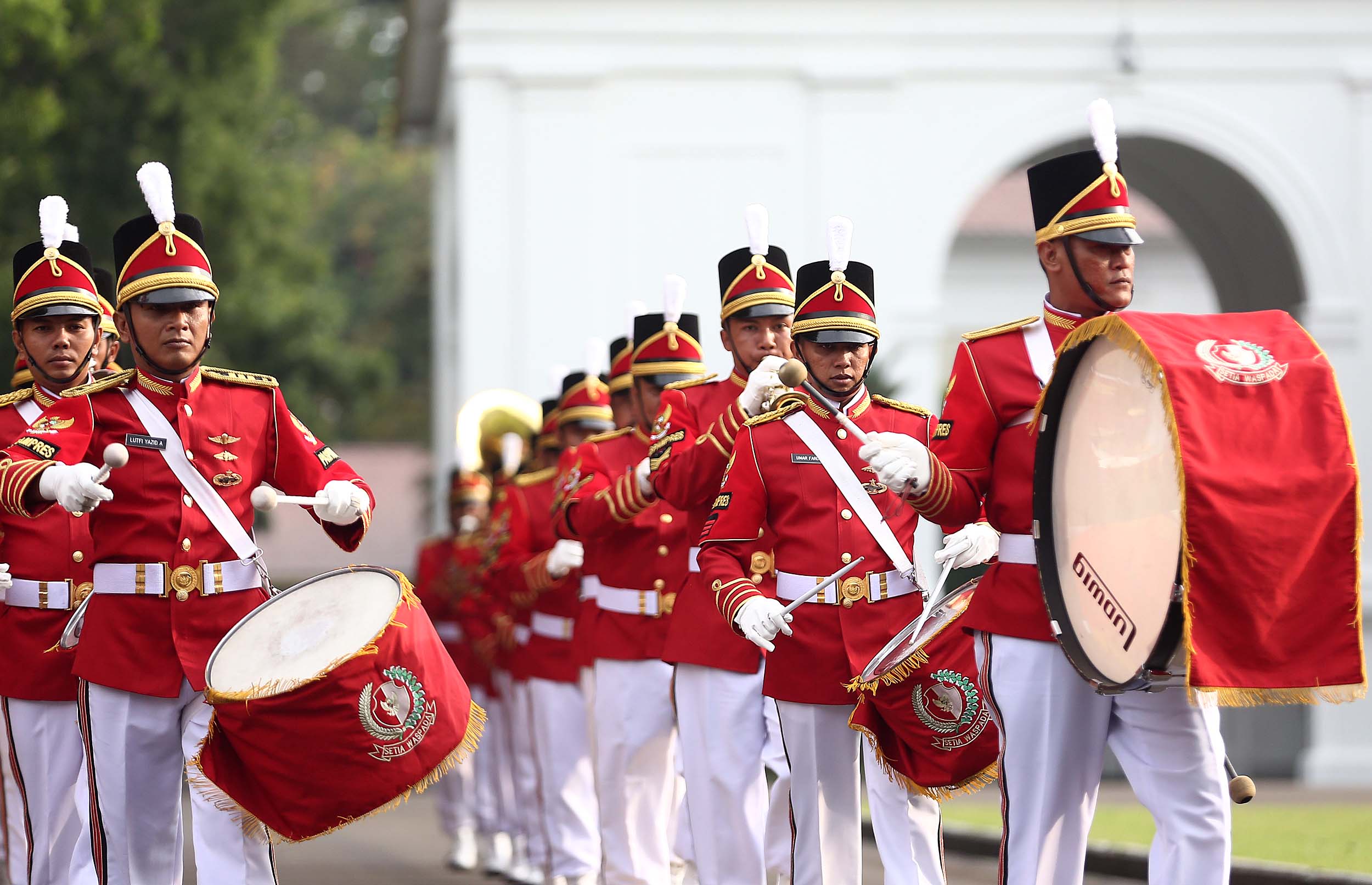 Aksi marching band Paspampres memainkan alat musik trompet dan baritone horn di halaman luar Istana Merdeka, Jakarta, Minggu (28/8/2016). Pergantian pasukan jaga Istana Kepresidenan menjadi objek atraksi wisata baru bagi warga.