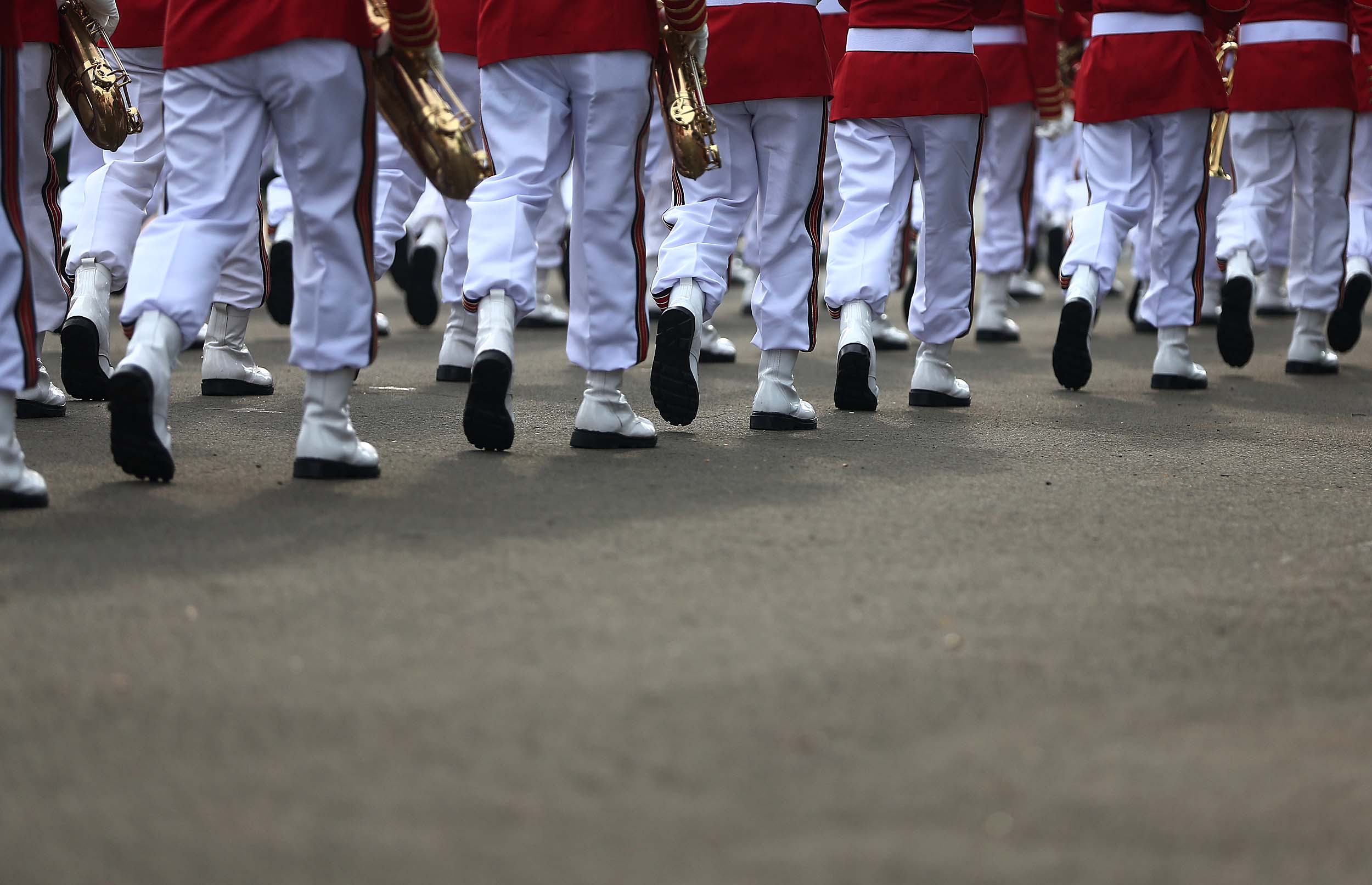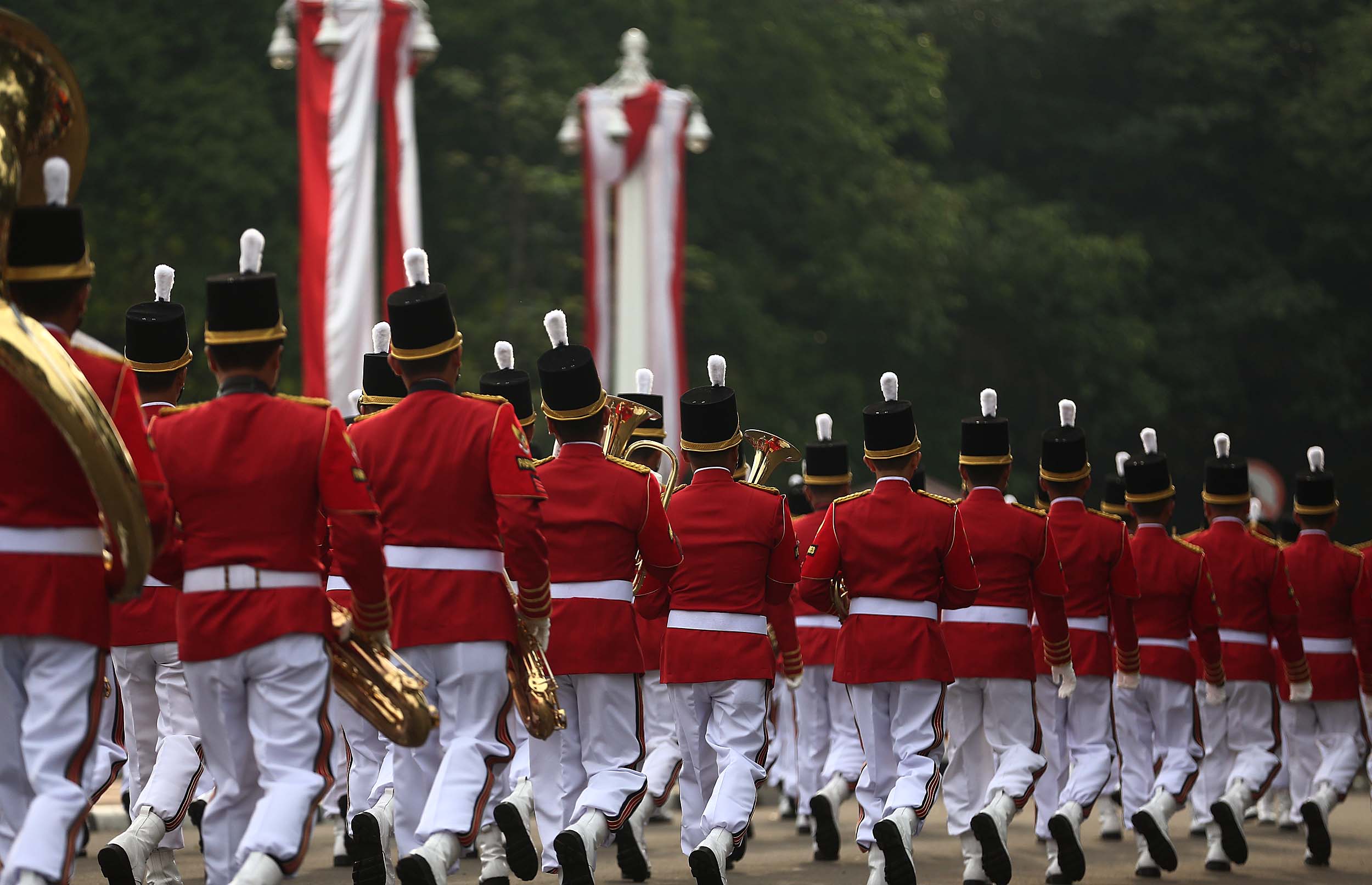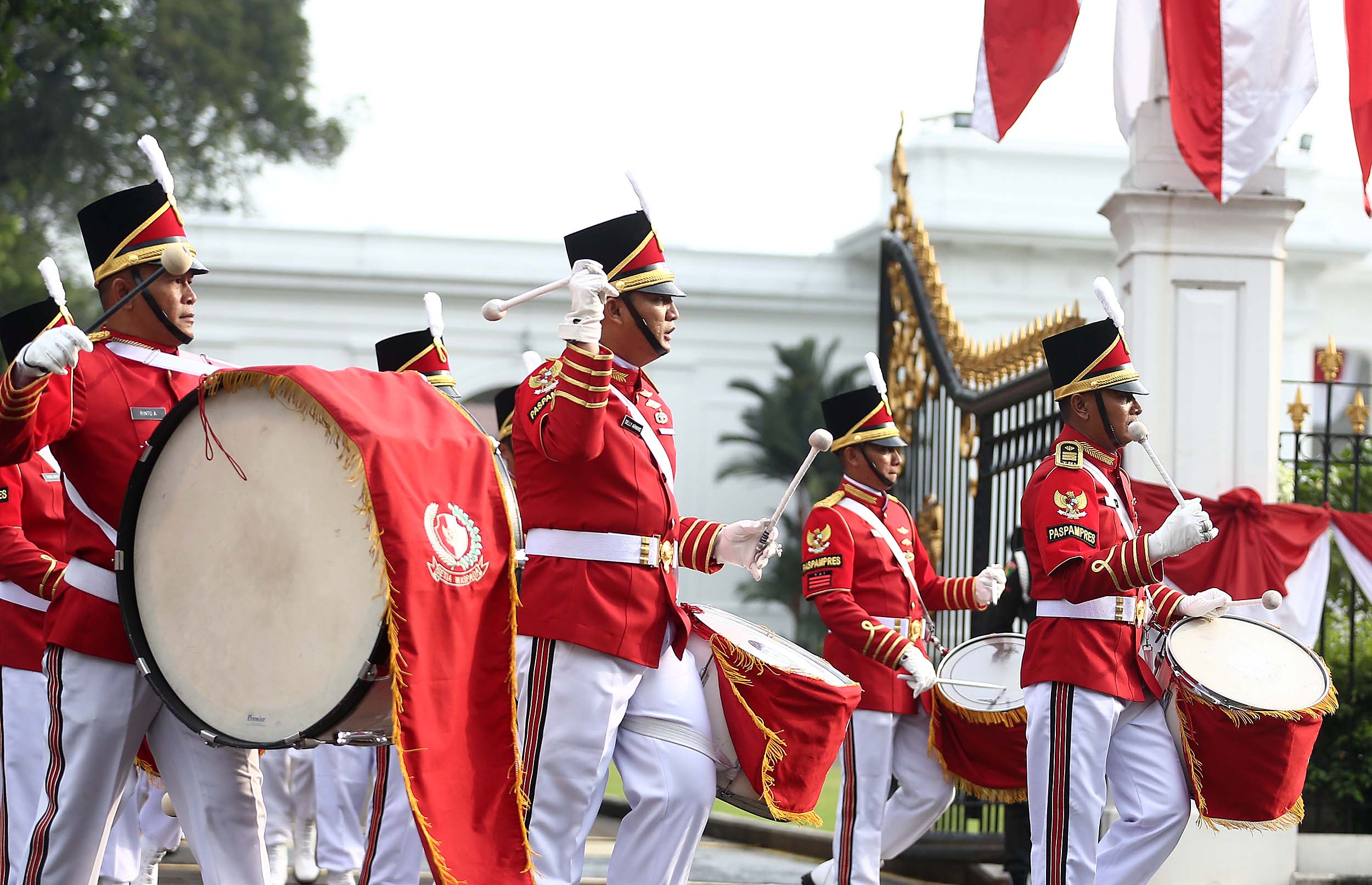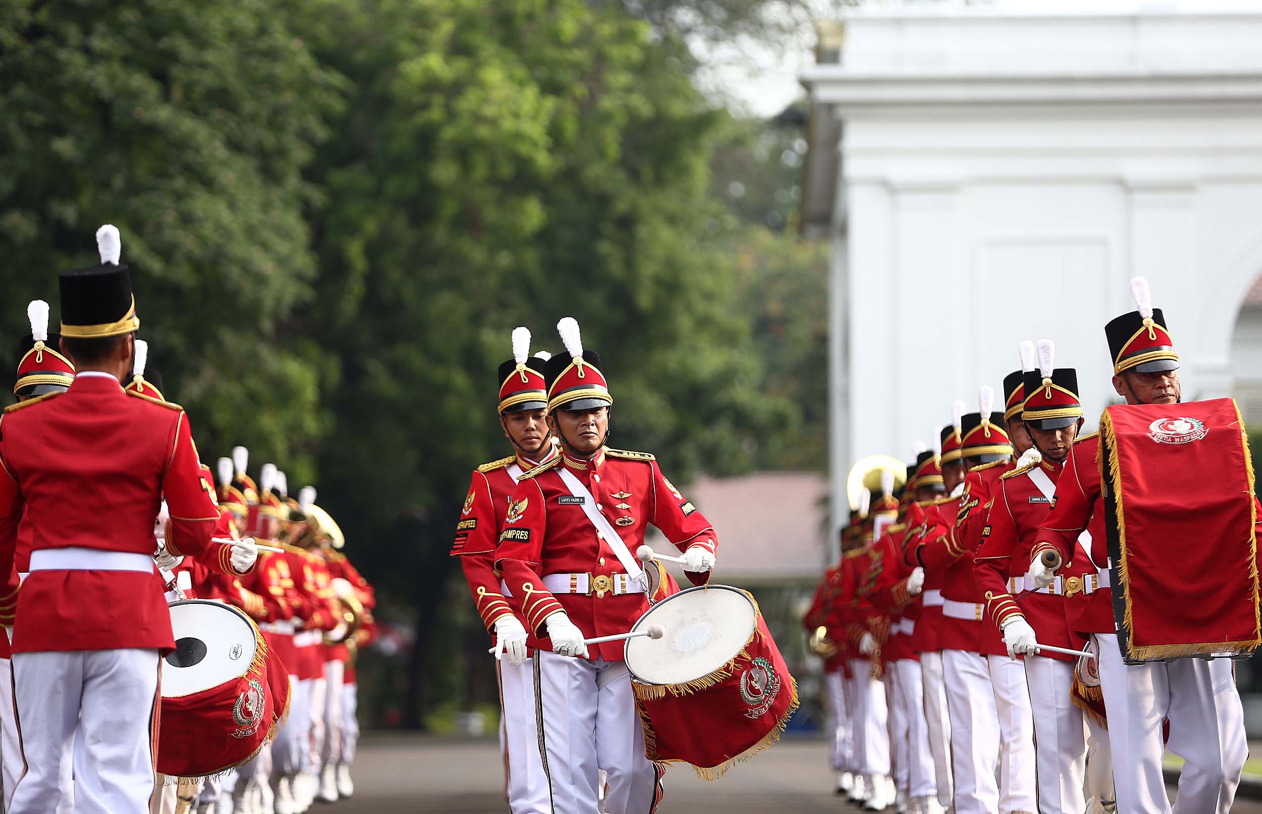 Aksi marching band Paspampres memainkan alat musik trompet dan baritone horn di halaman luar Istana Merdeka, Jakarta, Minggu (28/8/2016). Pergantian pasukan jaga Istana Kepresidenan menjadi objek atraksi wisata baru bagi warga.