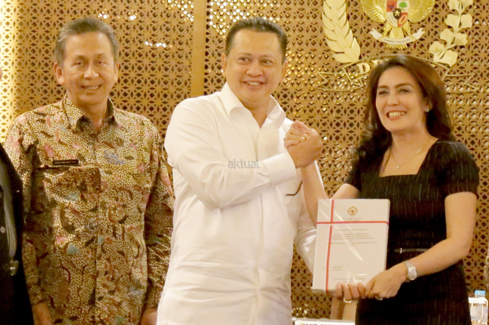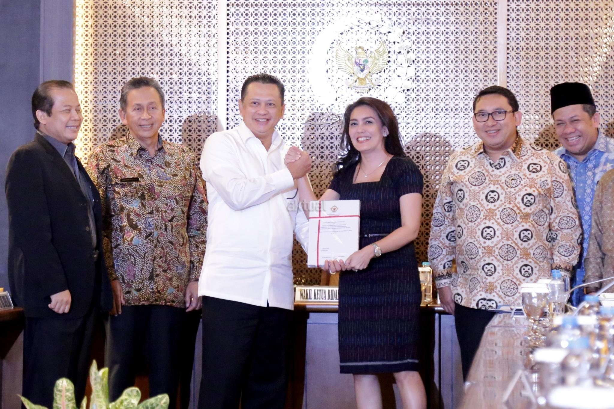 Ketua DPR RI Bambang Soesatyo menyerahkan laporan audit BPK soal kerugian negara kepada Ketua Pansus Pelindo II Rieke Diah Pitaloka didampingi Ketua BPK Moermahadi Soerja Djanegara di gedung Parlemen, Senayan, Jakarta, Rabu (31/1/2018). Badan Pemeriksa Keuangan (BPK) RI menyelesaikan audit investigatif terhadap proses pembangunan Terminal Peti Kemas (TPK) Koja Jakarta Utara. Temunnya adalah adanya sejumlah penyimpangan serta indikasi kerugian keuangan negara pada PT Pelindo II minimal sebesar USD 139,06 juta atau setara Rp 1,86 triliun. AKTUAL/Tino Oktaviano