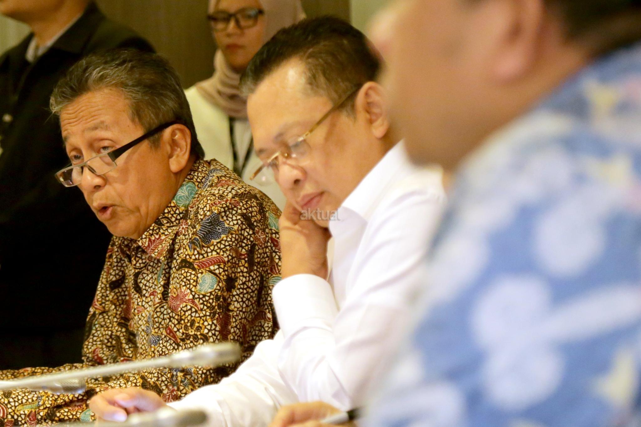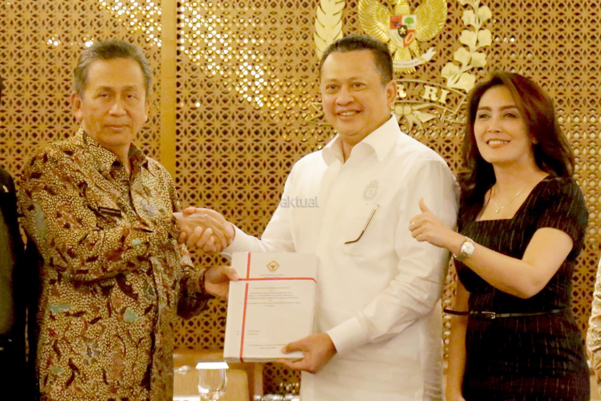 Ketua DPR RI Bambang Soesatyo didampingi Ketua Pansus Pelindo II Rieke Diah Pitaloka menerima laporan audit Badan Pemeriksa Keuangan (BPK) dari Ketua BPK Moermahadi Soerja Djanegara di gedung Parlemen, Senayan, Jakarta, Rabu (31/1/2018). Badan Pemeriksa Keuangan (BPK) RI menyelesaikan audit investigatif terhadap proses pembangunan Terminal Peti Kemas (TPK) Koja Jakarta Utara. Temunnya adalah adanya sejumlah penyimpangan serta indikasi kerugian keuangan negara pada PT Pelindo II minimal sebesar USD 139,06 juta atau setara Rp 1,86 triliun. AKTUAL/Tino Oktaviano
