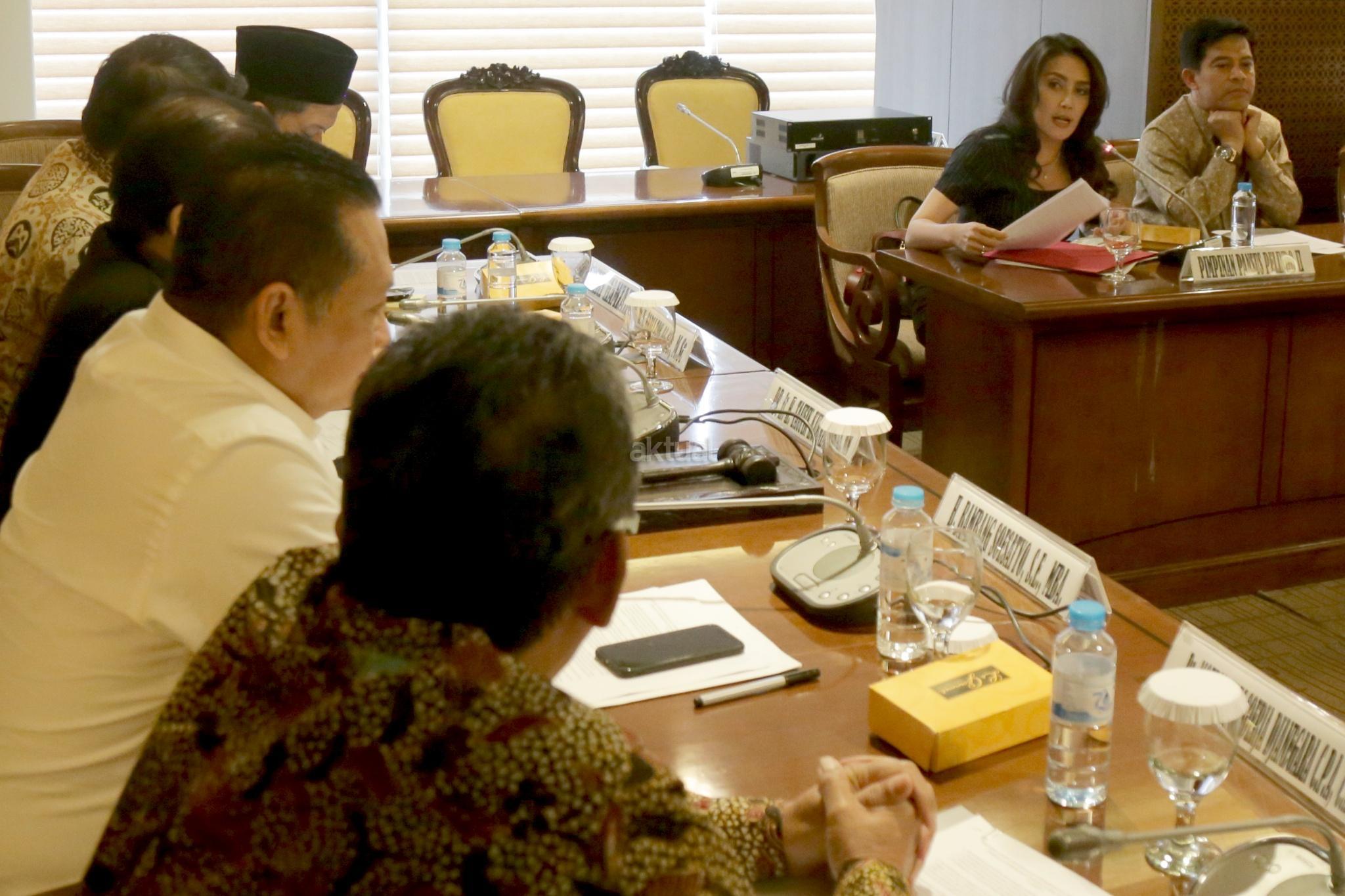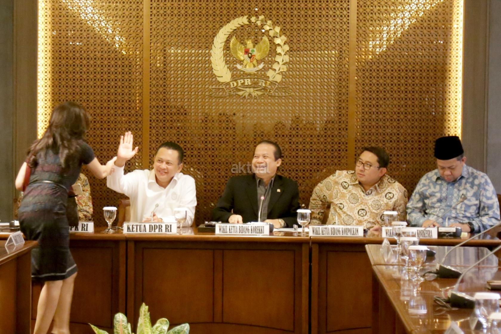 Ketua Pansus Pelindo II Rieke Diah Pitaloka menyapa Ketua DPR RI Bambang Soesatyo didampingi Wakil Ketua DPR Taufik Kurniawan, Fadli Zon, Fahri Hamzah di gedung Parlemen, Senayan, Jakarta, Rabu (31/1/2018). Badan Pemeriksa Keuangan (BPK) RI menyelesaikan audit investigatif terhadap proses pembangunan Terminal Peti Kemas (TPK) Koja Jakarta Utara. Temunnya adalah adanya sejumlah penyimpangan serta indikasi kerugian keuangan negara pada PT Pelindo II minimal sebesar USD 139,06 juta atau setara Rp 1,86 triliun. AKTUAL/Tino Oktaviano