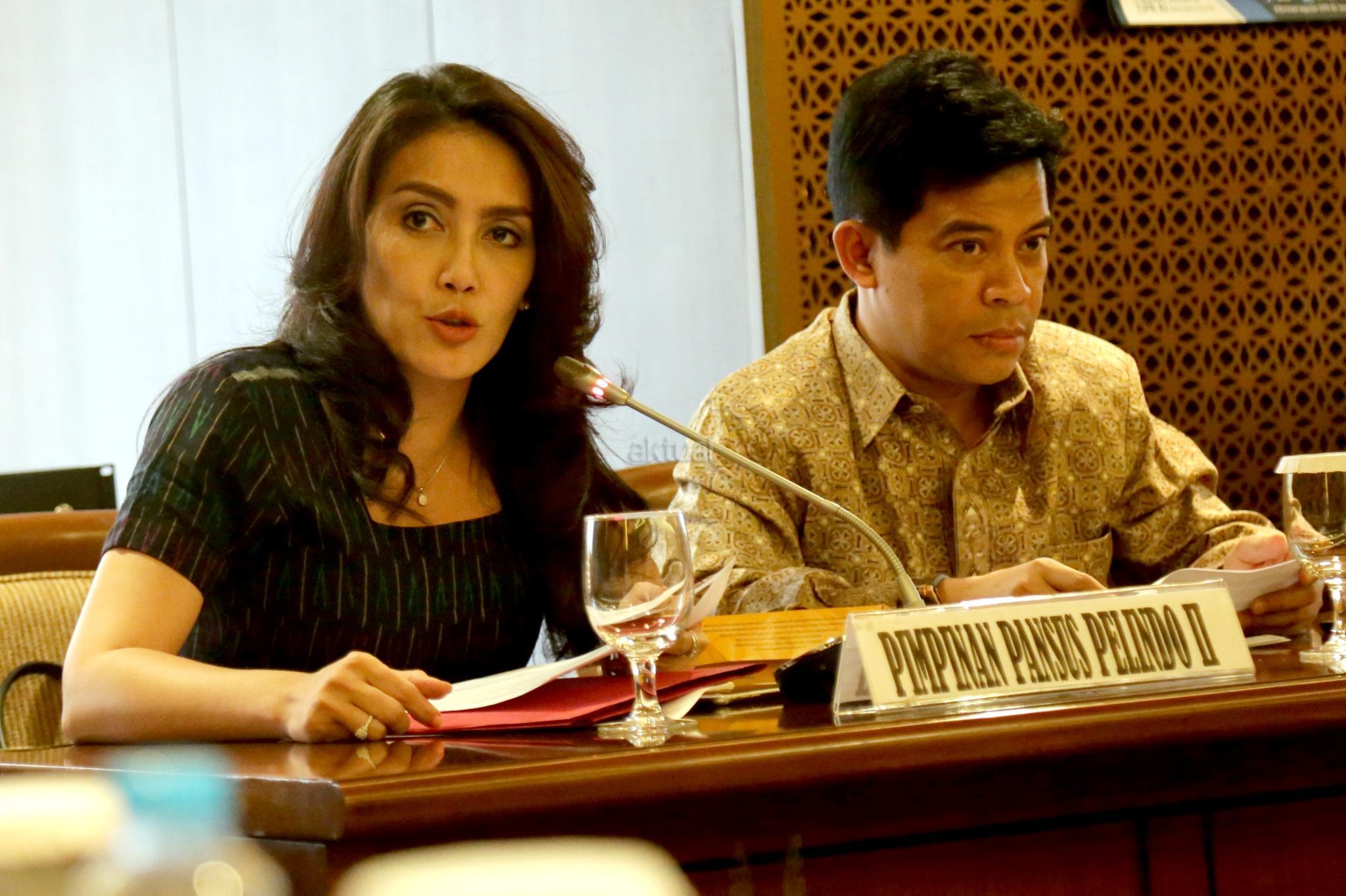 Ketua Pansus Pelindo II Rieke Diah Pitaloka menyampaikan keterangan kepada Ketua DPR RI Bambang Soesatyo dan Ketua BPK Moermahadi Soerja Djanegara saat laporan audit BPK temuan indikasi kerugian negara di gedung Parlemen, Senayan, Jakarta, Rabu (31/1/2018). Badan Pemeriksa Keuangan (BPK) RI menyelesaikan audit investigatif terhadap proses pembangunan Terminal Peti Kemas (TPK) Koja Jakarta Utara. Temunnya adalah adanya sejumlah penyimpangan serta indikasi kerugian keuangan negara pada PT Pelindo II minimal sebesar USD 139,06 juta atau setara Rp 1,86 triliun. AKTUAL/Tino Oktaviano