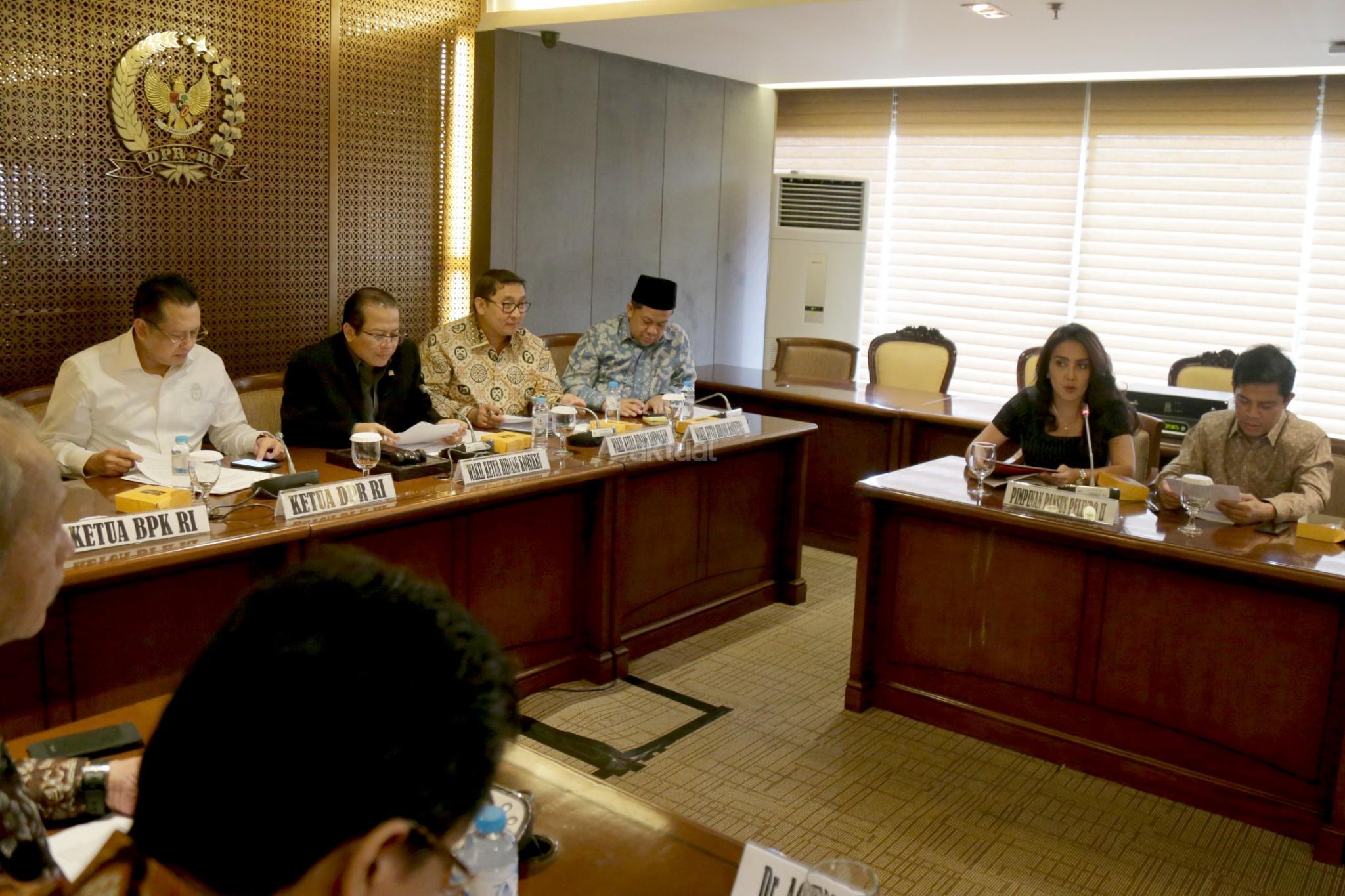 Ketua DPR RI Bambang Soesatyo didampingi Wakil Ketua DPR Taufik Kurniawan, Fadli Zon, Fahri Hamzah dan Ketua Pansus Pelindo II Rieke Diah Pitaloka menerima laporan audit Badan Pemeriksa Keuangan (BPK) dari Ketua BPK Moermahadi Soerja Djanegara di gedung Parlemen, Senayan, Jakarta, Rabu (31/1/2018). Badan Pemeriksa Keuangan (BPK) RI menyelesaikan audit investigatif terhadap proses pembangunan Terminal Peti Kemas (TPK) Koja Jakarta Utara. Temunnya adalah adanya sejumlah penyimpangan serta indikasi kerugian keuangan negara pada PT Pelindo II minimal sebesar USD 139,06 juta atau setara Rp 1,86 triliun. AKTUAL/Tino Oktaviano