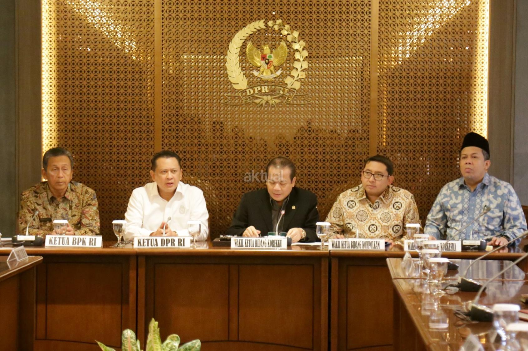 Dari kiri ke kanan Ketua BPK Moermahadi Soerja Djanegara, Ketua DPR RI Bambang Soesatyo, Wakil Ketua DPR Taufik Kurniawan, Fadli Zon dan Fahri Hamzah saat menyampaika laporan audit Badan Pemeriksa Keuangan (BPK) temuan indikasi kerugian negara di gedung Parlemen, Senayan, Jakarta, Rabu (31/1/2018). Badan Pemeriksa Keuangan (BPK) RI menyelesaikan audit investigatif terhadap proses pembangunan Terminal Peti Kemas (TPK) Koja Jakarta Utara. Temunnya adalah adanya sejumlah penyimpangan serta indikasi kerugian keuangan negara pada PT Pelindo II minimal sebesar USD 139,06 juta atau setara Rp 1,86 triliun. AKTUAL/Tino Oktaviano