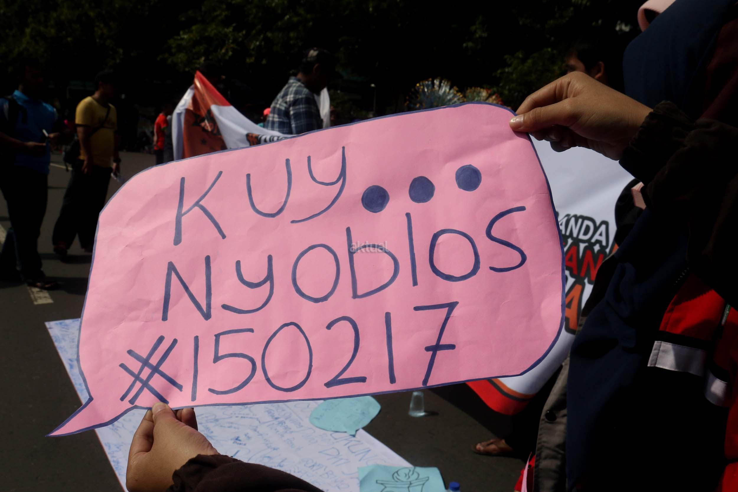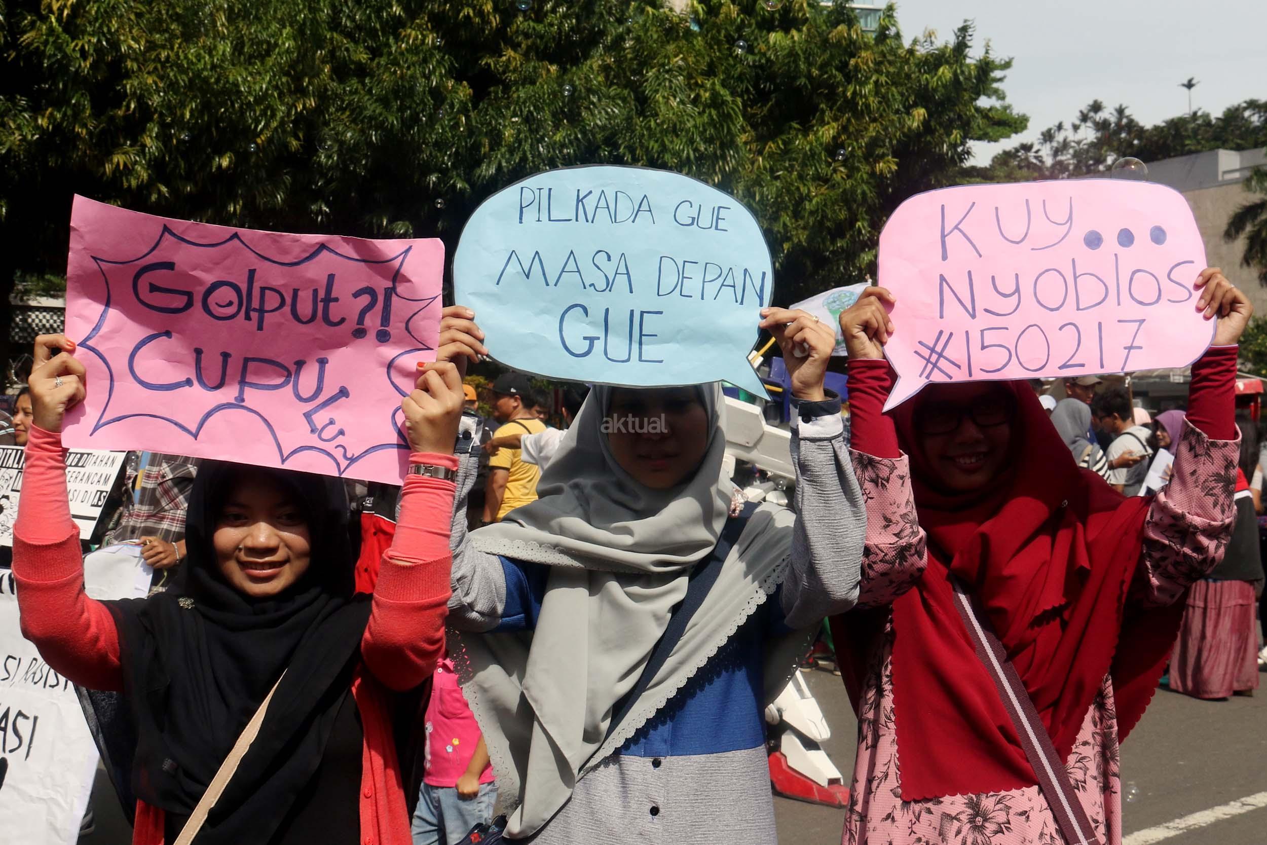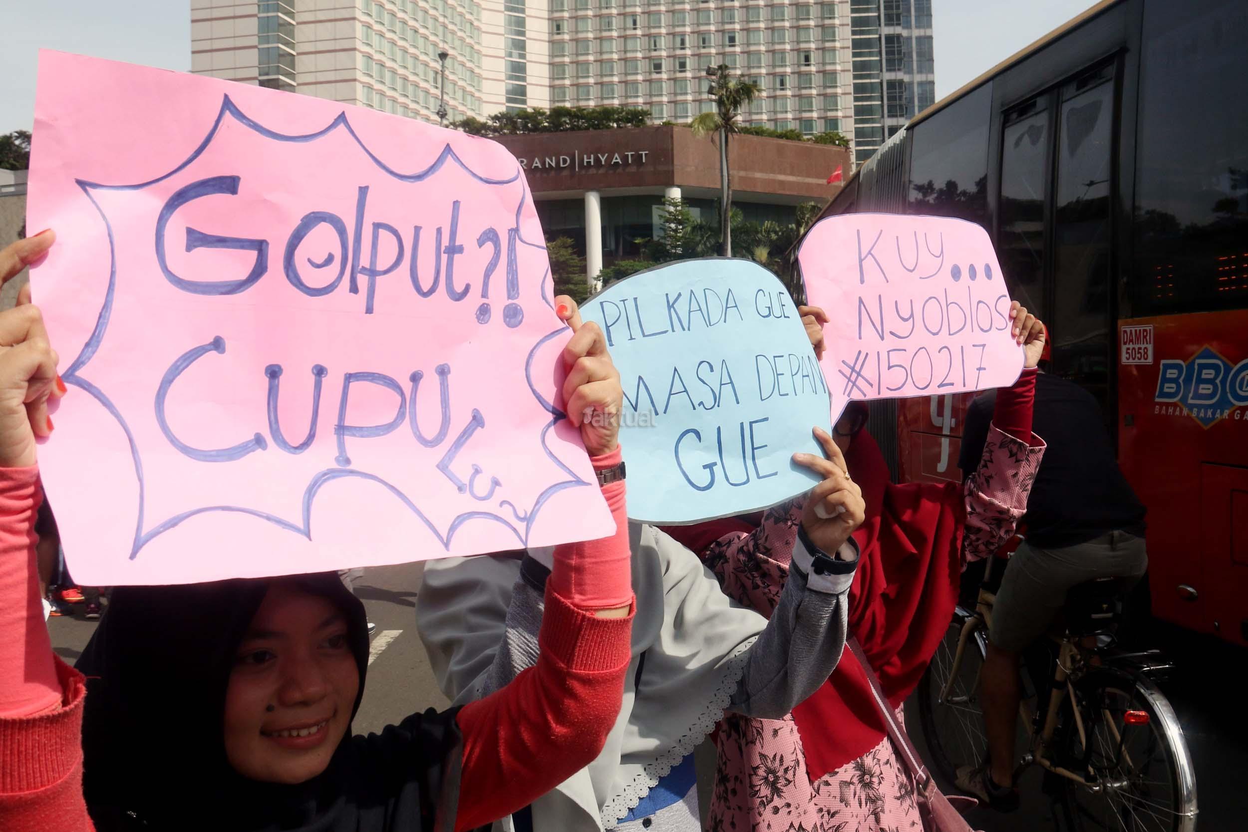 Sejumlah mahasiswa yang tergabung dalam Kesatuan Mahasiswa Muslim Indonesia melakukan aksi kawal Pilkada DKI 2017 di Jakarta, Minggu (5/2/2017). Dalam aksi tersebut mereka mengajak masyarakat DKI mengawal Pilkada DKI. AKTUAL/Munzir
