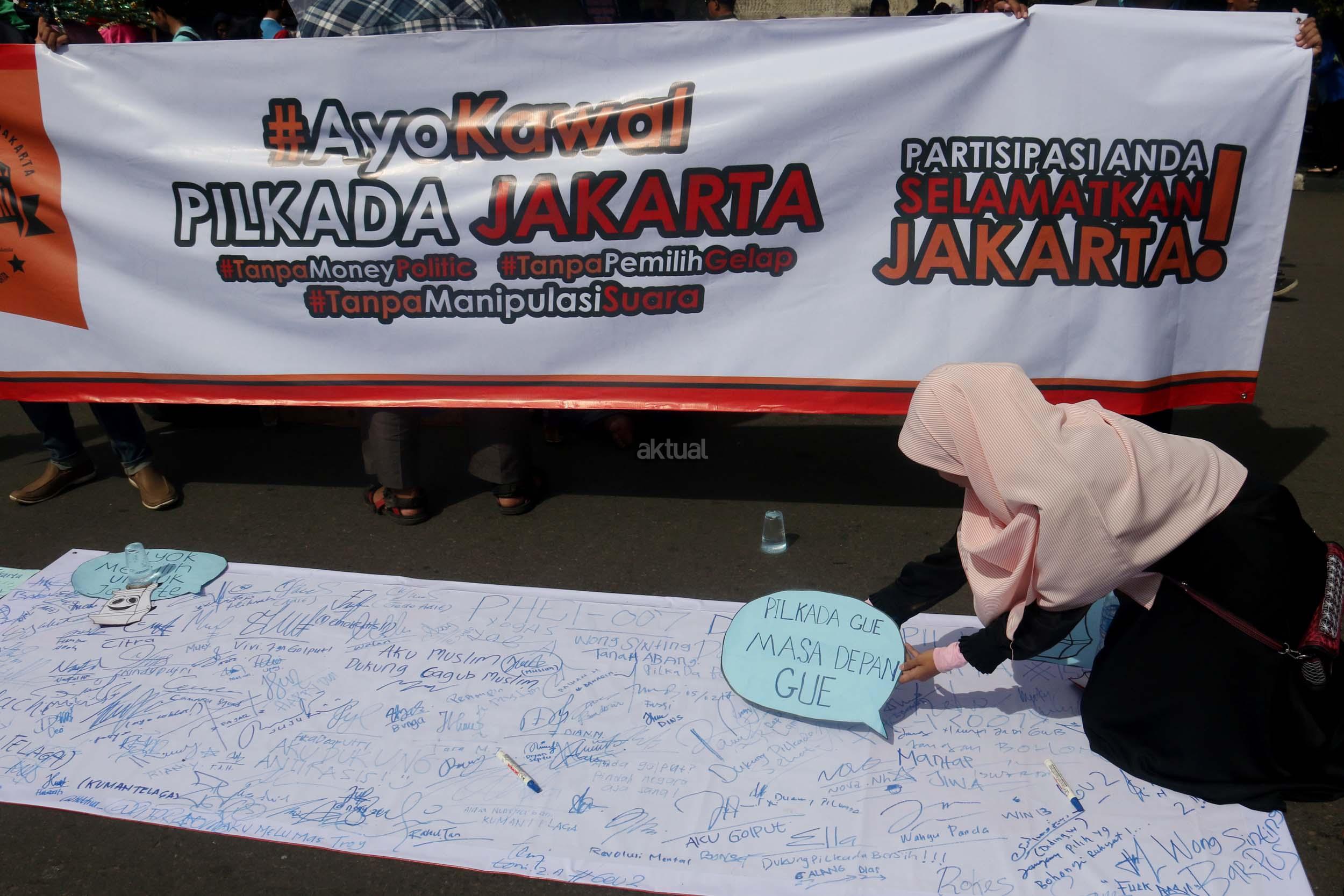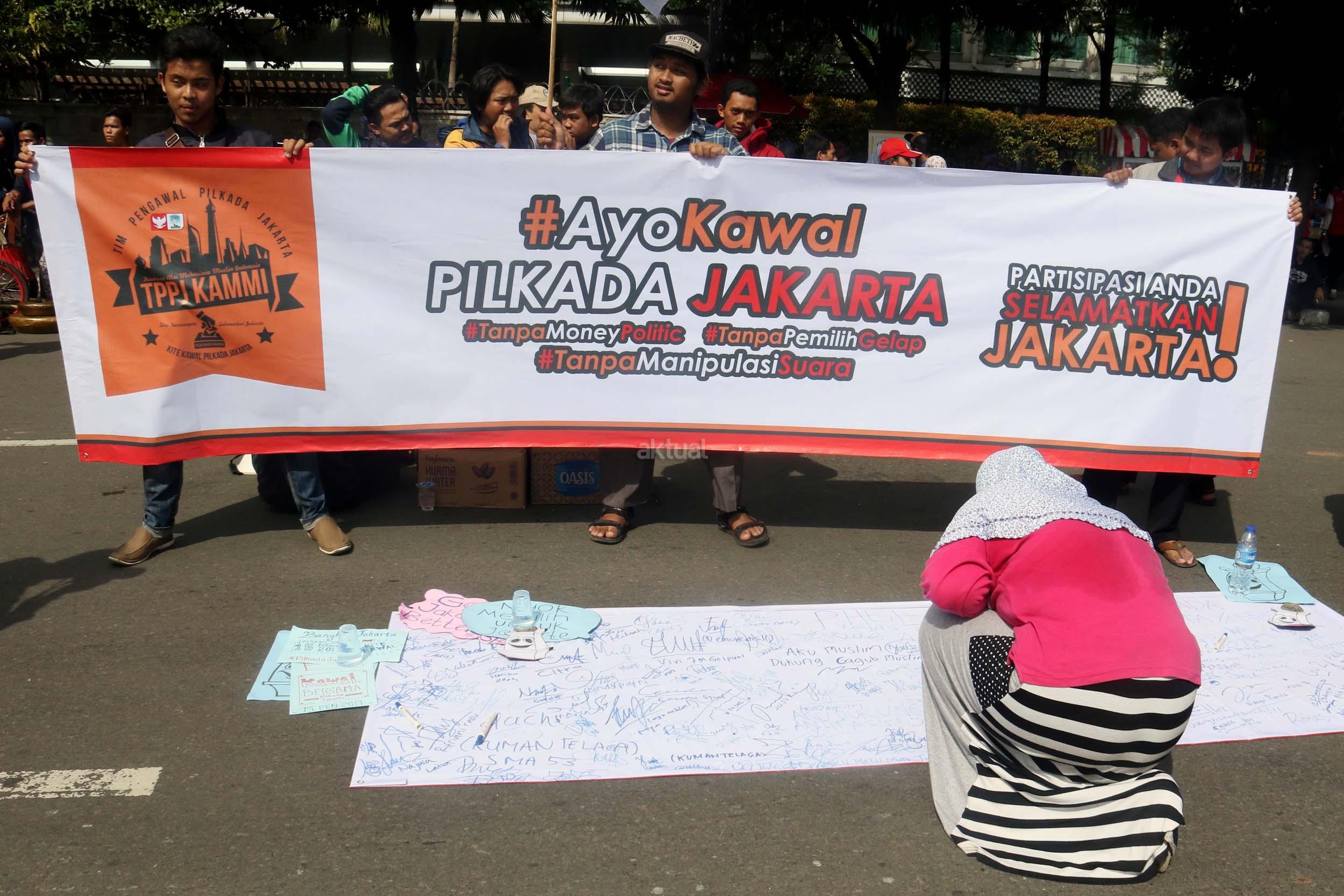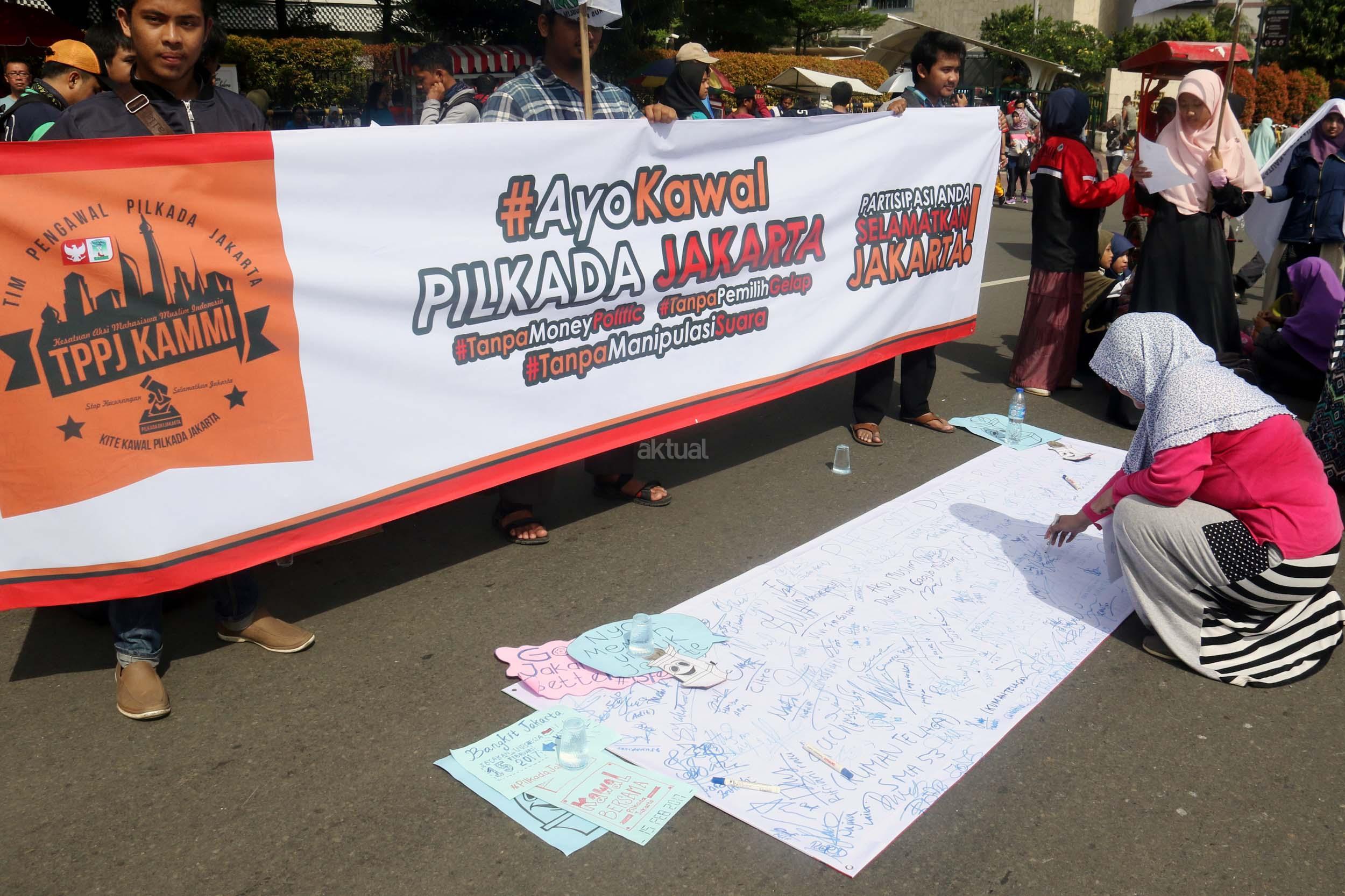 Sejumlah mahasiswa yang tergabung dalam Kesatuan Mahasiswa Muslim Indonesia (KAMMI) melakukan aksi kawal Pilkada DKI 2017 di Jakarta, Minggu (5/2/2017). Dalam aksi tersebut mereka mengajak masyarakat DKI mengawal Pilkada DKI. AKTUAL/Munzir