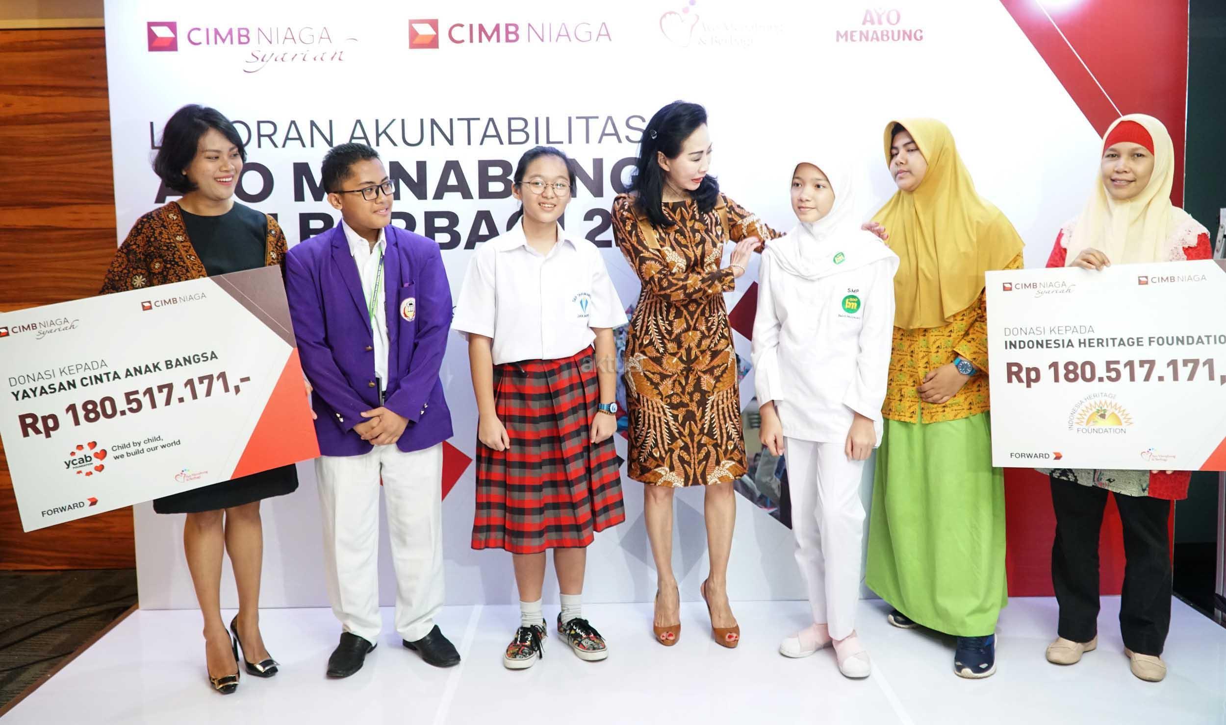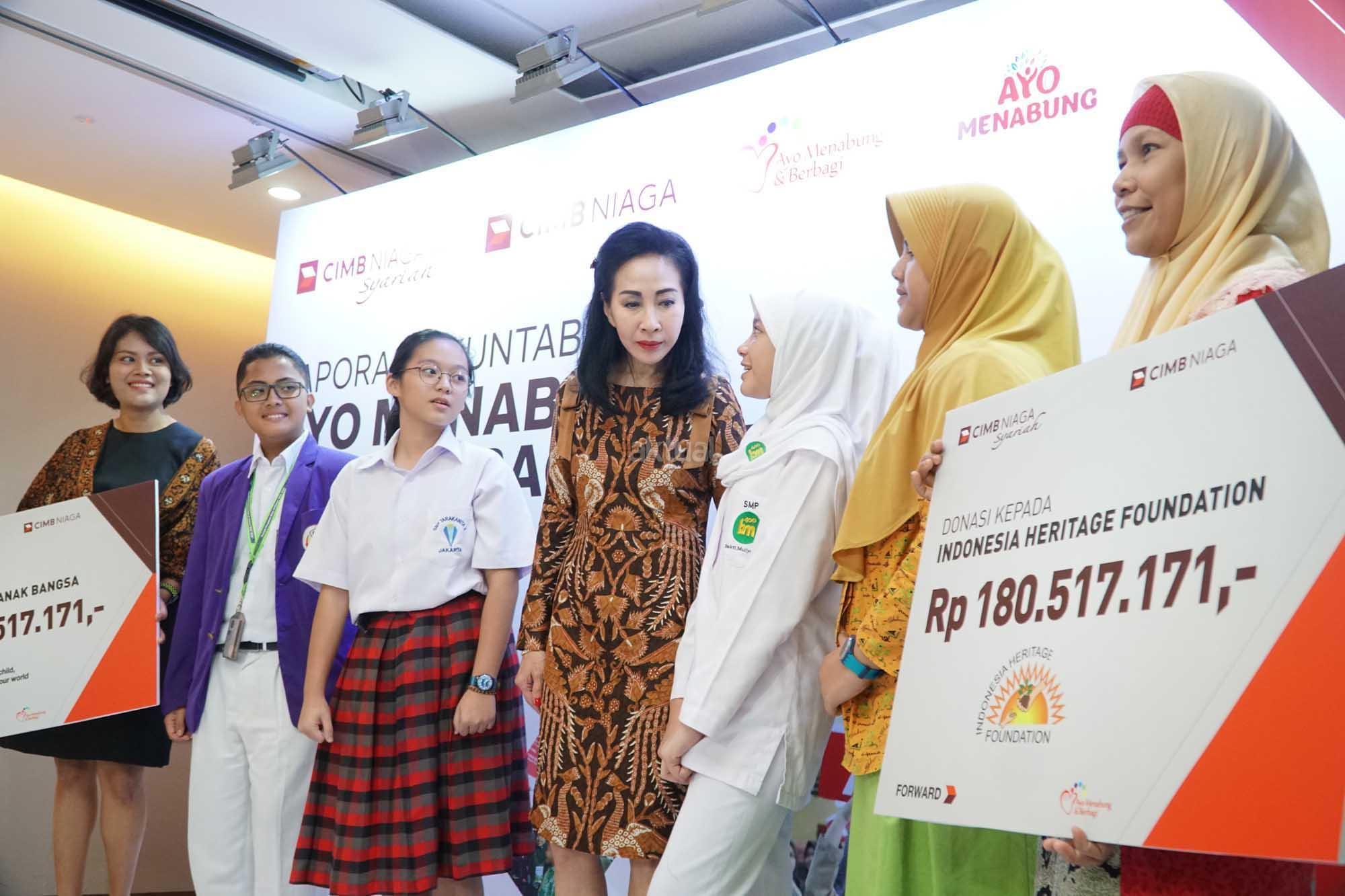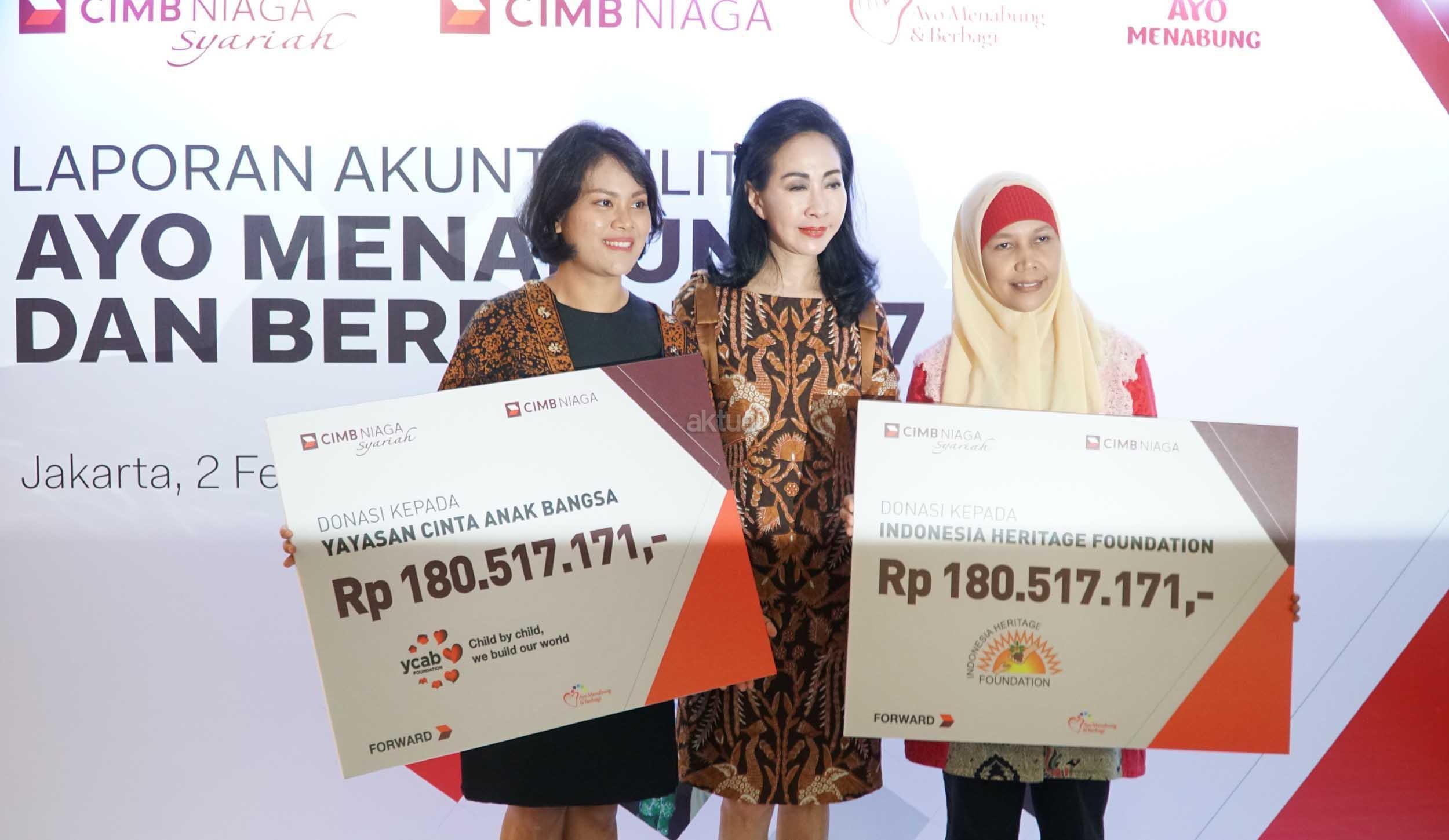 Direktur Compliance,Corporate Secretary and Legal CIMB Niaga, Fransiska Oei (kiri) menyerahkan secara simbolis donasi kepeda CFo Group Yayasan Cinta Anak Bangsa (YCAB), Stella Tambunan (kiri) dan Sekretaris Indonesia Heritage Foundation (IHF), Rahma Dona di Jakarta, Jumat (2/2). CIMB Niaga terus meningkatkan literasi keuangan masyarakat, khususnya bagi para siswa melalui Program Ayo Menabung dan Berbagi (AMDB).Dalam Akuntabilitas Program AMDB 2017, dilaporkan program ini telah memberikan edukasi perbankan kepada 5.630 siswa di 40 sekolah yang tersebar di 10 kota dan berhasil menghimpun dana Rp 361 Juta. Dana tersebut selanjutnya disalurkan melalui Indonesia Heritage Foundation dan Yayasan Cinta Anak Bangsa (YCAB) untuk meningkatkan kualitas pendidikan anak Indonesia. AKTUAL/Eko S Hilman