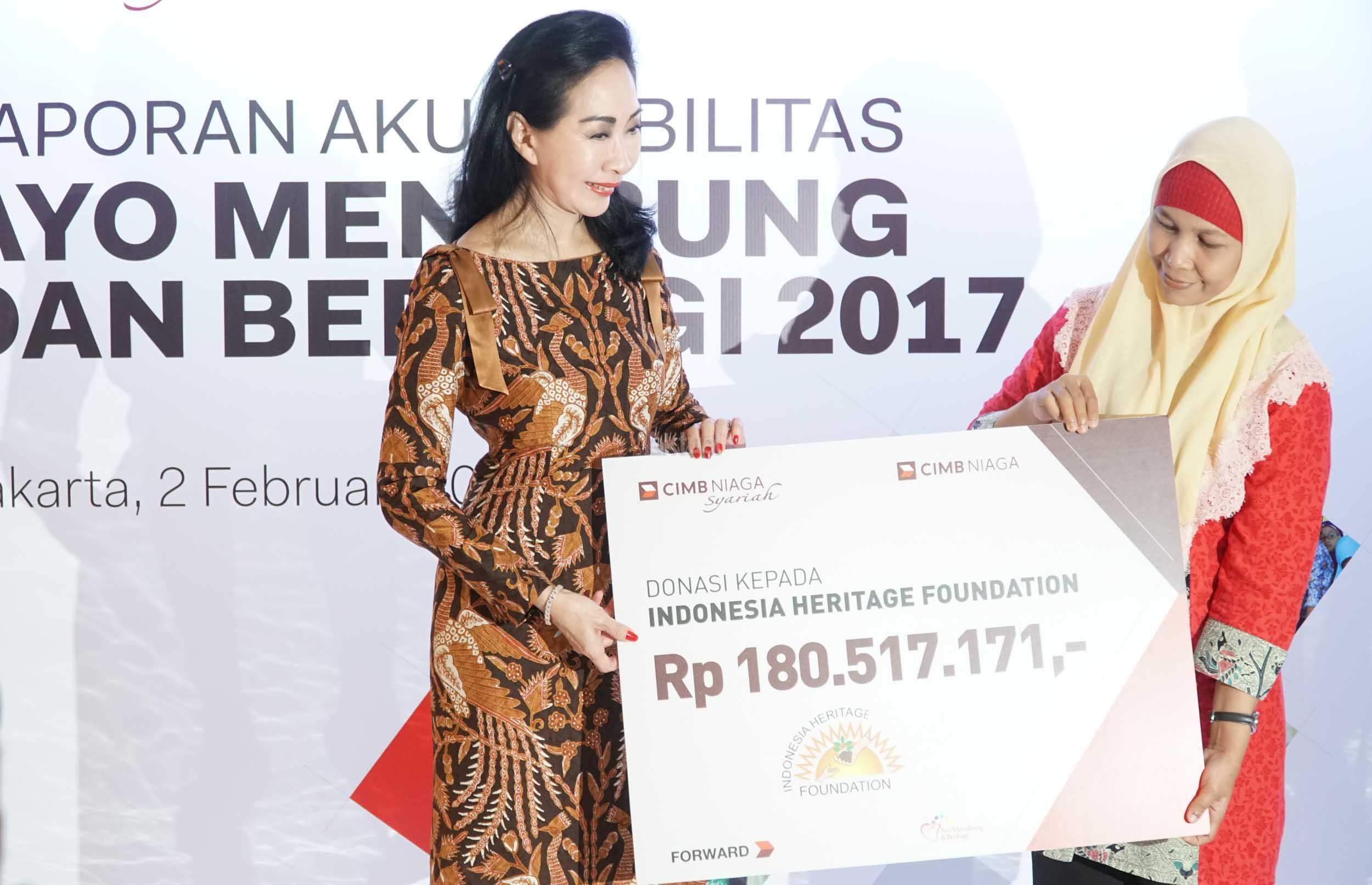 Direktur Compliance,Corporate Secretary and Legal CIMB Niaga, Fransiska Oei (kiri) menyerahkan secara simbolis donasi kepeda Sekretaris Indonesia Heritage Foundation (IHF), Rahma Dona di Jakarta, Jumat (2/2). CIMB Niaga terus meningkatkan literasi keuangan masyarakat, khususnya bagi para siswa melalui Program Ayo Menabung dan Berbagi (AMDB).Dalam Akuntabilitas Program AMDB 2017, dilaporkan program ini telah memberikan edukasi perbankan kepada 5.630 siswa di 40 sekolah yang tersebar di 10 kota dan berhasil menghimpun dana Rp 361 Juta. Dana tersebut selanjutnya disalurkan melalui Indonesia Heritage Foundation dan Yayasan Cinta Anak Bangsa (YCAB) untuk meningkatkan kualitas pendidikan anak Indonesia. AKTUAL/Eko S Hilman