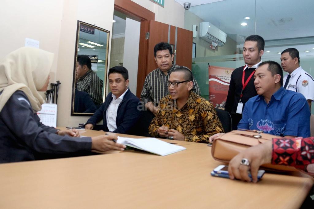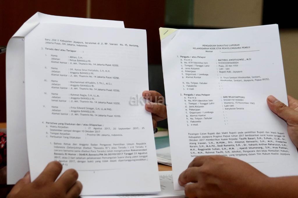 Badan Hukum (Bahu) Partai Nasdem bersama tim kuasa hukum pasangan calon Bupati dan Wakil Bupati Mathius-Giri Pilkada Jayapura mengadukan Bawaslu RI ke DKPP terkait Rekomendasi Bawaslu RI yang mendiskualifikasi Calon Bupati Mathius Awoitauw. AKTUAL/Munzir