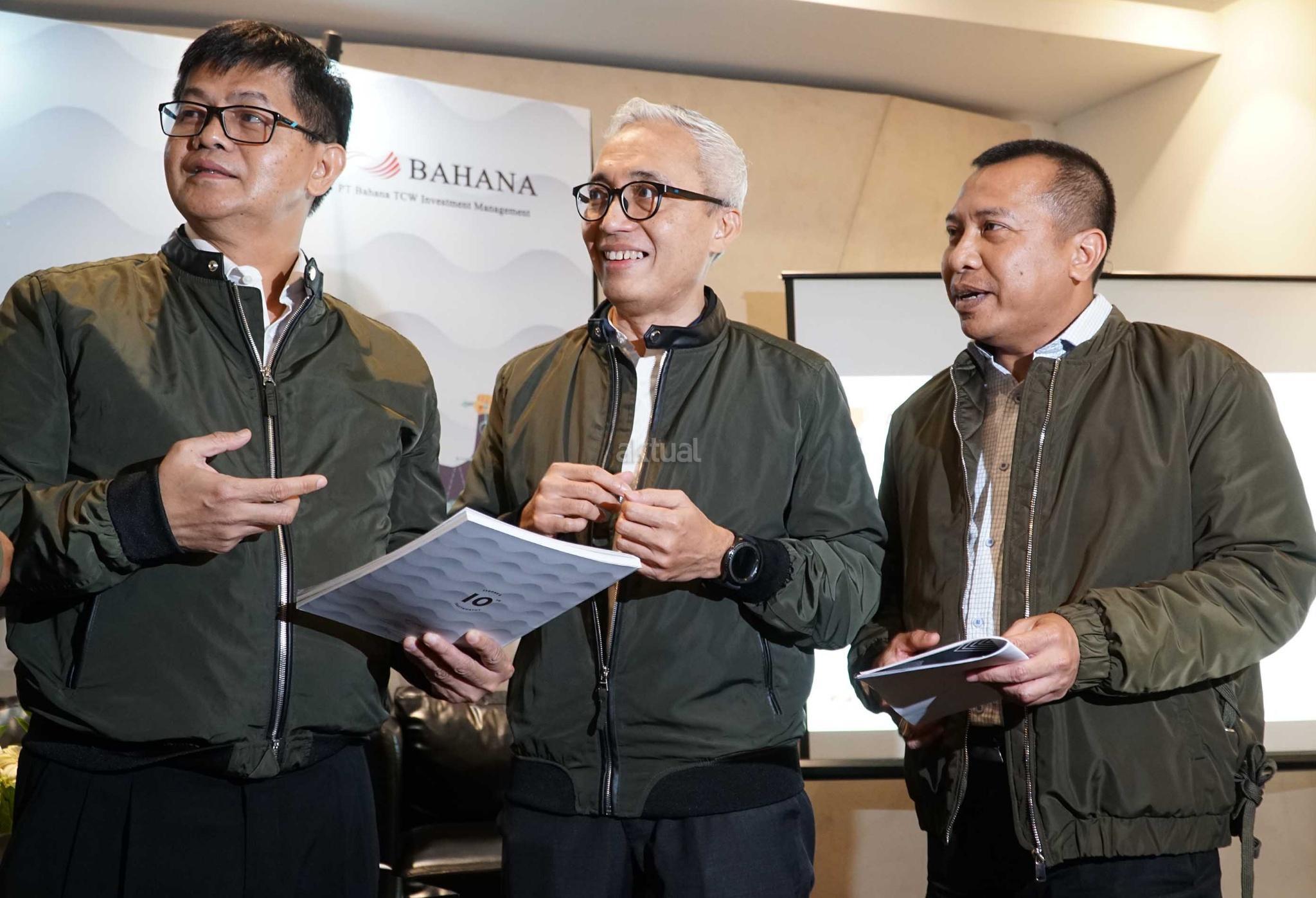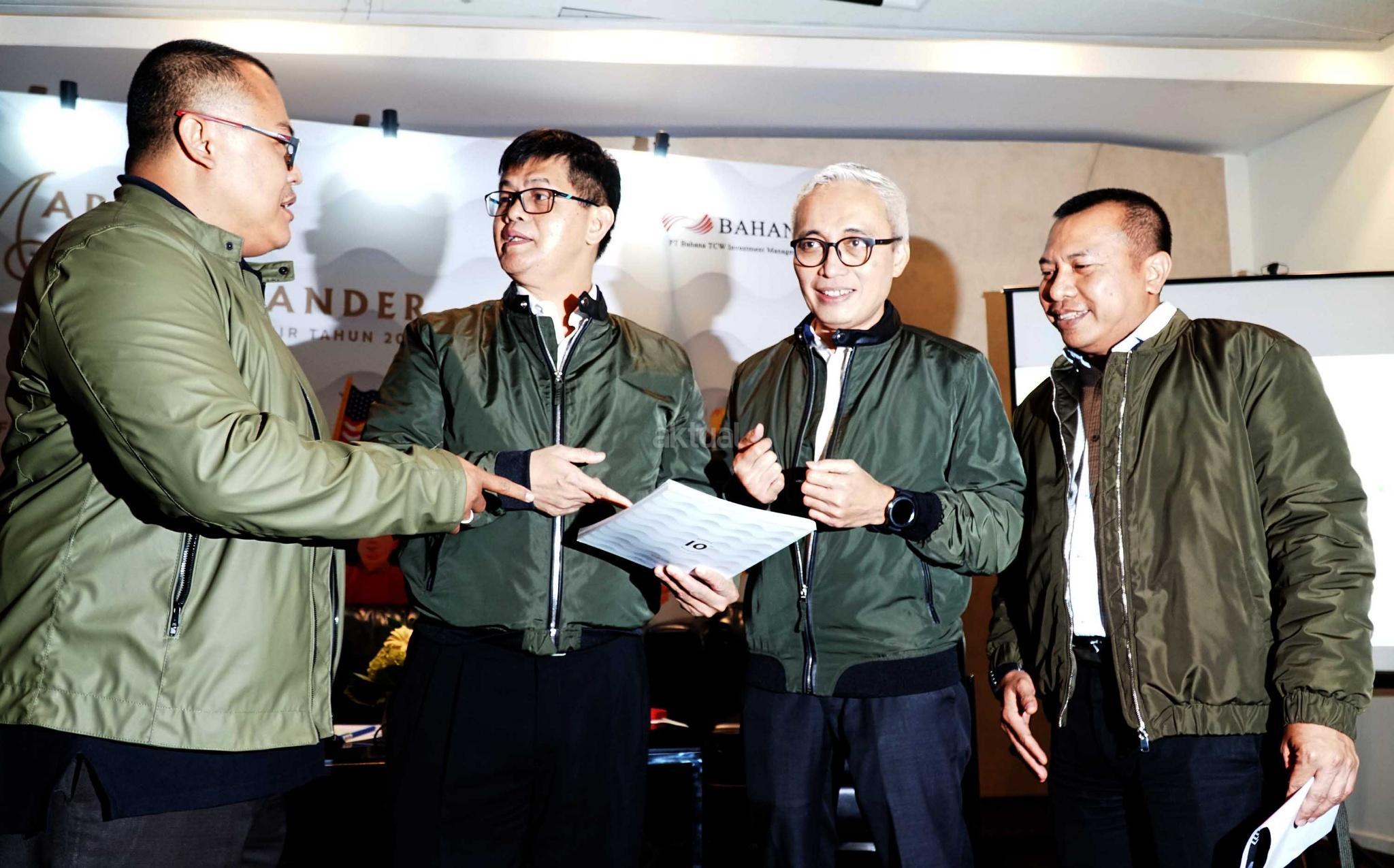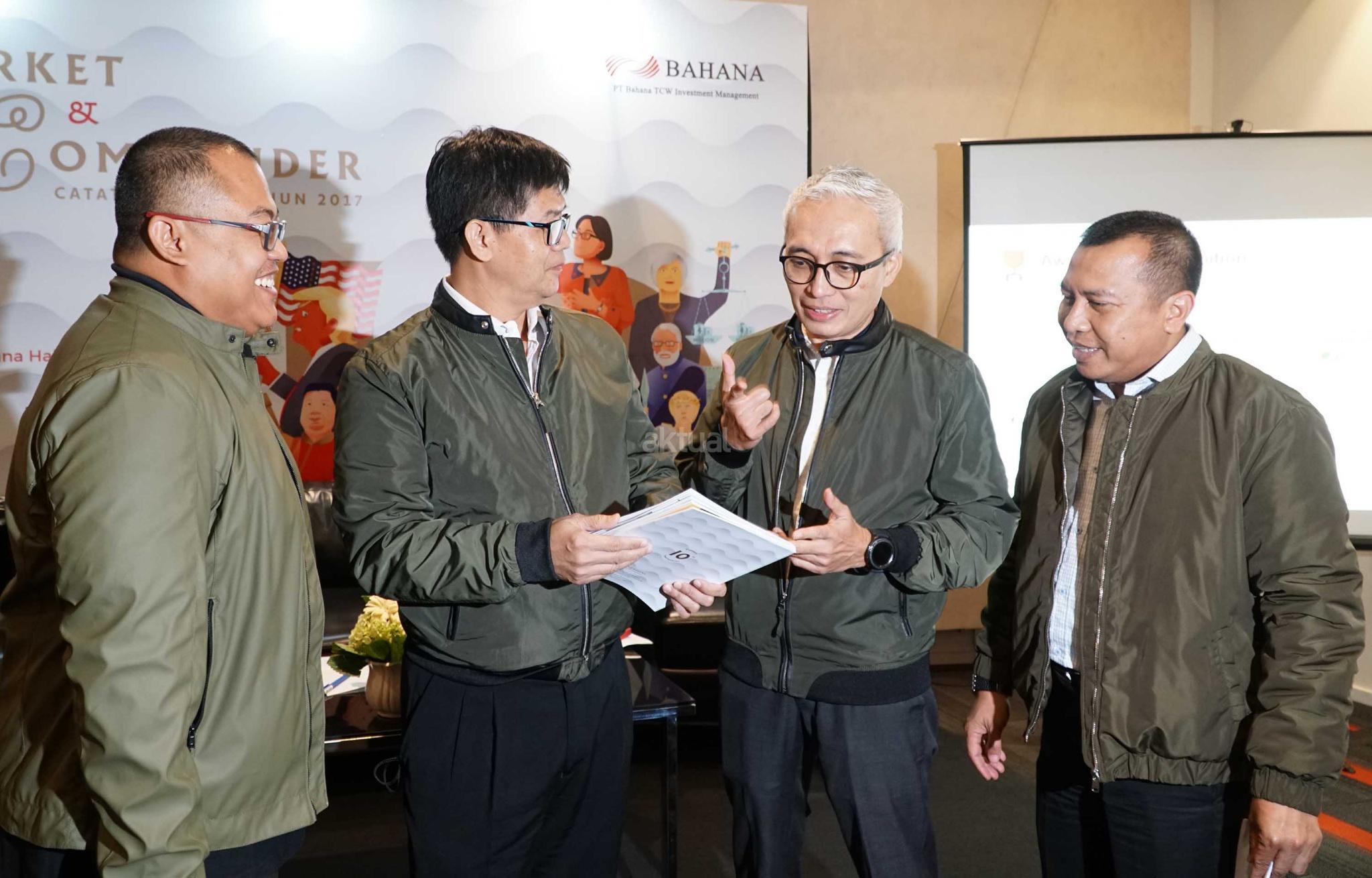 (dari kiri ke kanan) Corporate Communication & Media Relations PT Bahana Pembinaan Usaha Indonesia, I Gede Suhendra, Presiden Direktur Bahana TCW, Edward Lubis, Direktur Investor Relations & Chief Economist, Budi Hikmat, serta Head Of Corporate Communication and Media Relations Bahana Group, Dewa Agung Rudy berbincang disela jumpa pers Catatan akhir tahun 2017 dengan tema " market and Commander" di Jakarta, Rabu (17/1).Sepanjang tahun 2017 lalu, Bahana yang termasuk dalam tiga besar perusahaan manajer Investasi terbesar di Industri reksa dana Indonesia, telah membukukan total dana kelolaan sebesar Rp 48,2 triliun, dimana kontribusi terbesar berasal dari produk reksa dana pasar uang dan pendapatan tetap (obligasi). Bahana TCW juga optimis perkembangan industri reksa dana pada tahun 2018 akan lebih semarak dibandingkan tahun 2017.Salah satu faktor pendukungnya, antusiasnya investor retail mengenai produk investasi, terutama di reksa dana. Hingga akhir 2017 lalu, Bahana TCW telah bekerja sama dengan 11 bank sebagai agen distribusi,Dari total dana kelolaan pada tahun 2017 lalu, mayoritas dana berasal dari investor institusional. Kontribusinya mencapai 83,6%.Sedangkan, dari investor ritel masih sekitar 16,4%. AKTUAL/Eko S Himan