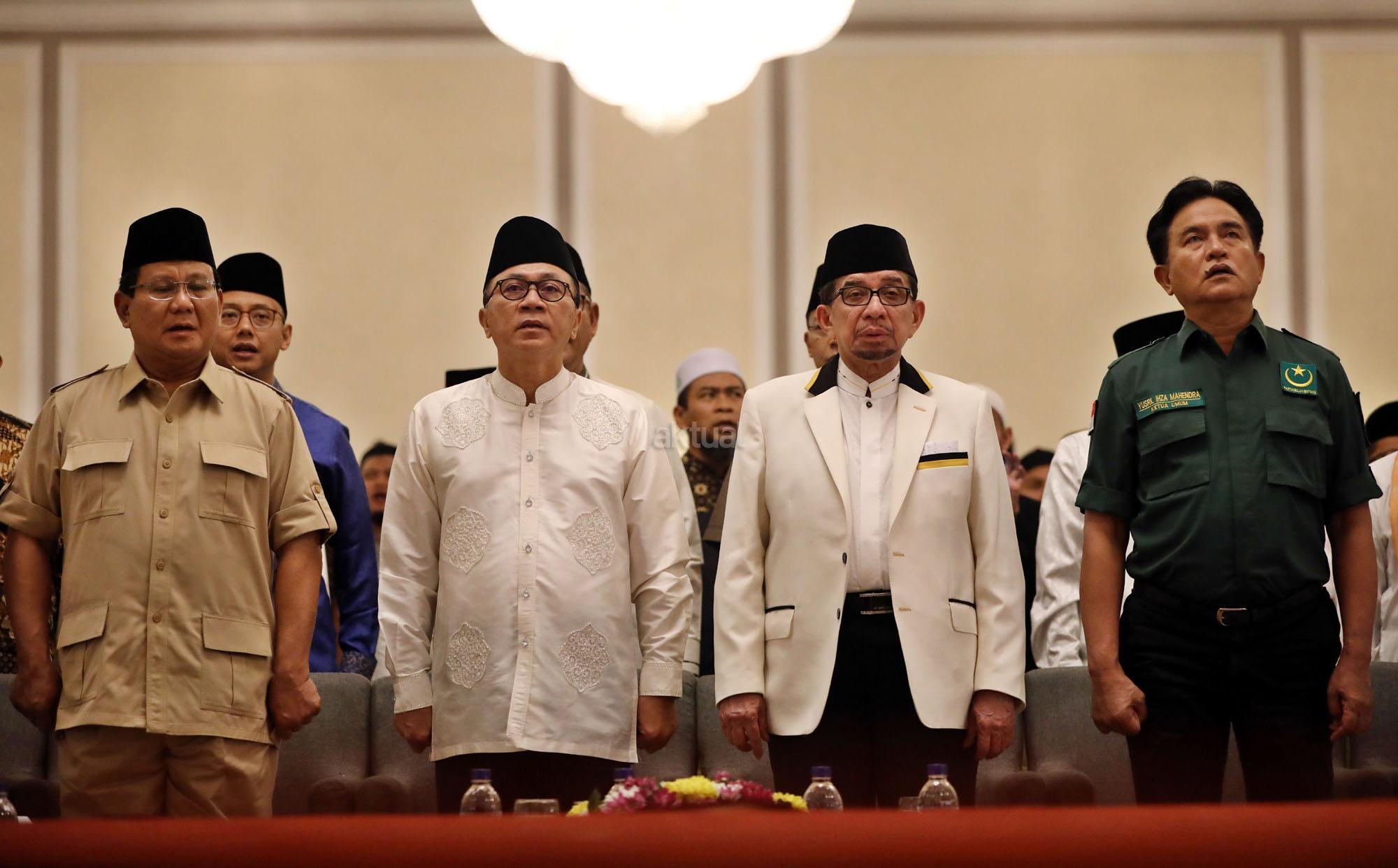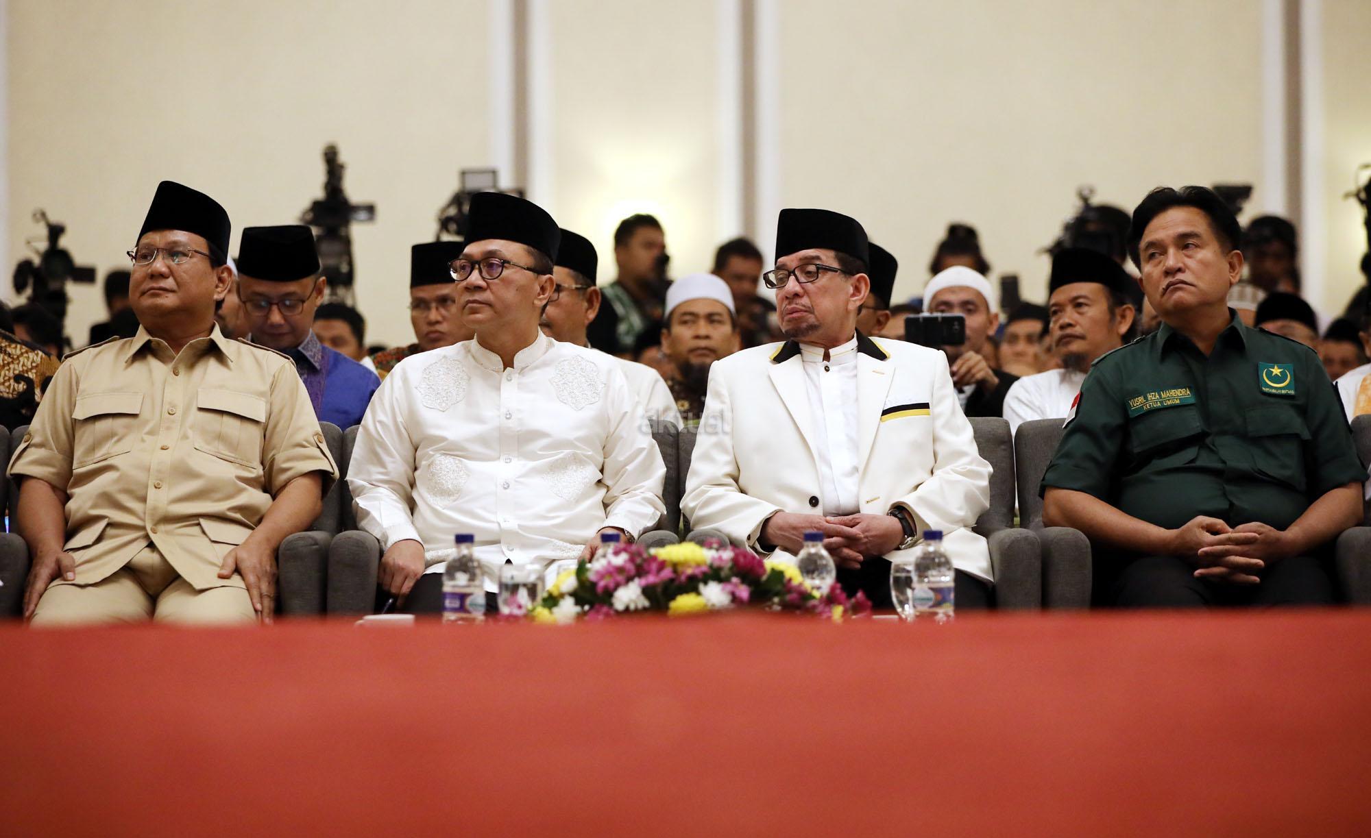 Ketua Umum Gerindra Prabowo Subianto (kiri), Ketua Majelis Syuro Partai Keadilan Sejahtera (PKS) Salim Segaf Al Jufri, Ketua Umum Partai Amanat Nasional (PAN) Zulkifli Hasan dan Ketua Umum Partai Bulan Bintang (PBB) Yusril Ihza Mahendra saat melakukan pertemuan Hotel Paninsula, Jakarta, Jumat (27/7/2018) malam. Partai Gerindra terus menjajaki komunikasi intensif dengan sejumlah partai untuk membicarakan masalah pemilihan Presiden 2019. Pertemuan tersebut membahasa mengenai pasangan Capres serta cawapres yang akan diusung. AKTUAL/Tino Oktaviano