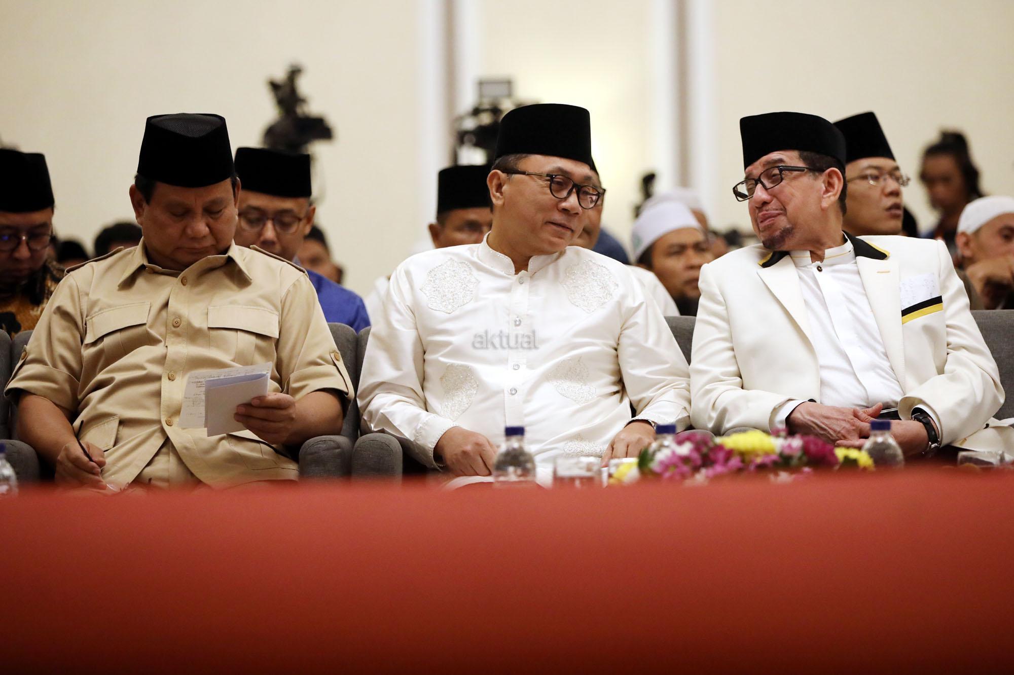 Ketua Umum Gerindra Prabowo Subianto (kiri), Ketua Majelis Syuro Partai Keadilan Sejahtera (PKS) Salim Segaf Al Jufri, Ketua Umum Partai Amanat Nasional (PAN) Zulkifli Hasan saat melakukan pertemuan Hotel Paninsula, Jakarta, Jumat (27/7/2018) malam. Partai Gerindra terus menjajaki komunikasi intensif dengan sejumlah partai untuk membicarakan masalah pemilihan Presiden 2019. Pertemuan tersebut membahasa mengenai pasangan Capres serta cawapres yang akan diusung. AKTUAL/Tino Oktaviano