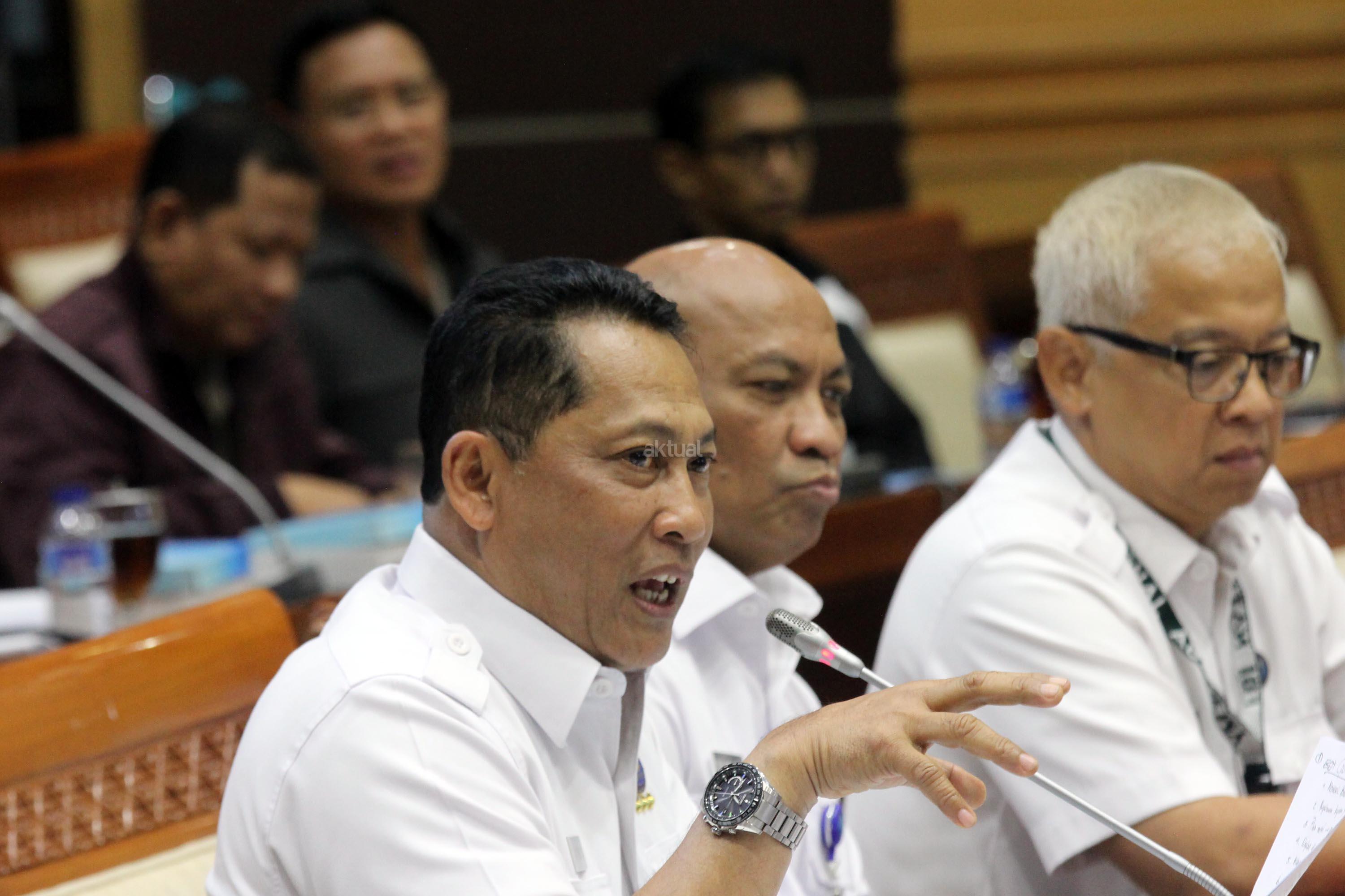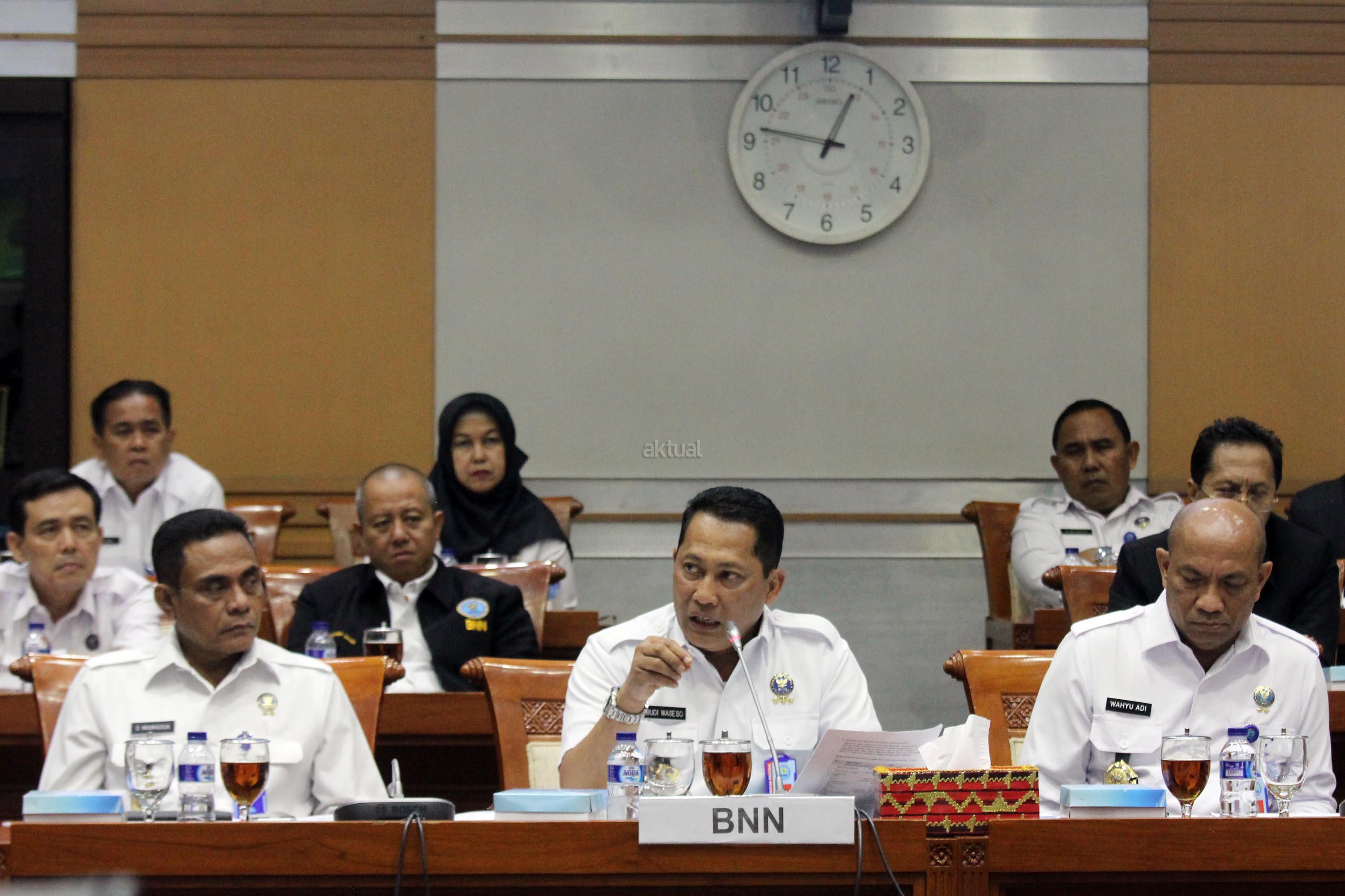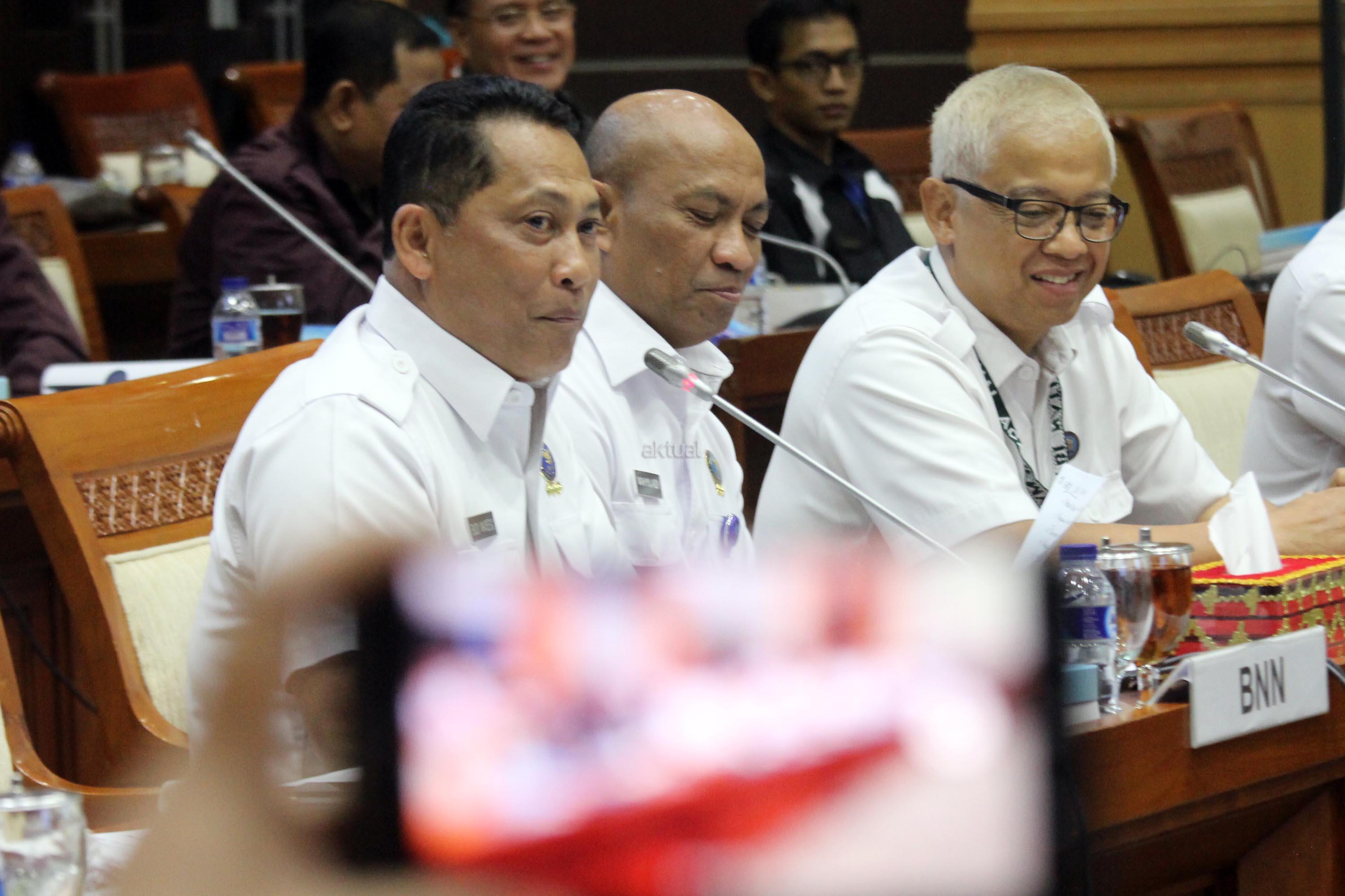 Kepala Bdan Narkitika Nasional (BNN) Komjen Polisi Budi Waseso (tengah) didampingi sejumlah petinggi BNN, mengikuti Rapat Dengar Pendapat dengan Komisi III DPR di Gedung Nusantara II, Kompleks Parlemen Senayan, Jakarta, Selasa (6/2). Rapat tersebut membahas evaluasi kinerja pencegahan dan pemberantasan Narkotika oleh BNN selama 2017 serta arah kebijakan BNN pada tahun 2018. AKTUAL/Tino Oktaviano