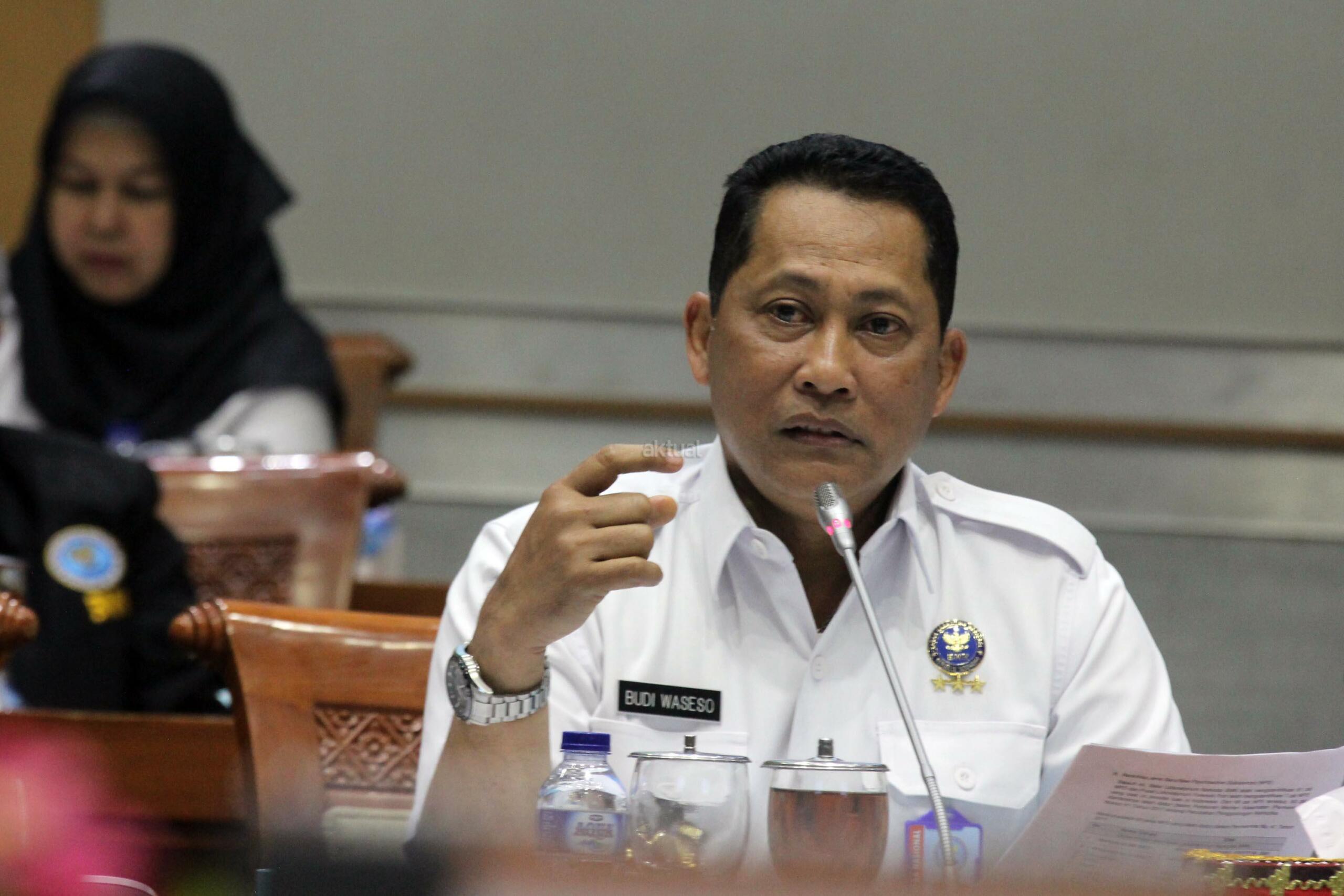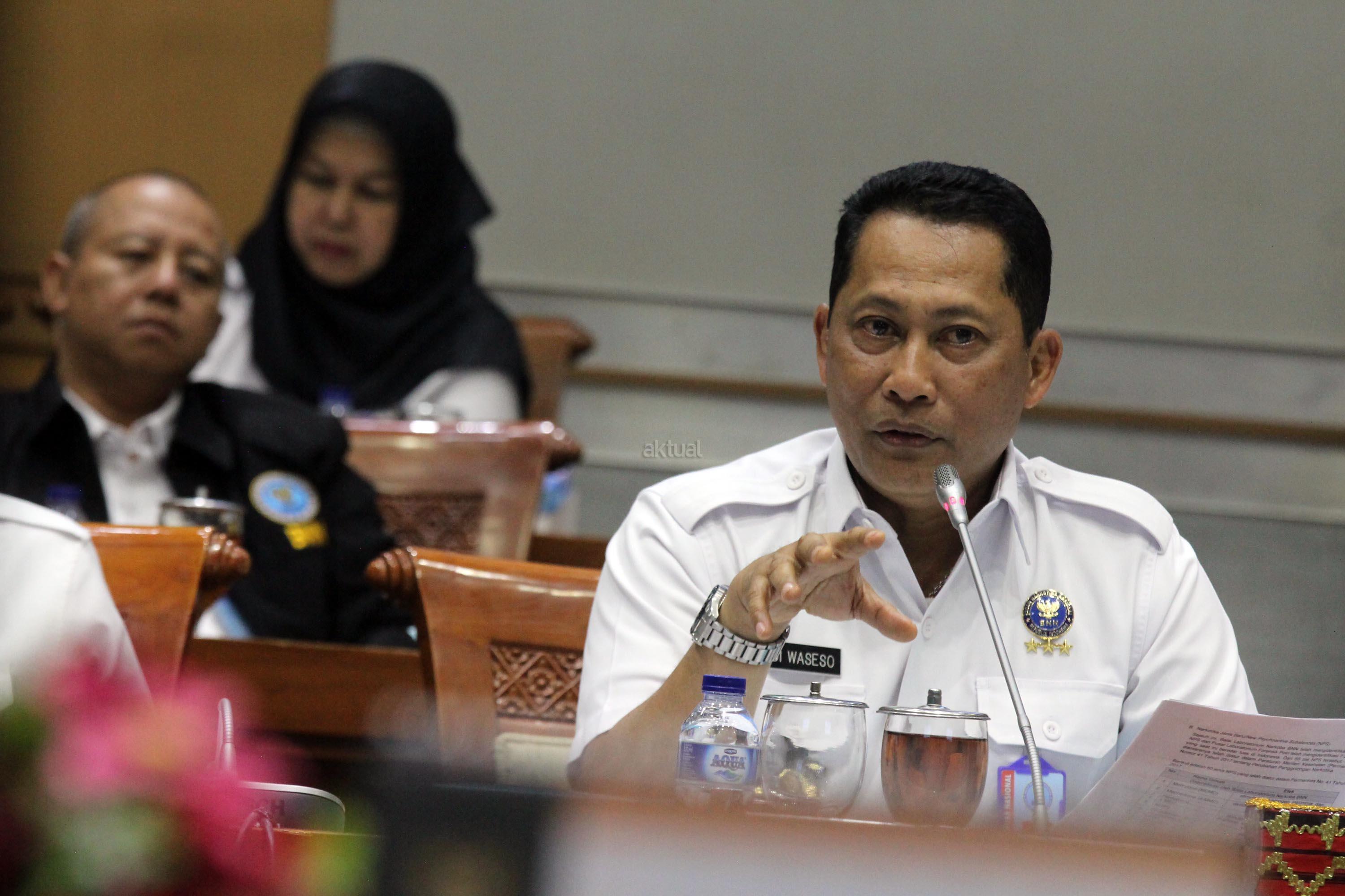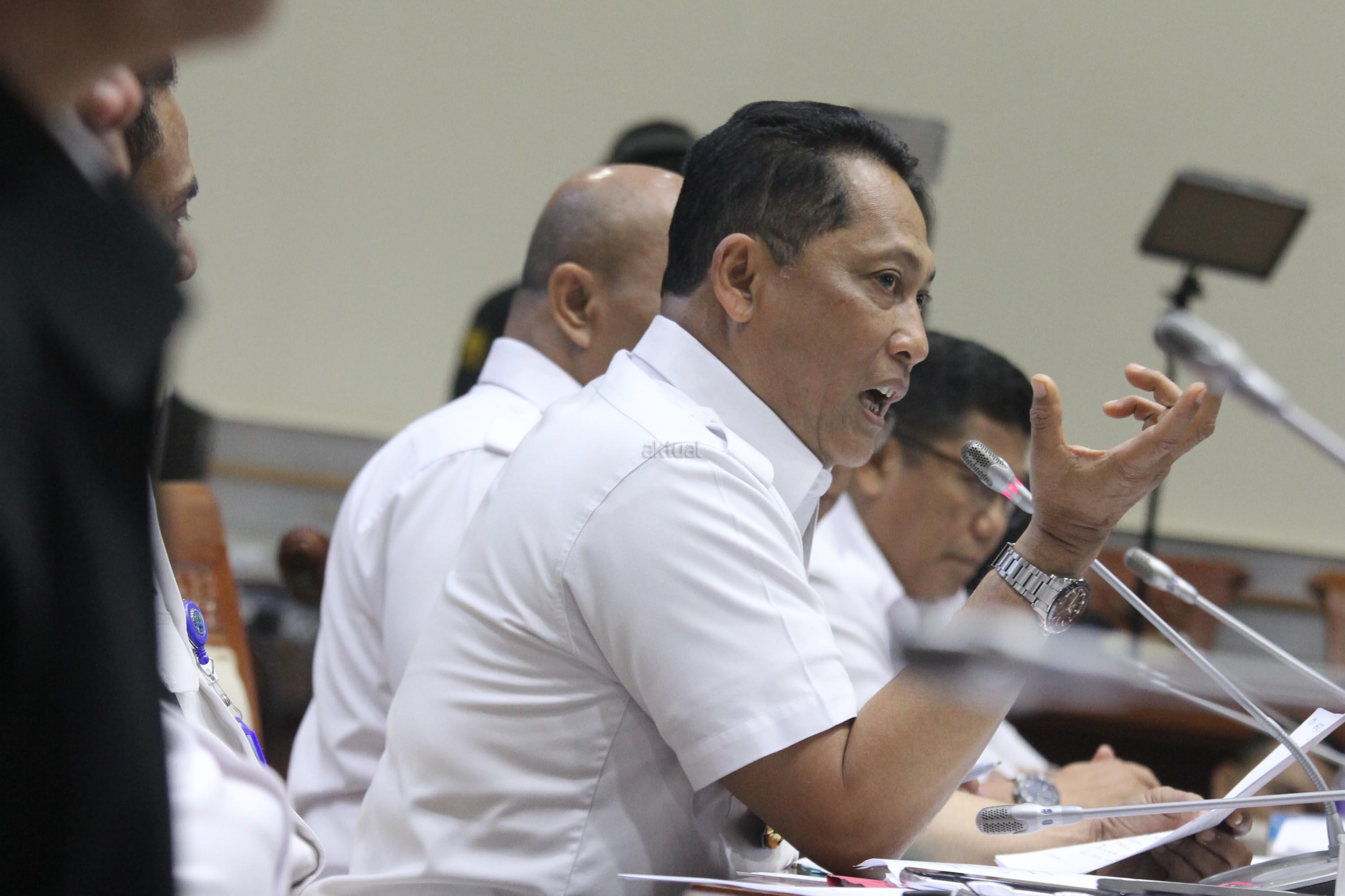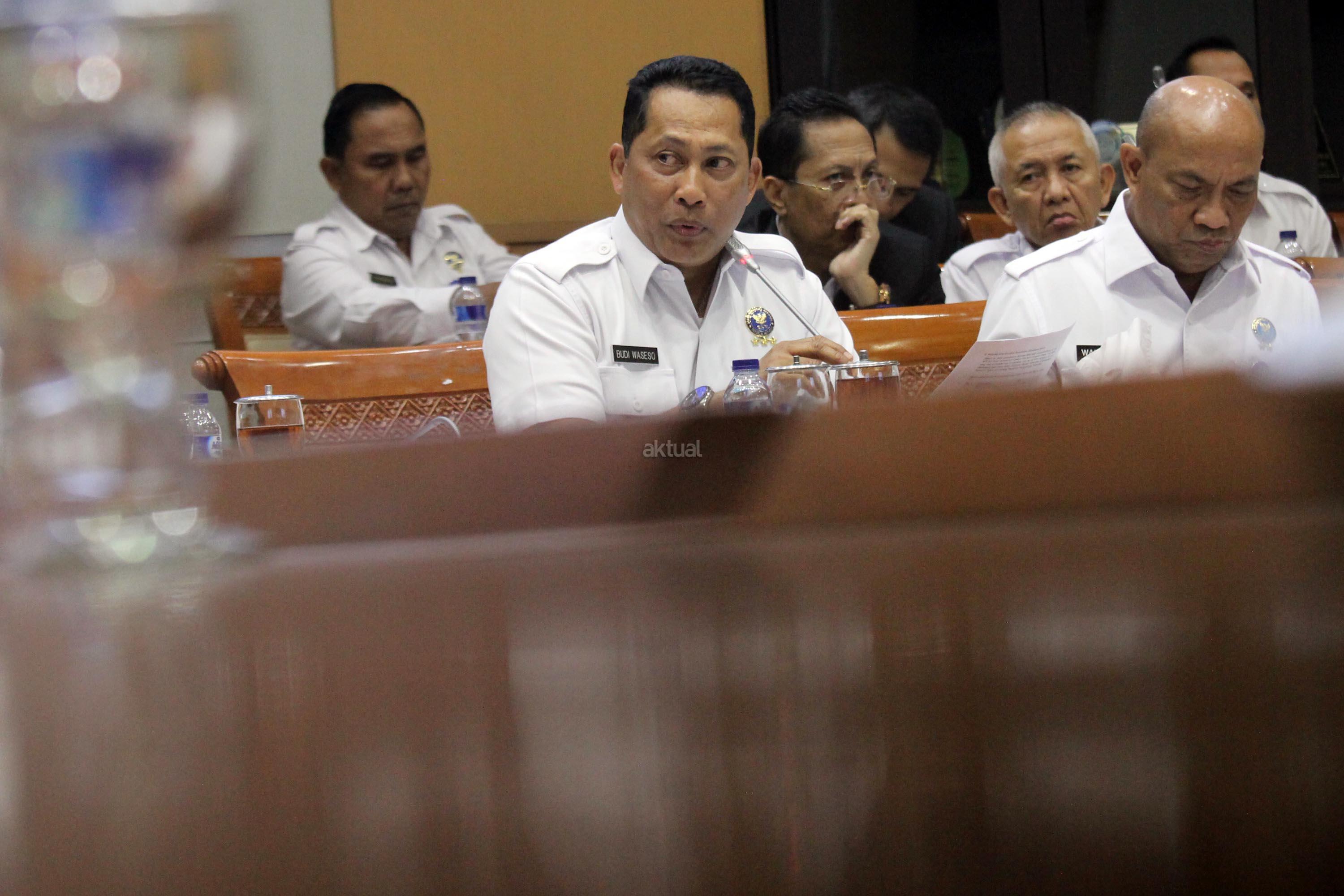 Kepala Bdan Narkitika Nasional (BNN) Komjen Polisi Budi Waseso (tengah) didampingi sejumlah petinggi BNN, mengikuti Rapat Dengar Pendapat dengan Komisi III DPR di Gedung Nusantara II, Kompleks Parlemen Senayan, Jakarta, Selasa (6/2). Rapat tersebut membahas evaluasi kinerja pencegahan dan pemberantasan Narkotika oleh BNN selama 2017 serta arah kebijakan BNN pada tahun 2018. AKTUAL/Tino Oktaviano