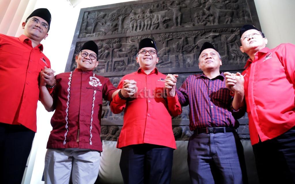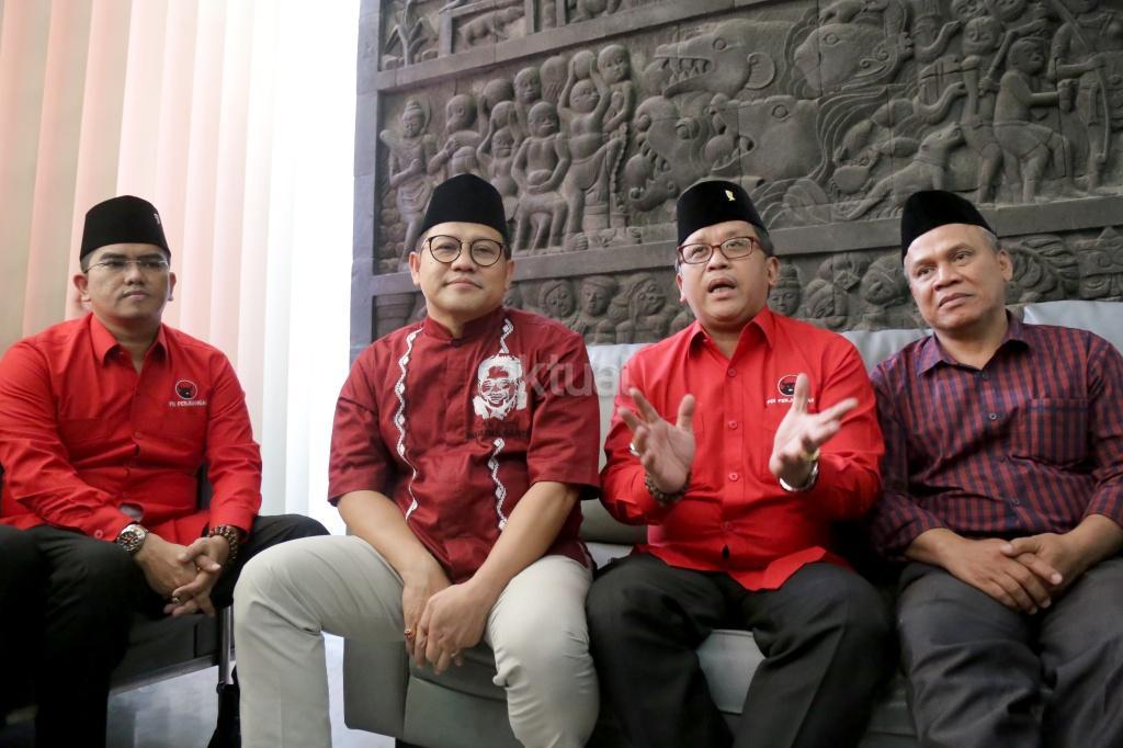Sekjen PDI Perjuangan Hasto Kristiyanto berbincang dengan Ketua Umum Partai Kebangkitan Bangsa (PKB) Muhaimin Iskandar usai pertemuan tertutup di kantor PKB, Jakarta, Selasa (10/4/18). Dalam pertemuan tersebut salah satunya yang dibicarakan soal pencalonan wakil presiden Muhaimin Iskandar untuk mendampingi Joko Widodo dalam pilpres 2019. AKTUAL/Tino Oktaviano