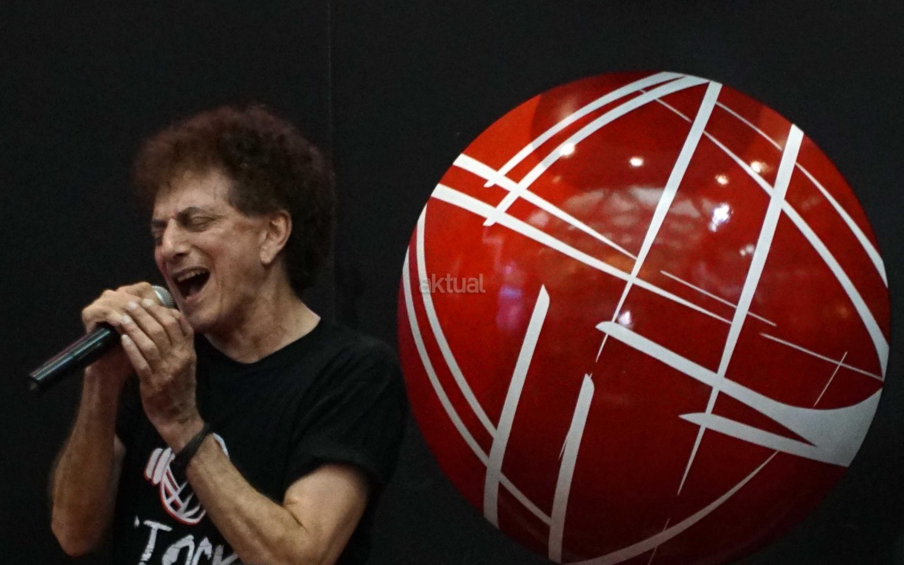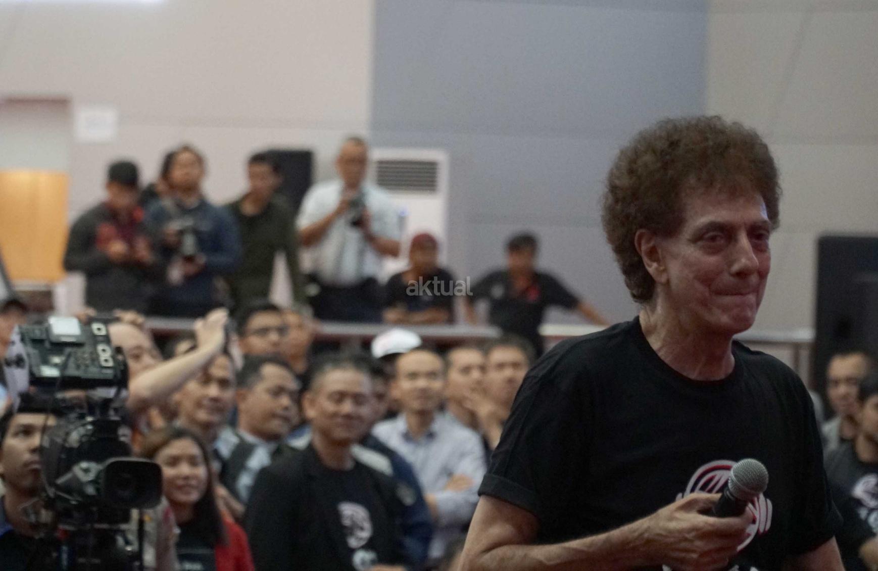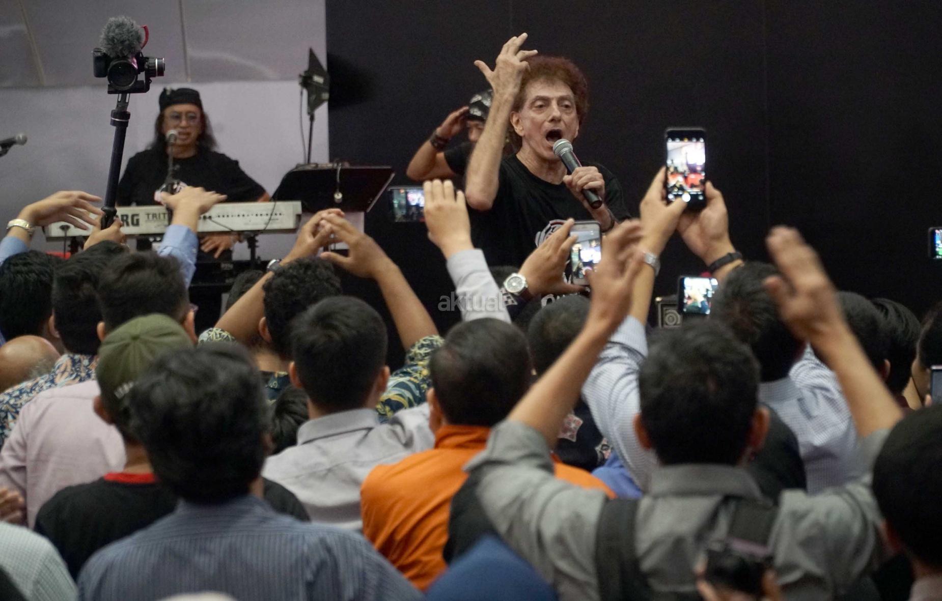 Vokalis grup musik rock legendaris, God Bless, Achmad Albar saat tampil membawakan lagu di Main Hall Bursa Efek Indonesia,Jakarta, Rabu (31/1). Konser God Bless yang dikemas dalam Stock Sound Concert dimulai usai melakukan penutupan perdagangan sesi II. Sebagai informasi, God Bless adalah grup musik rock yang telah menjadi legenda di Indonesia. Dasawarsa 1970-an bisa dianggap sebagai tahun-tahun kejayaan mereka. AKTUAL/Eko S Hilman
