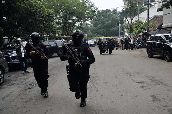 Anggota Brimob berjaga di kawasan Astanaanyar, Bandung, Jawa Barat, Rabu (7/12/2022). Penjagaan ketat tersebut akibat adanya ledakan yang diduga bom bunuh diri di Kantor Polsek Astanaanyar, Kota Bandung. ANTARA FOTO/Raisan Al Farisi/agr/aww.