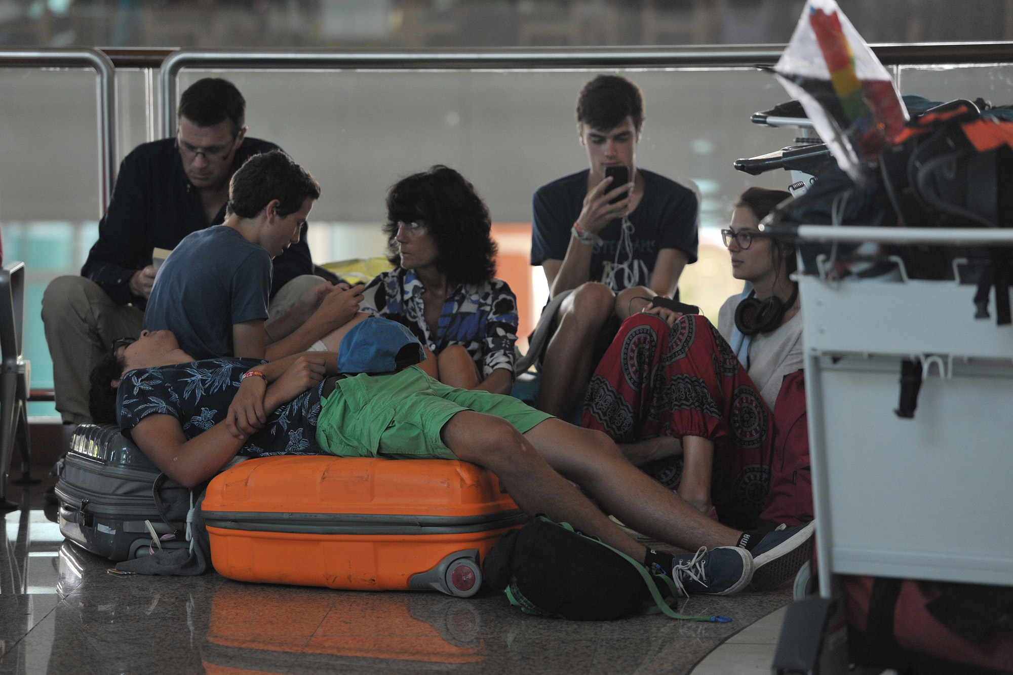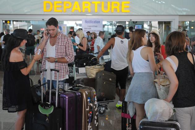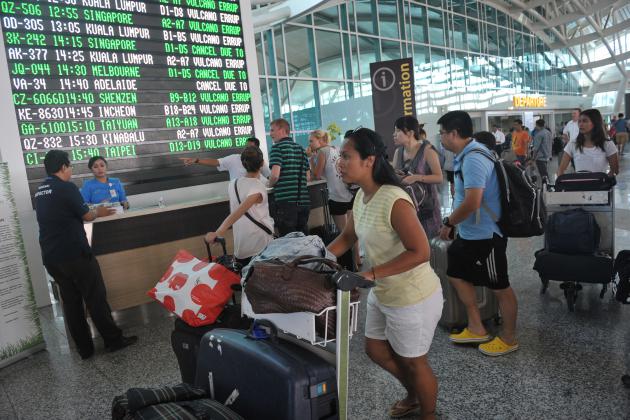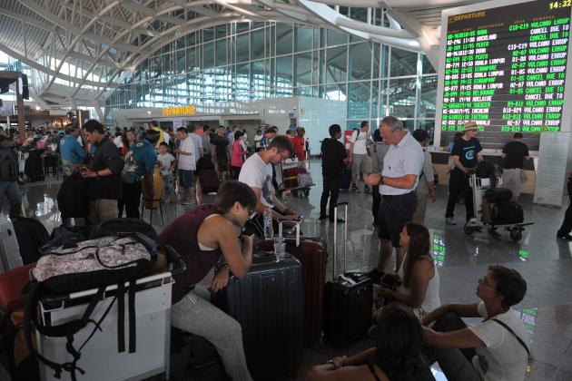 Sejumlah warga negara asing menunggu kejelasan penerbangannya di Terminal Internasional Bandara Ngurah Rai, Denpasar, Kamis (6/8). Bandara Ngurah Rai kembali menutup aktivitas semua penerbangan pada Kamis (6/8) mulai pukul 12.00 WITA karena peningkatan gangguan debu vulkanik Gunung Raung. ANTARA FOTO/Nyoman Budhiana/aww/15.