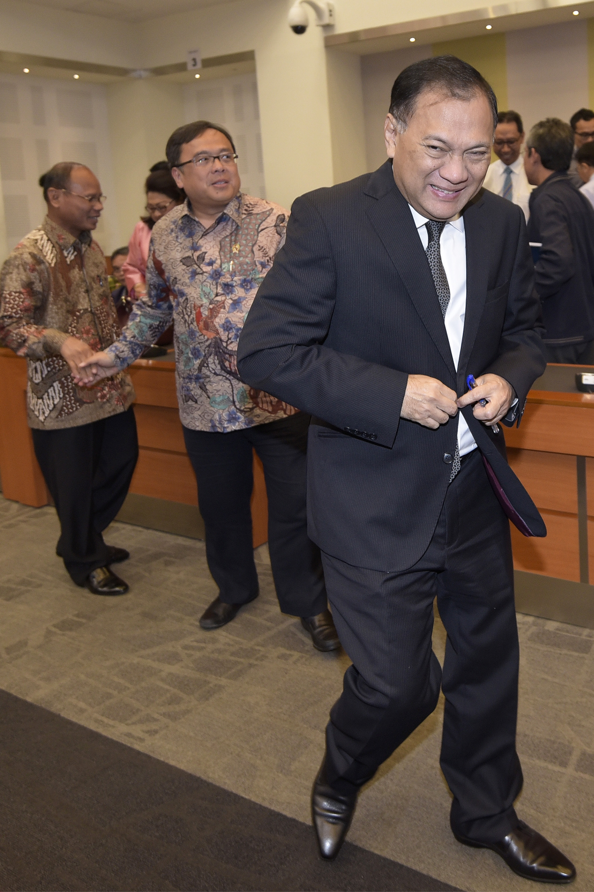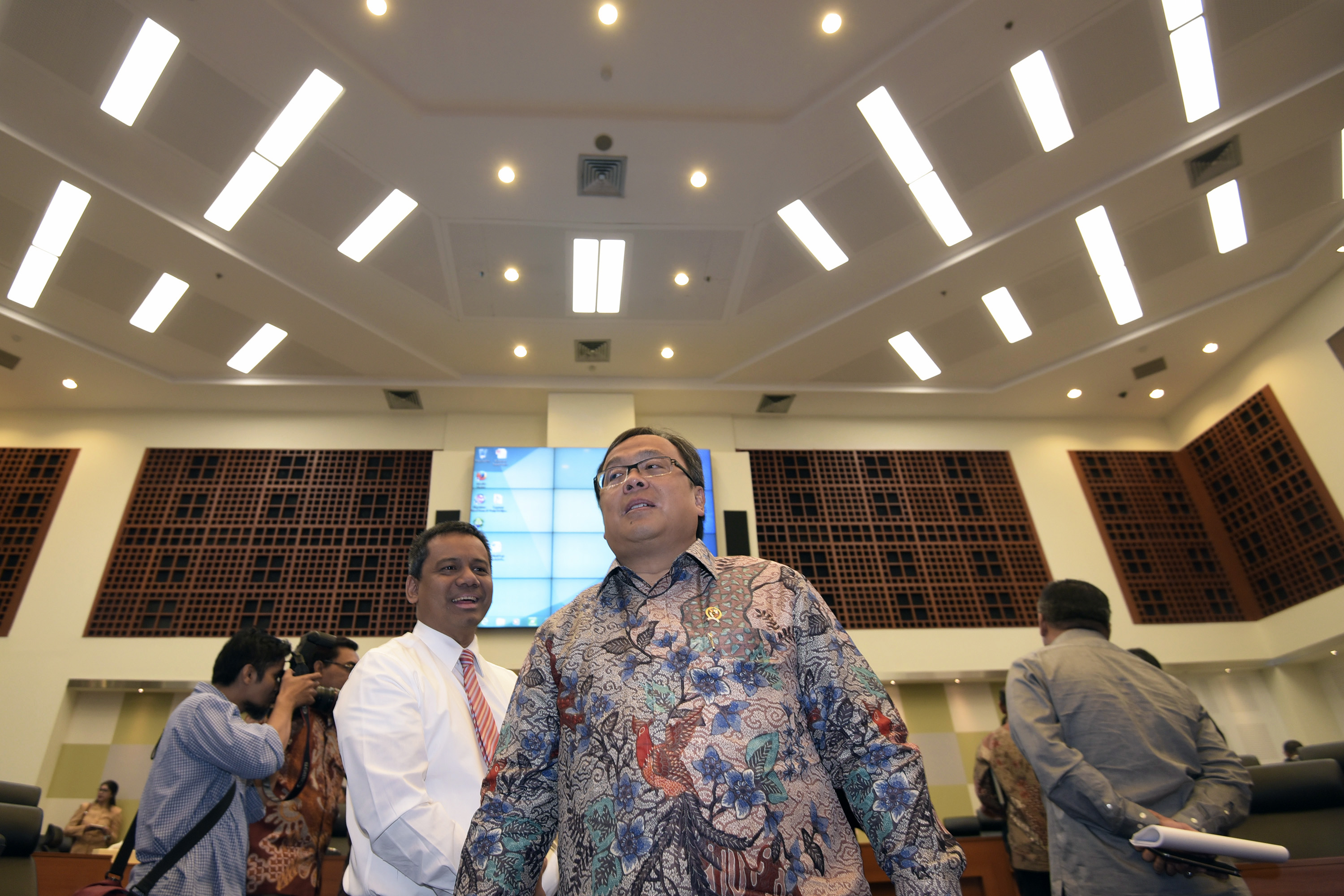 Menkeu Bambang Brodjonegoro (kedua kanan) meninggalkan ruangan usai mengikuti rapat kerja dengan Badan Anggaran (Banggar) DPR di Kompleks Parlemen, Senayan, Jakarta, Senin (6/7). Dalam rapat tersebut Banggar DPR menyepakati laporan dan memberikan pengesahan hasil panitia kerja (panja) dalam rangka pembahasan pembicaraan pendahuluan penyusunan RAPBN 2016. ANTARA FOTO/Sigid Kurniawan/nz/15.